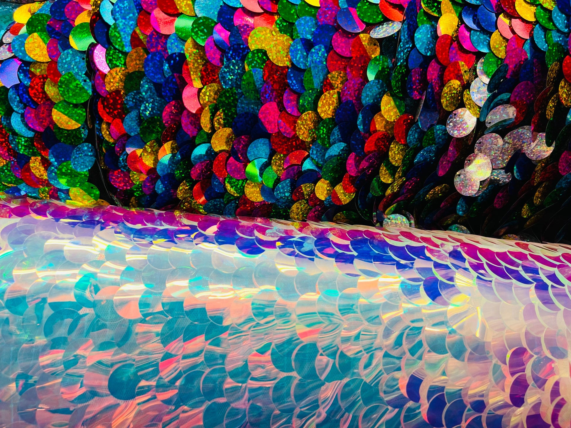 Paillette circle iridescent and multi sequins on stretch mesh base. Sold by the yd ships worldwide from Los Angeles CA