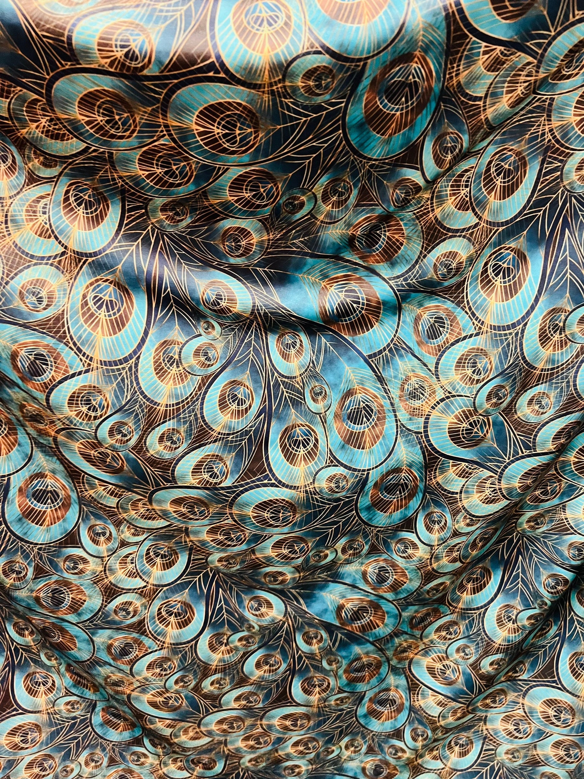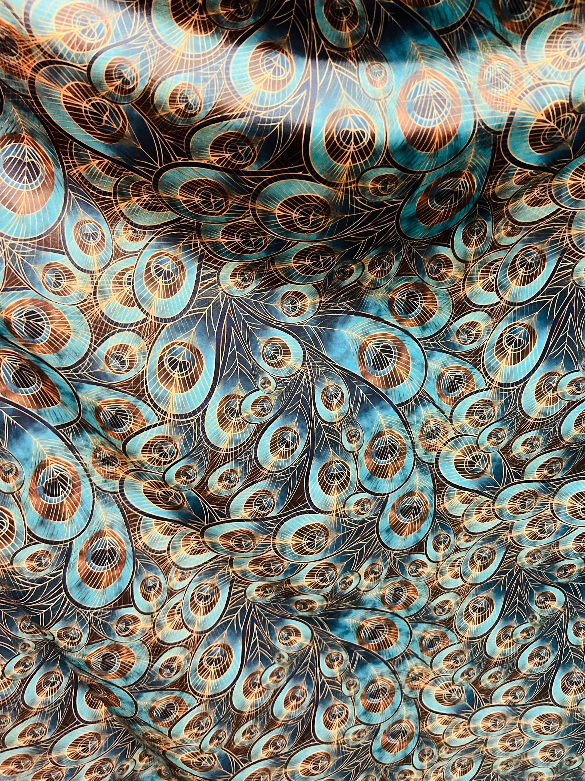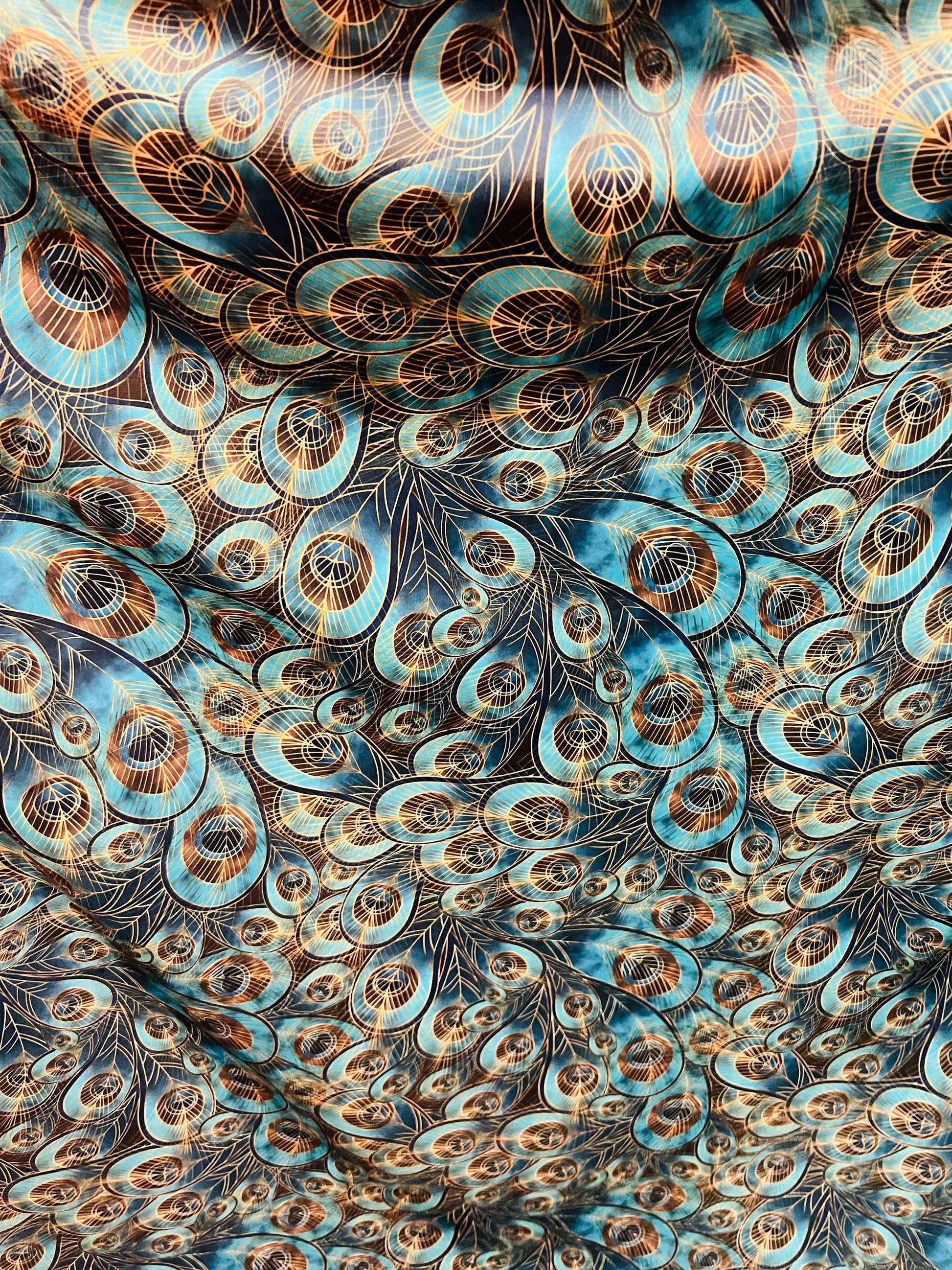 Peacock design New print in stock Teal blue/Gold print on great quality of nylon spandex 4-way stretch 58/60”