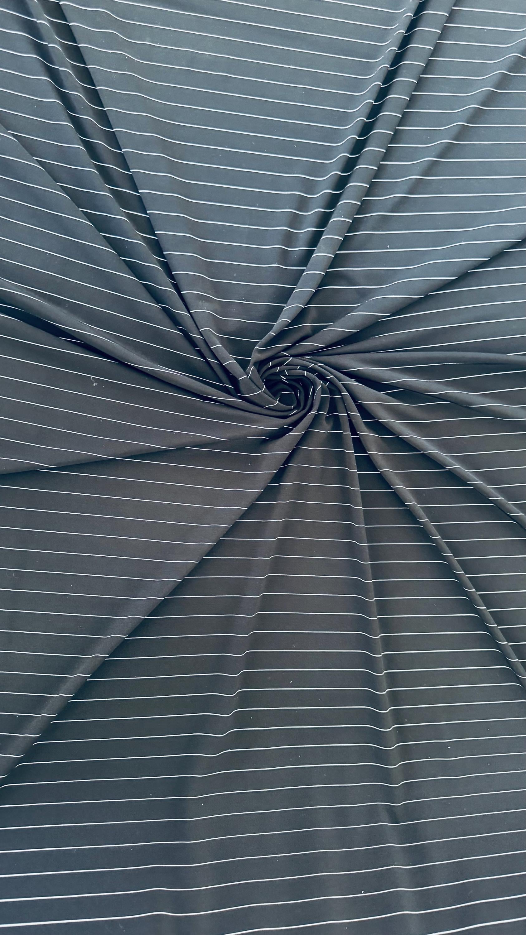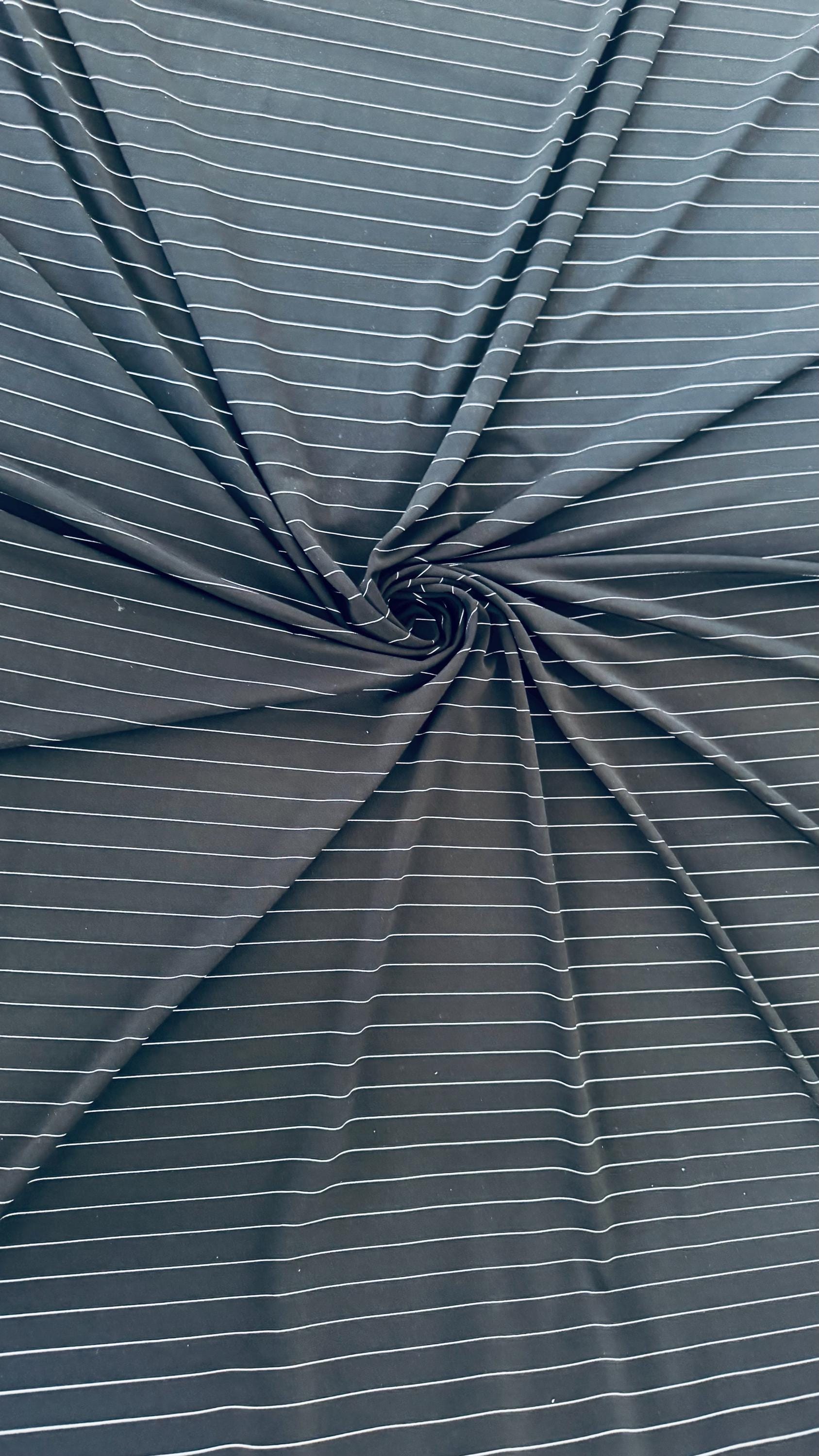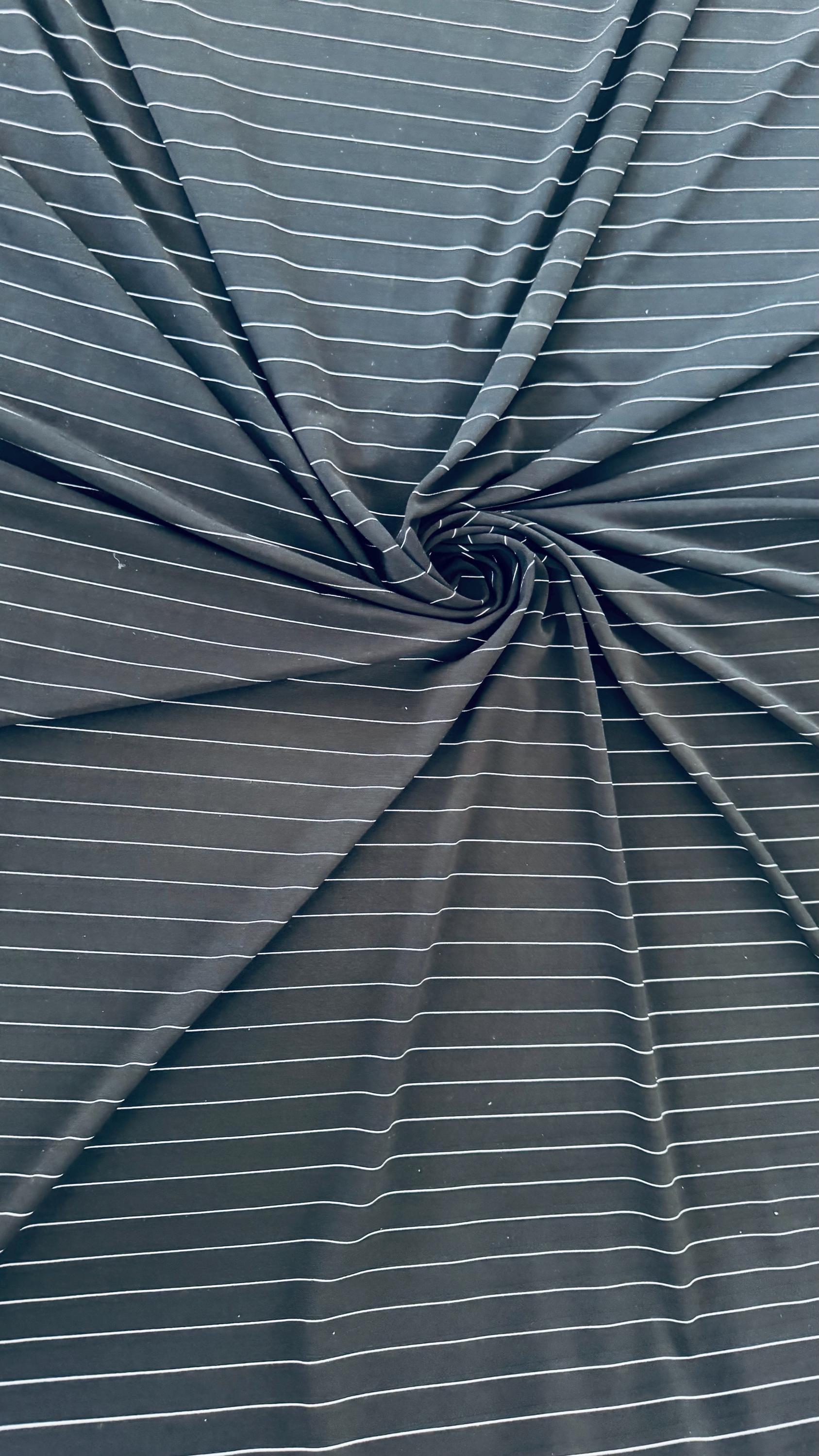 Pin stripes Black/White on Poly spandex 4-way stretch 58/60” Sold by the YD. Ships worldwide from Los Angeles California USA. High quality fabrics by AlexLAFabrics