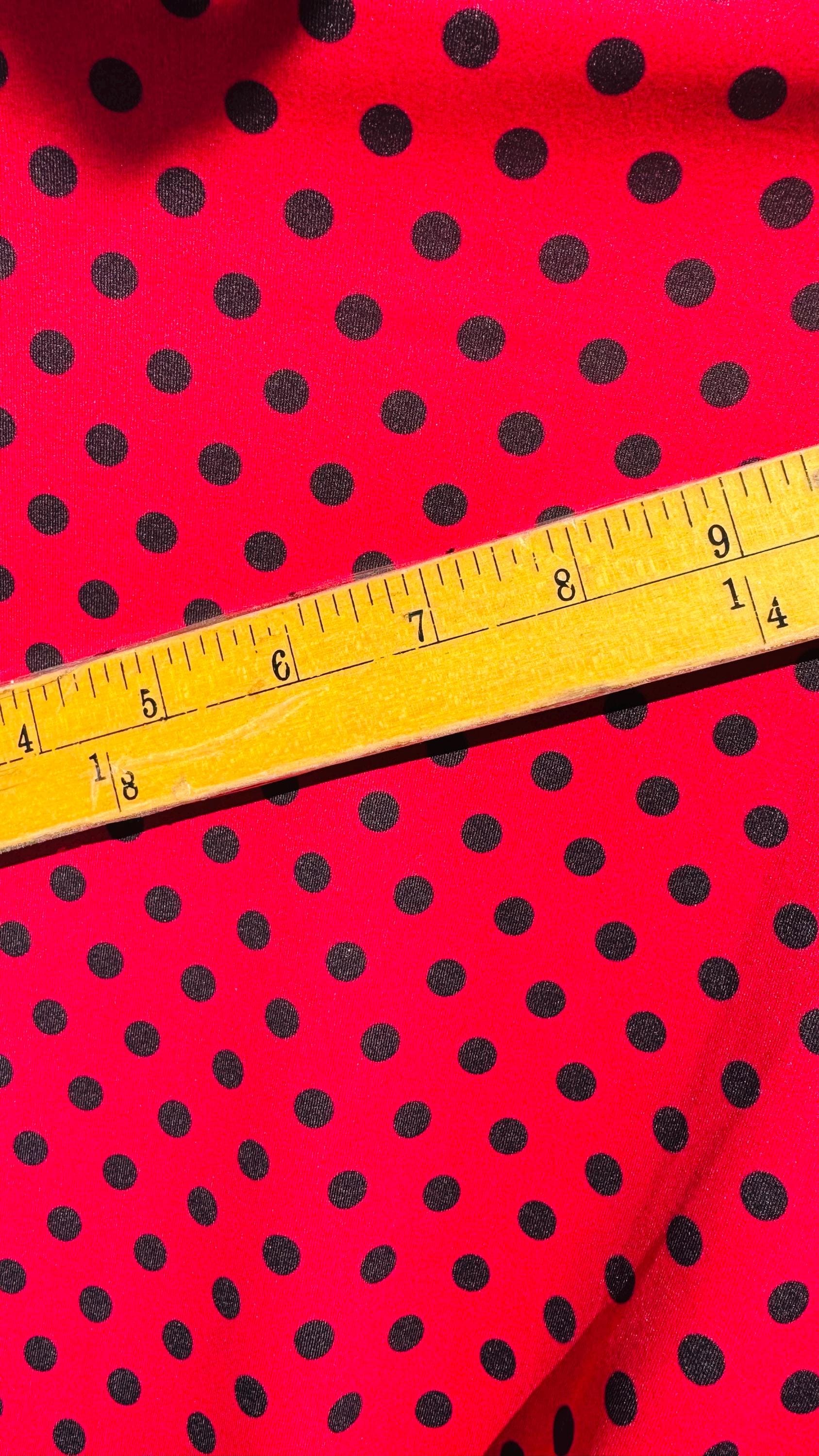 Polka dots design Red/Black print on best quality of Poly spandex 4-way stretch 58/60” Sold by the YD. Ships Worldwide from Los Angeles CA