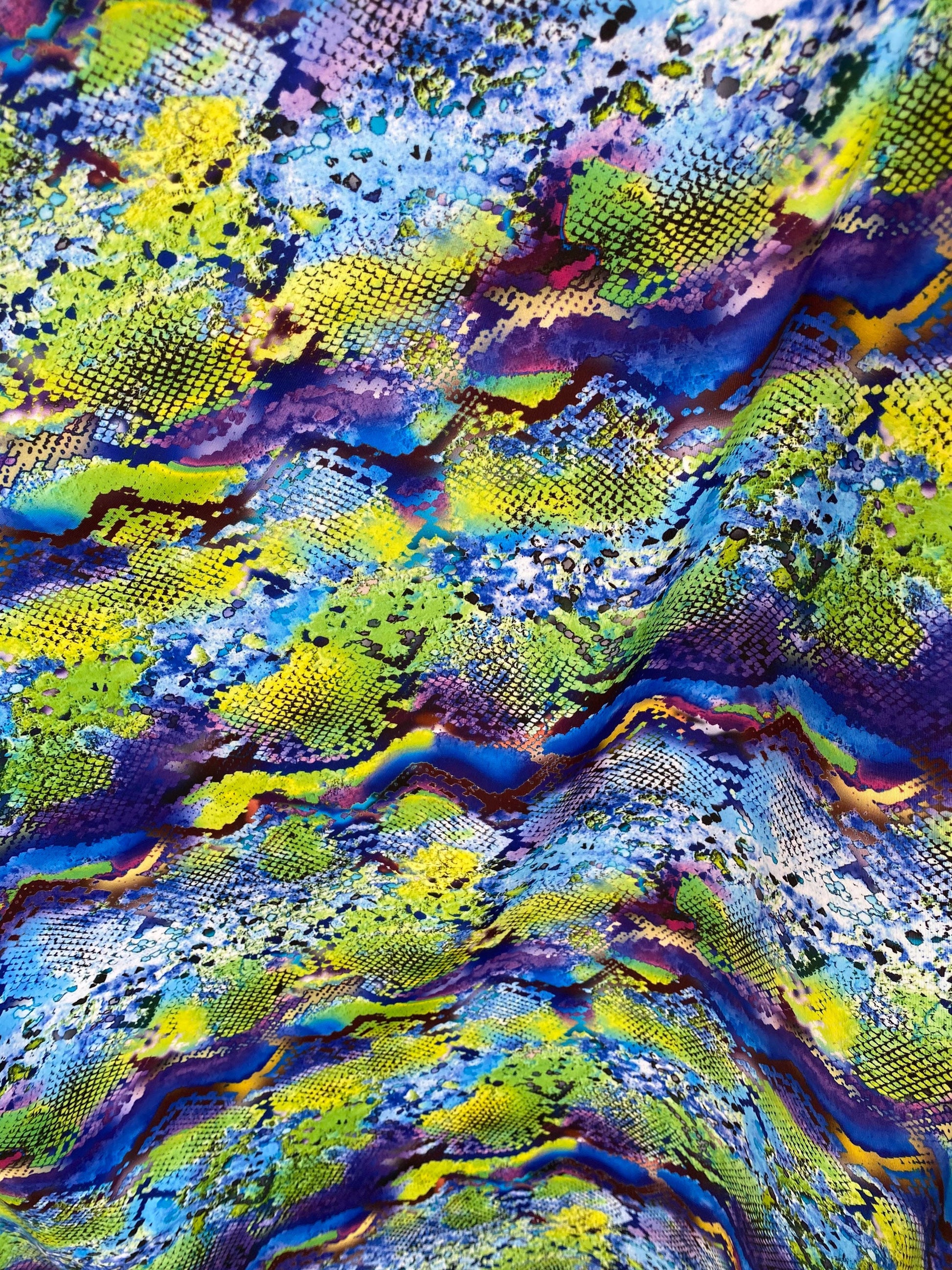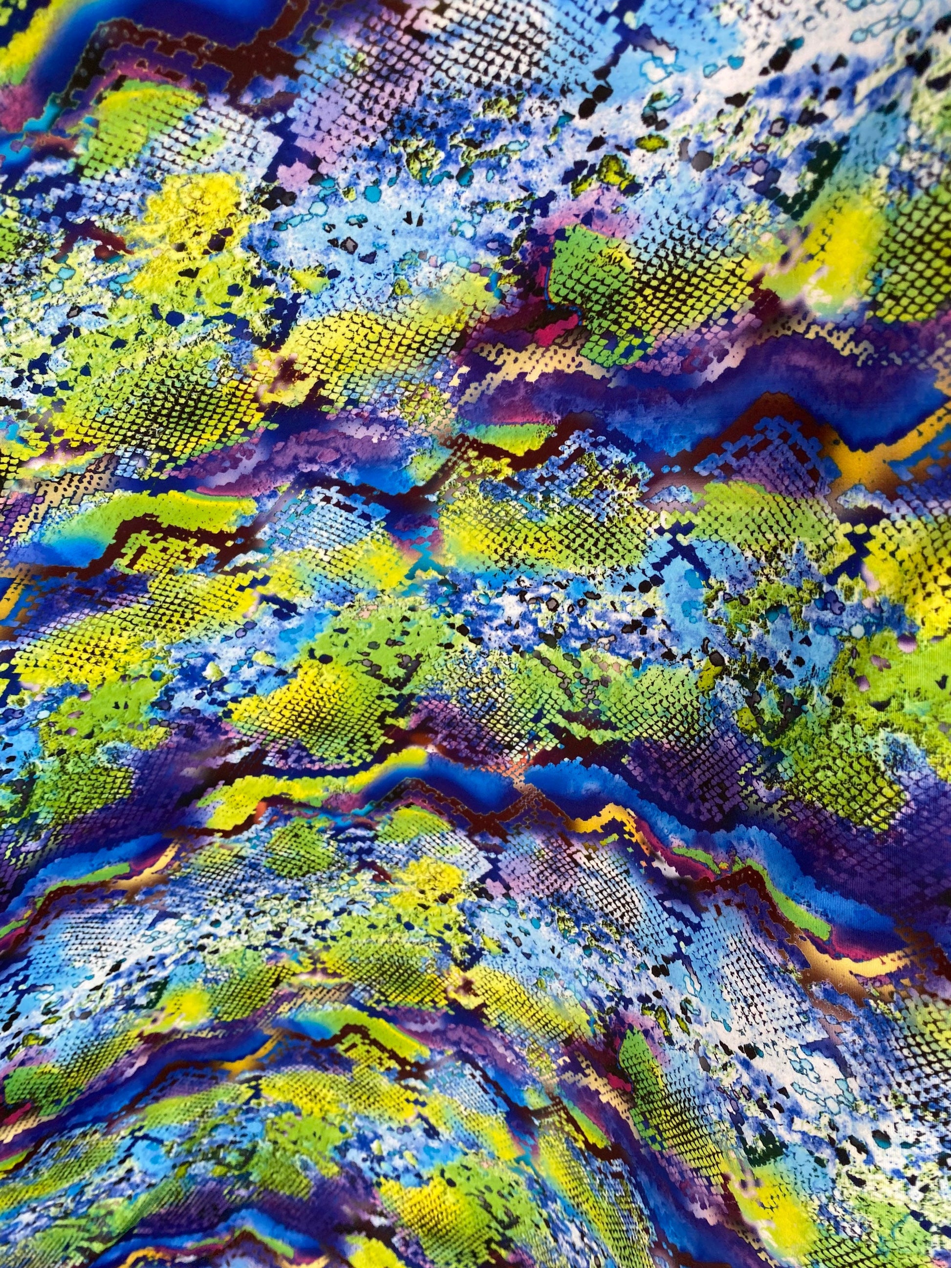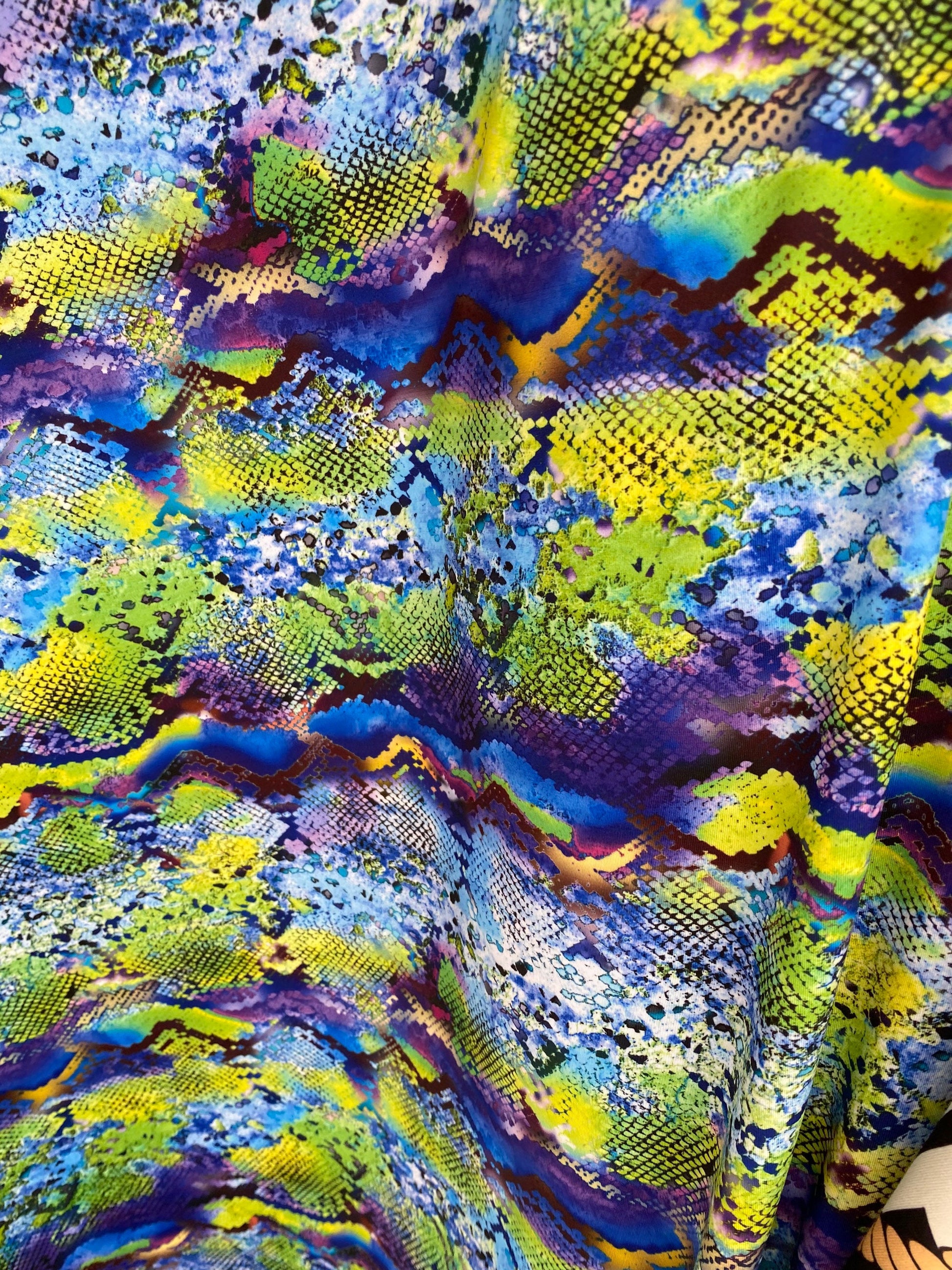 Python serpent design multicolor print on best quality of nylon spandex 4-way stretch 58/60” Sold by the YD. Ships worldwide from Los California USA.