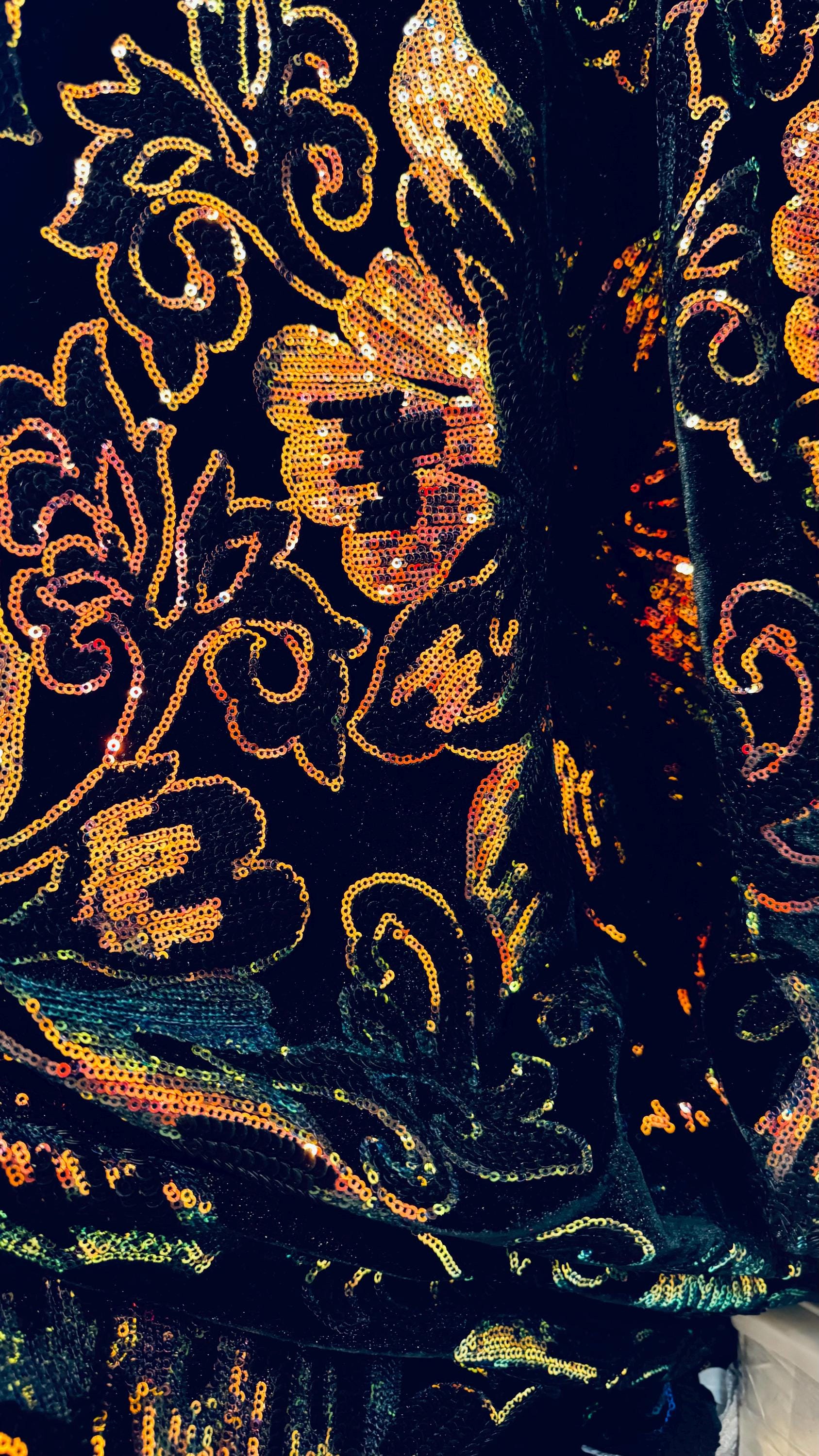 Fomantic Flower Iridescent sequins design embroidered on spandex velvet 4-way 58/60” Sold by the YD. Ships worldwide from Los Angeles California USA. High Quality fabrics by AlexLAFabrics