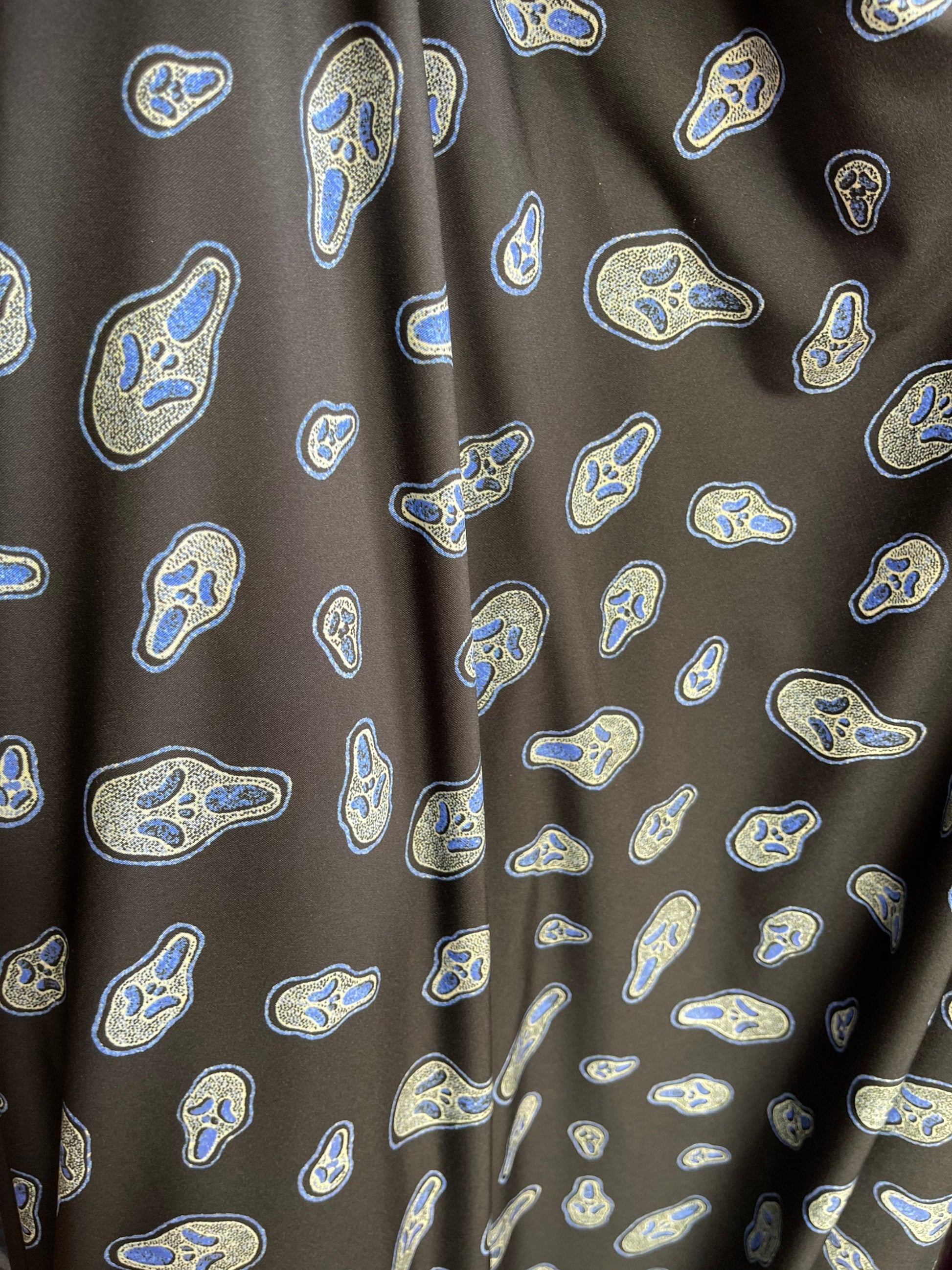 Scream design print on nylon spandex 4-way stretch Black/Sapphire it glows in the dark with black light 58/60” Sold by the YD. Ships Worldwide from Los Angeles California USA.