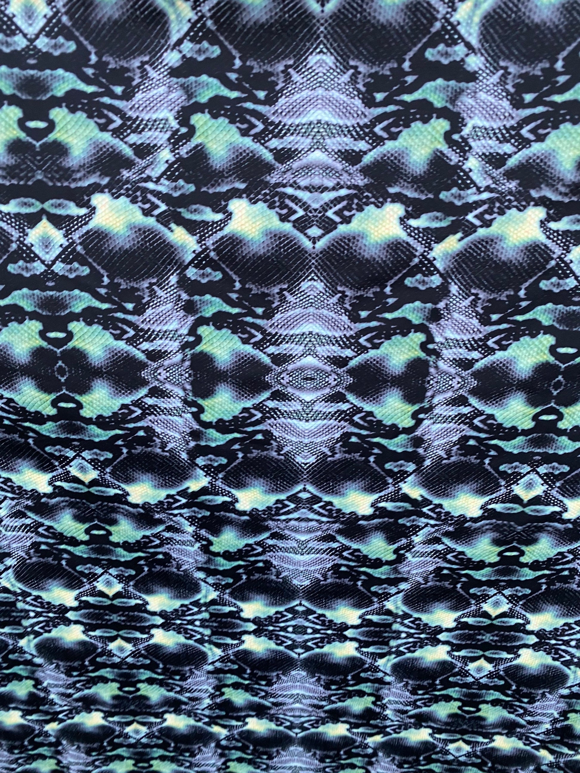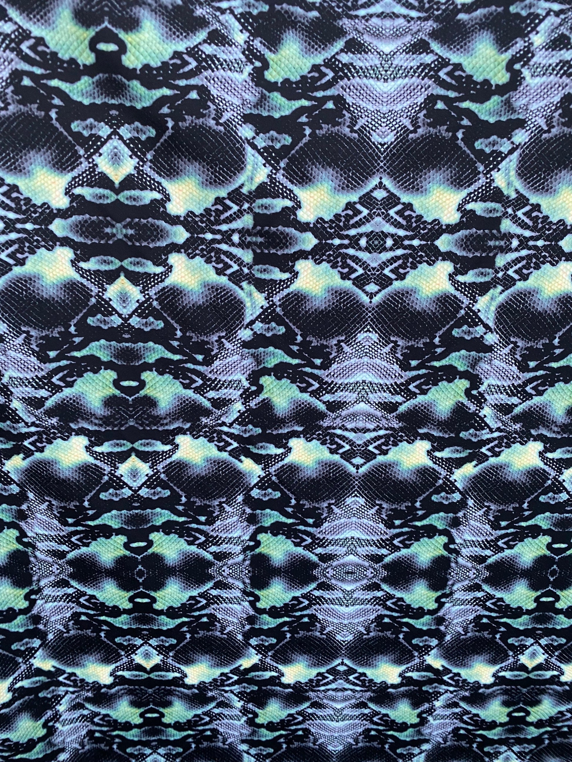 Serpent design Black/green print on nylon spandex 4-way stretch 58/60” Sold by the YD. Ships worldwide from Los Angeles California USA.