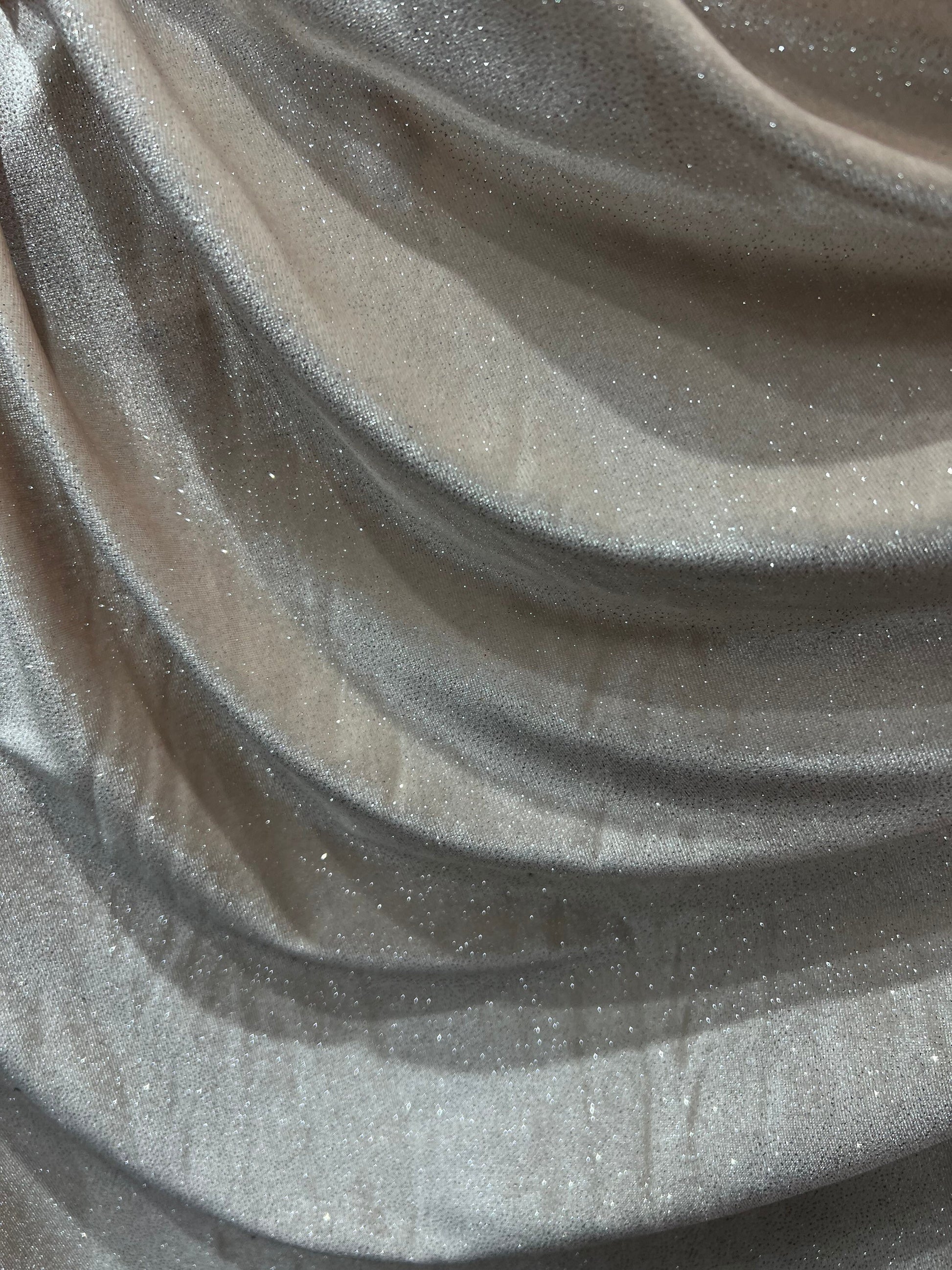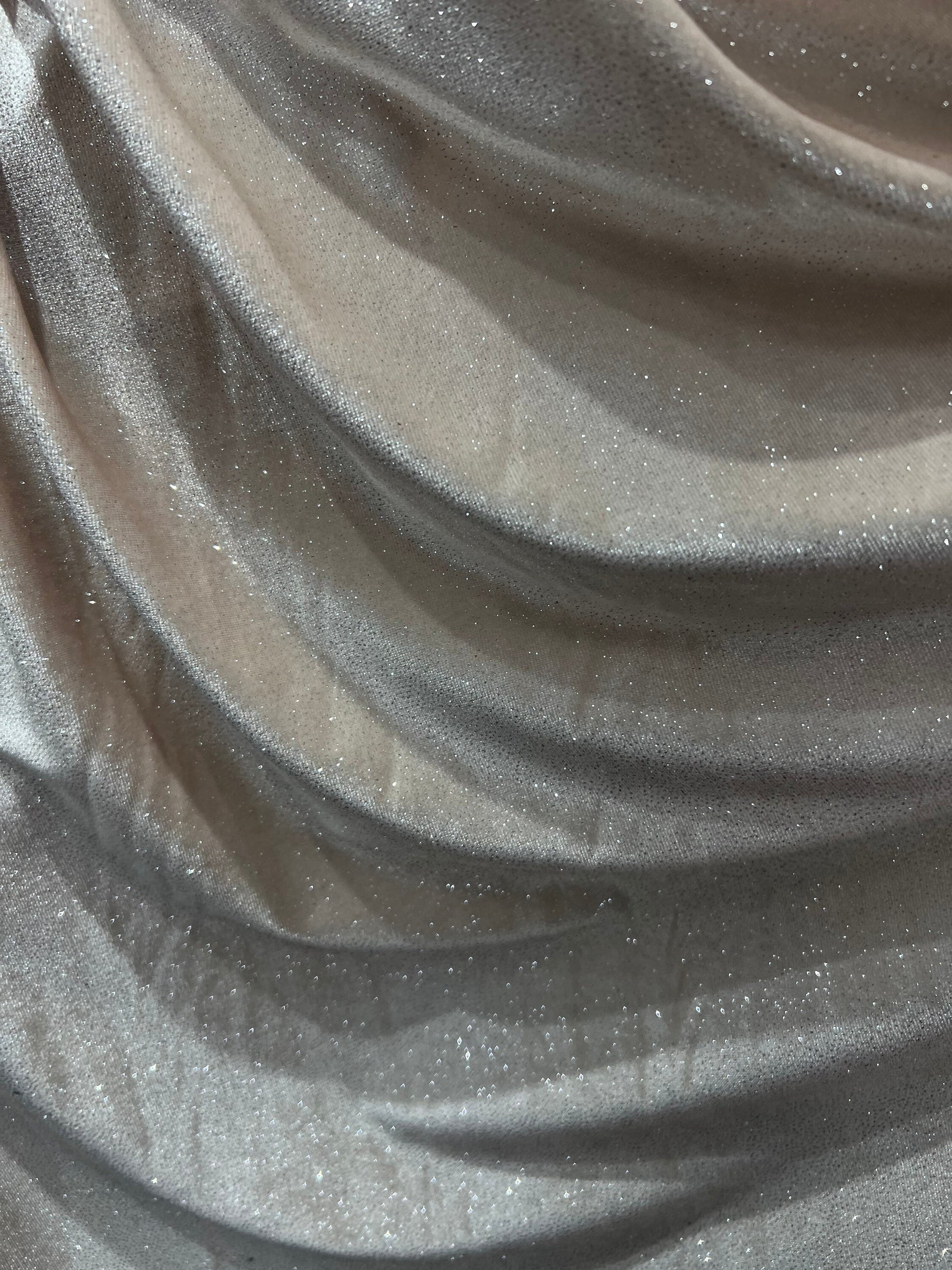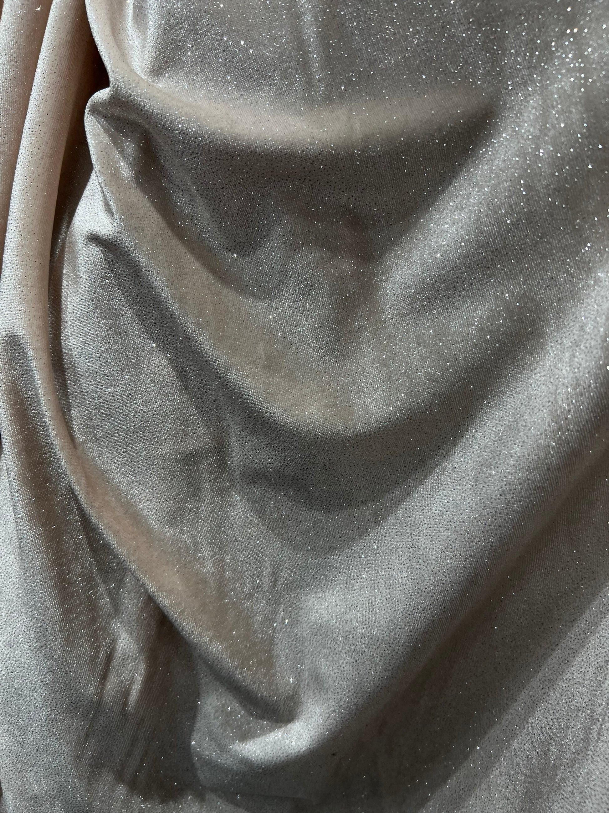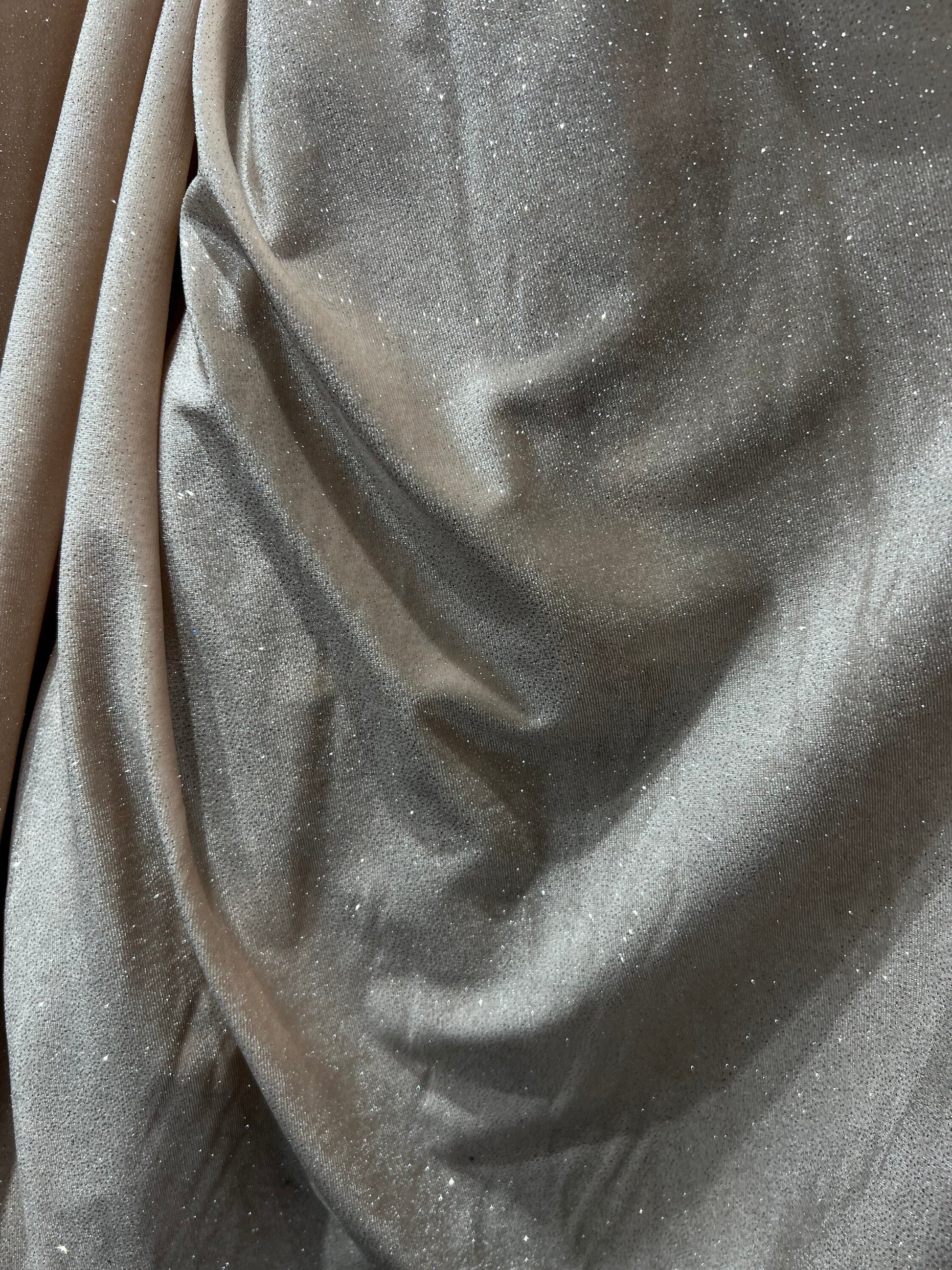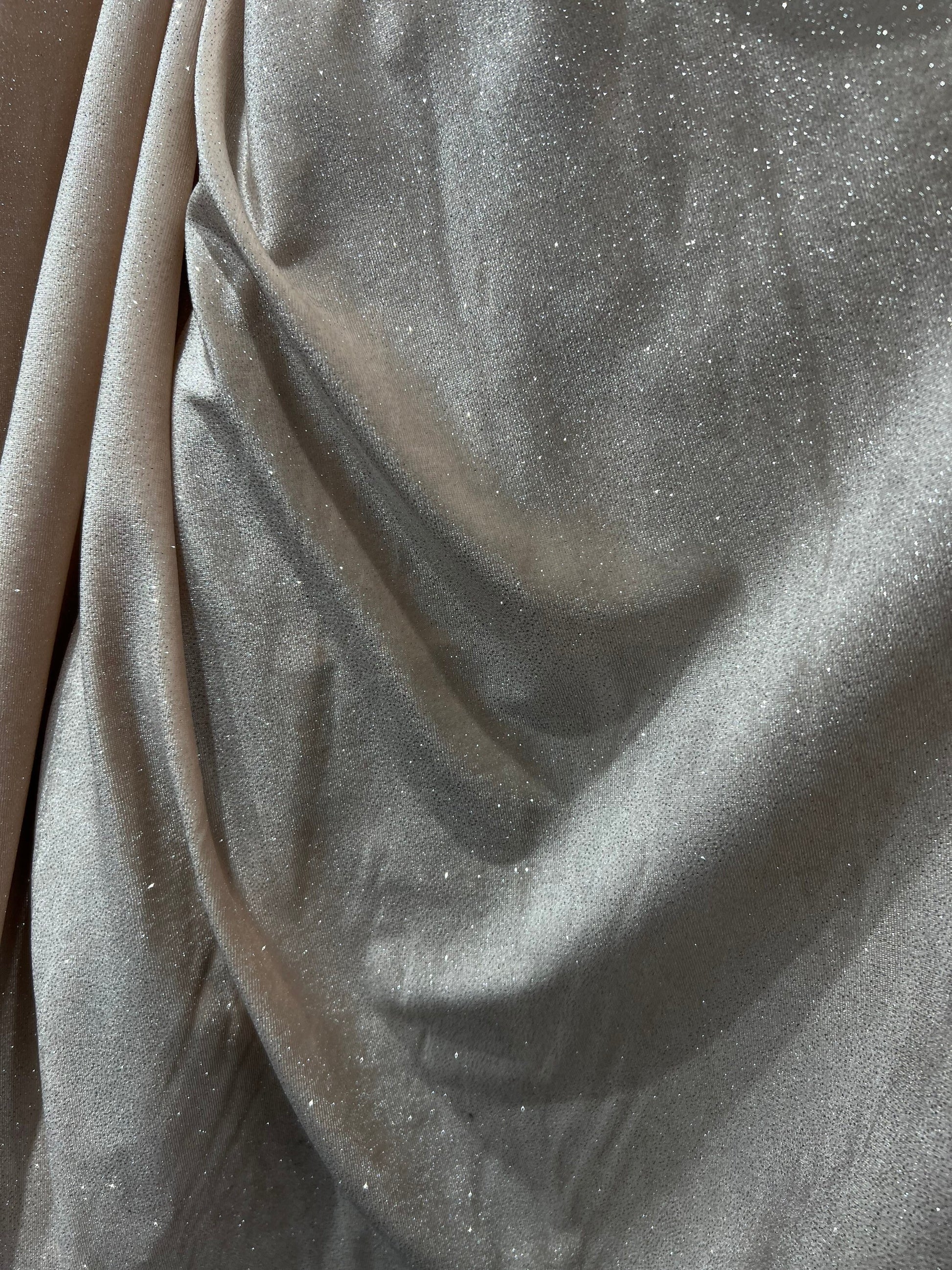 Silver Glitter on stretch velvet 420 GSM 4-way stretch 58/60” Sold by the YD. Ships Worldwide from Los Angeles California USA.
