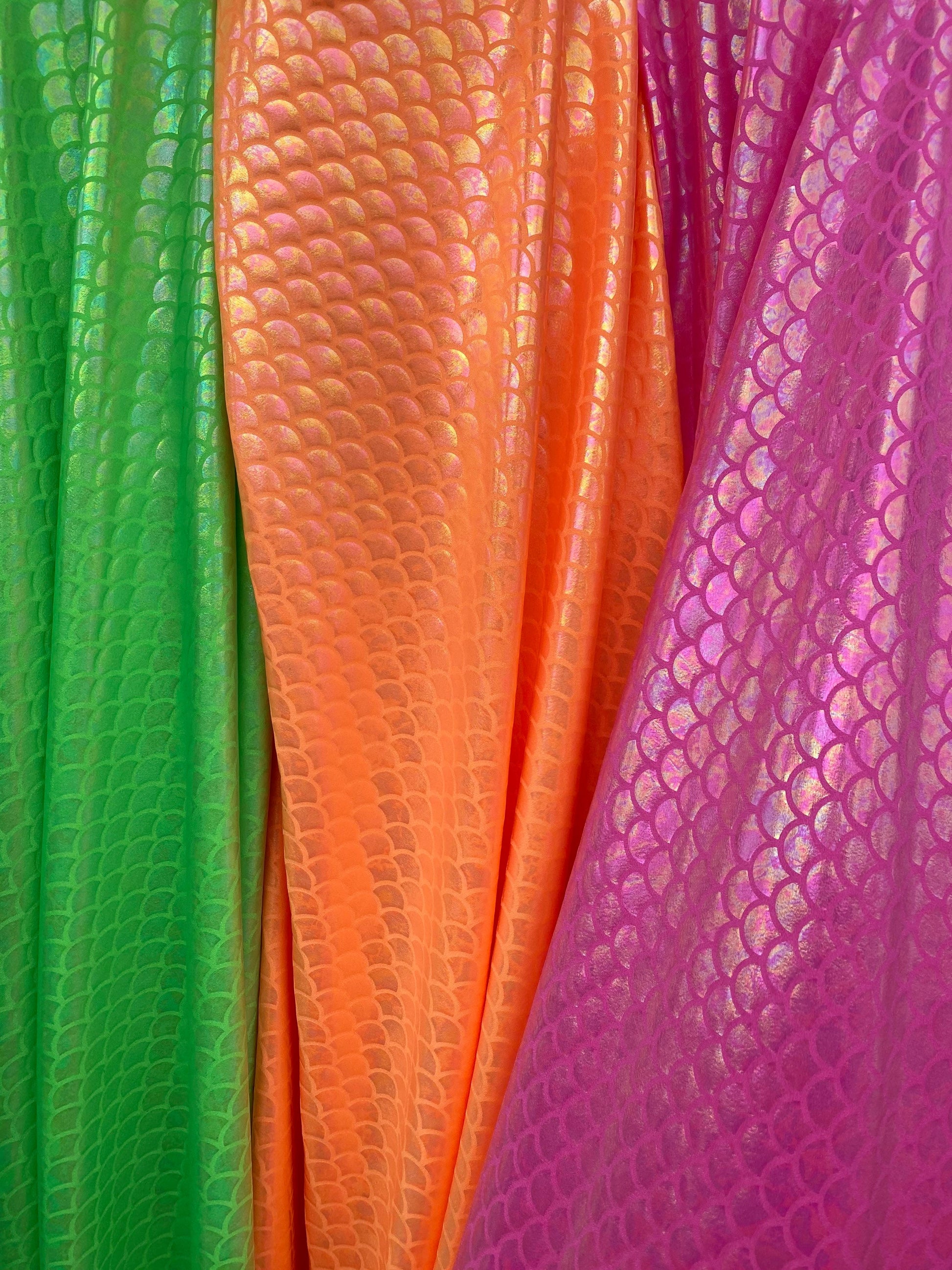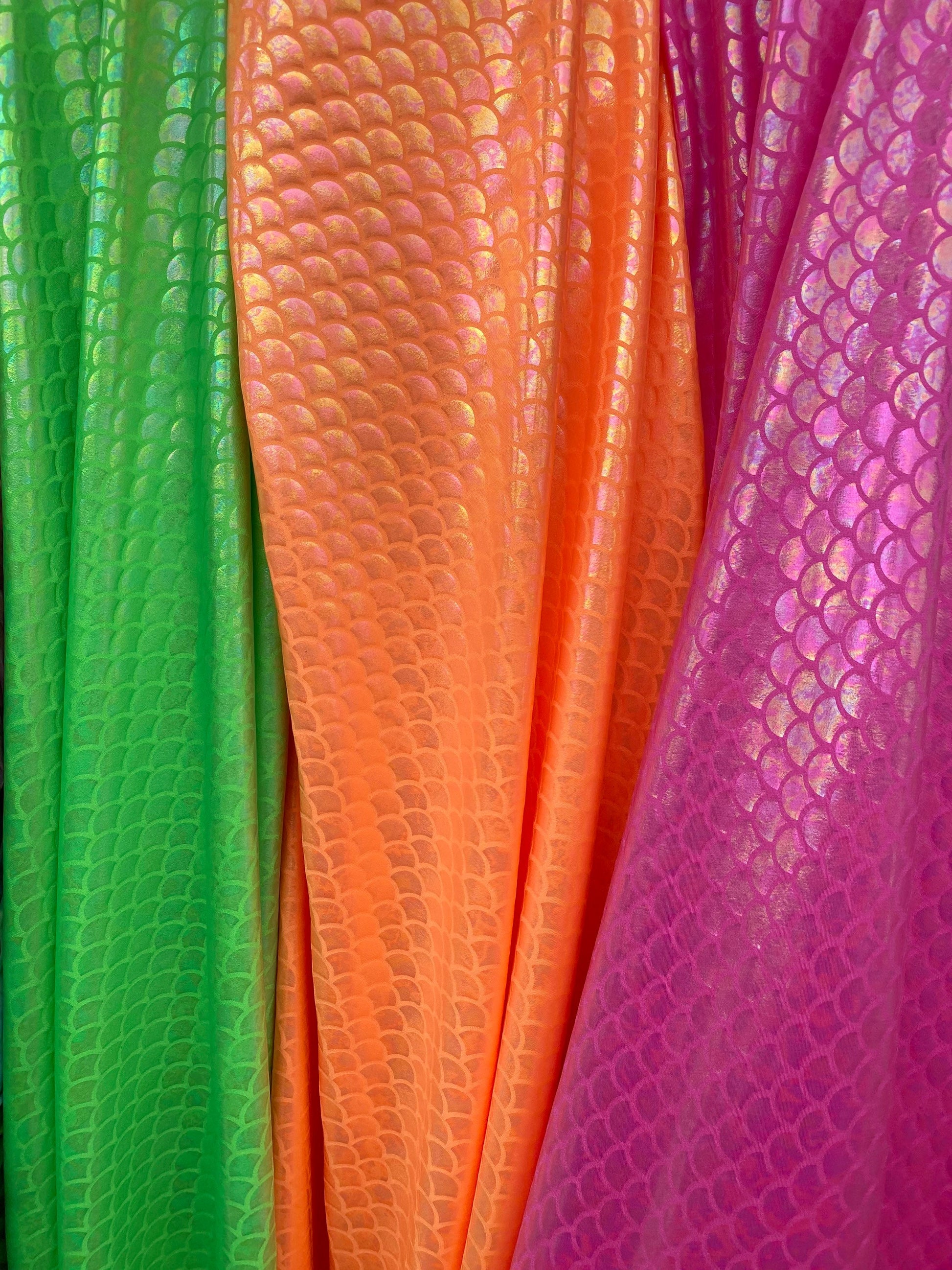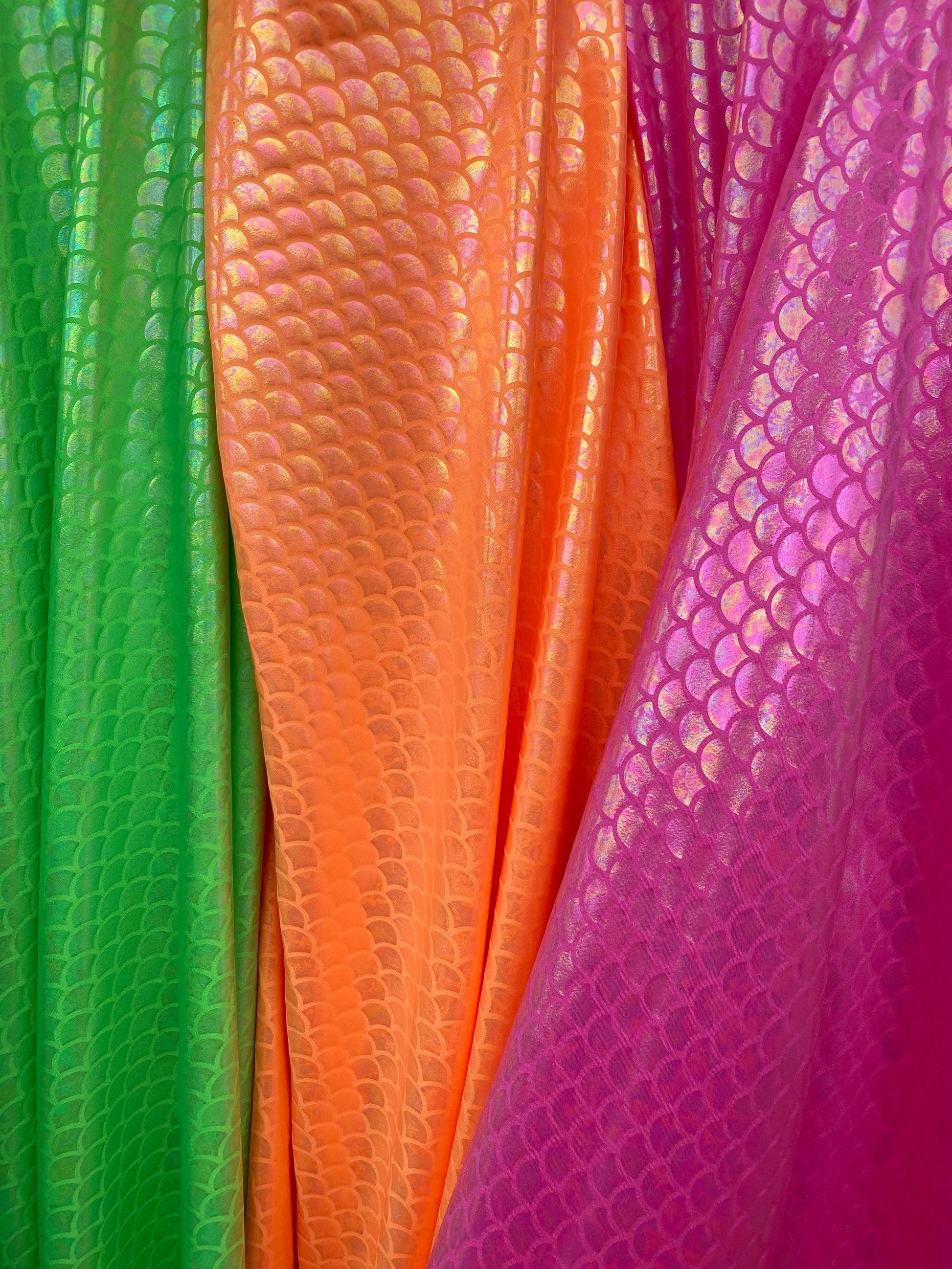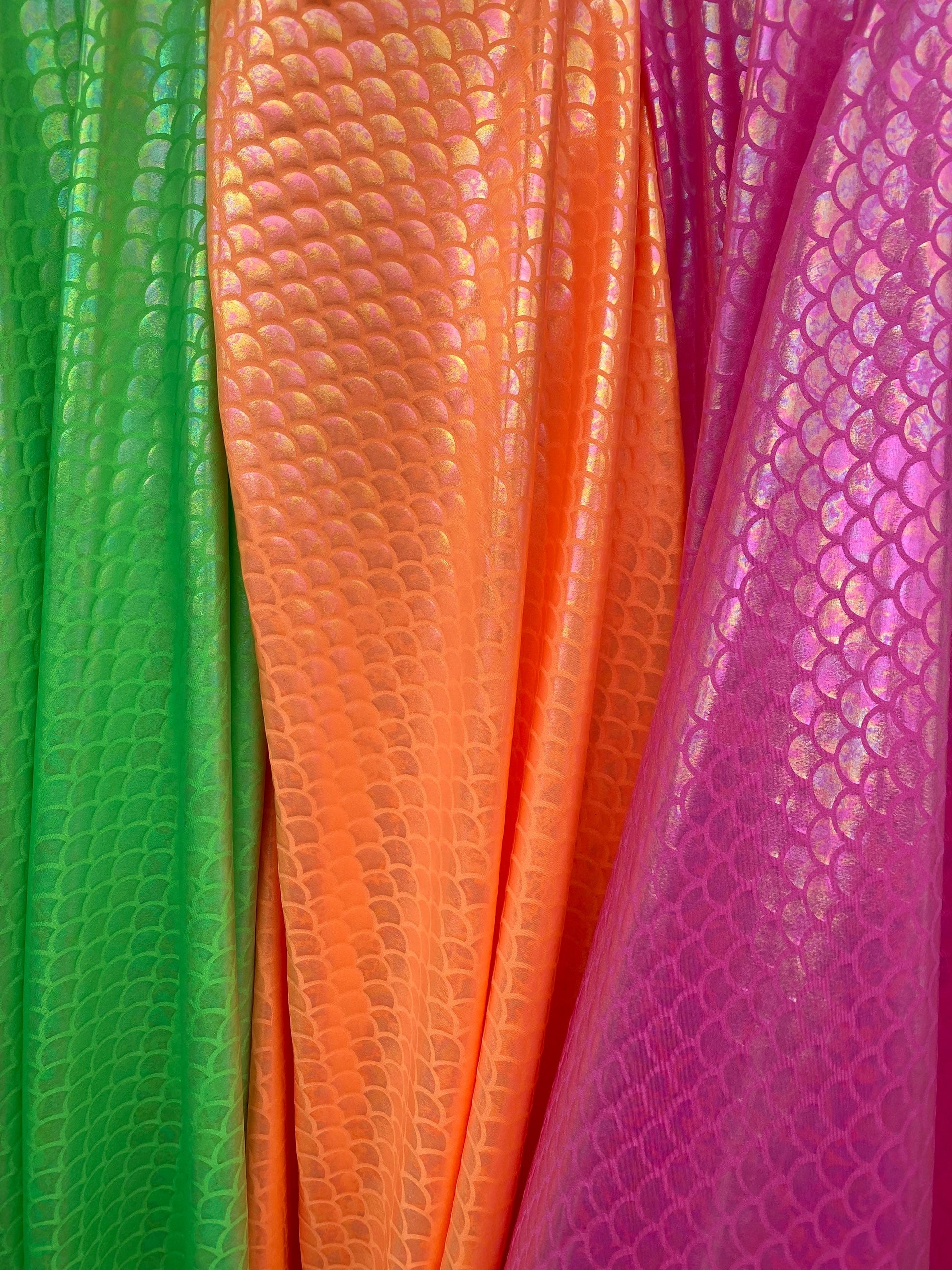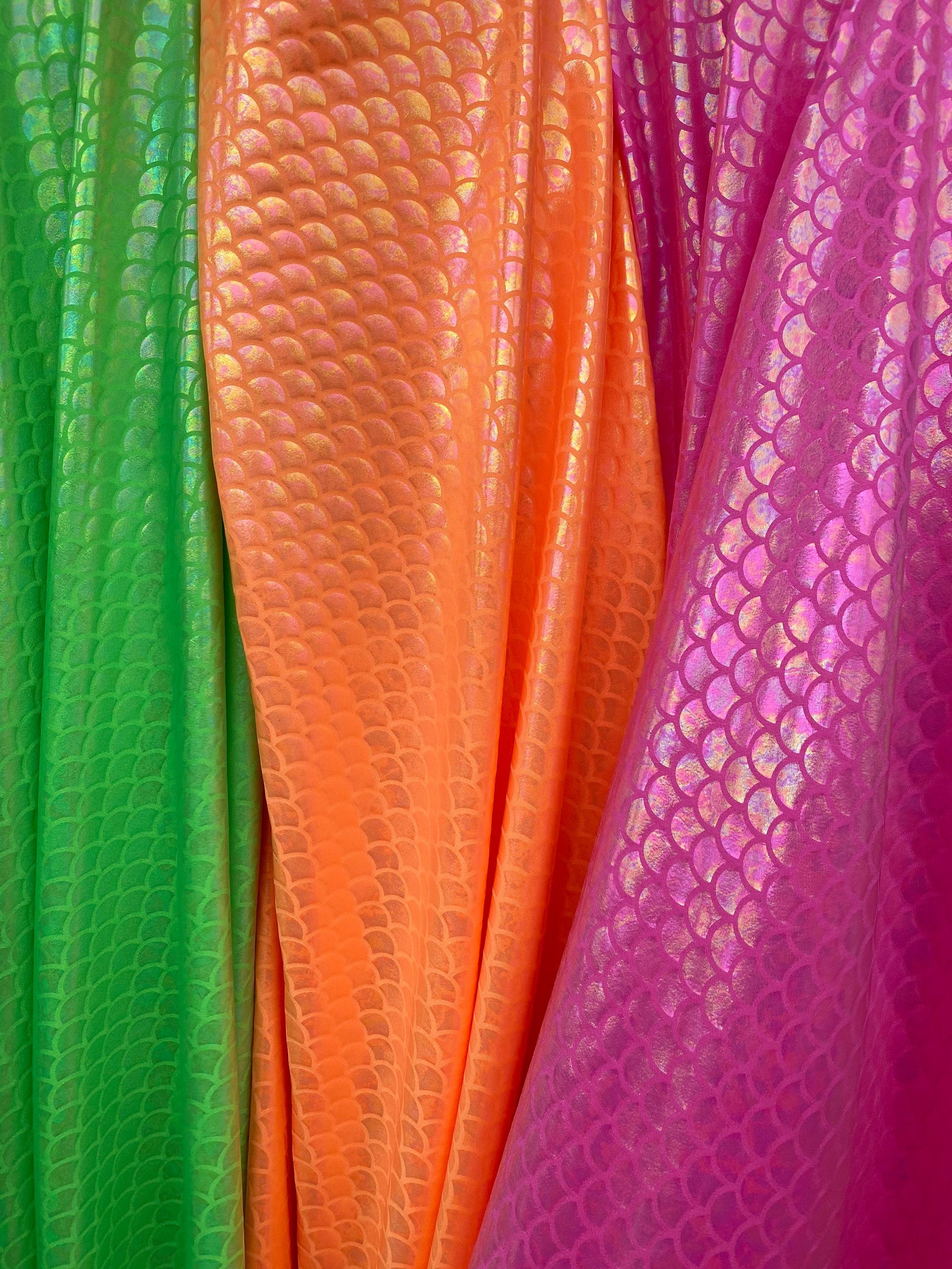 Sirena design with Iridescent foil hologram mermaid nylon spandex 4-way stretch 58/60” Sold by the YD. Ships worldwide from Los Angeles CA.