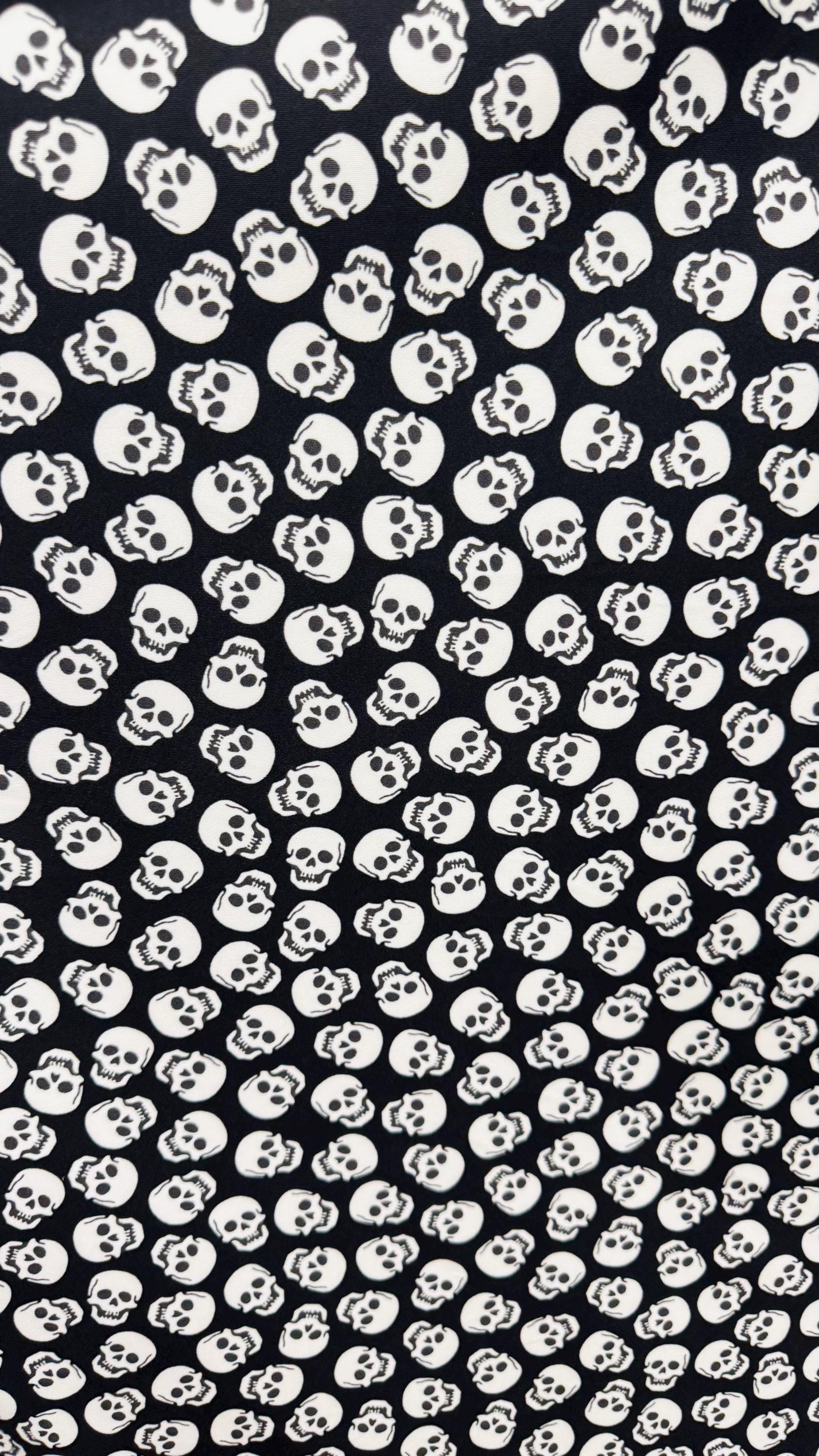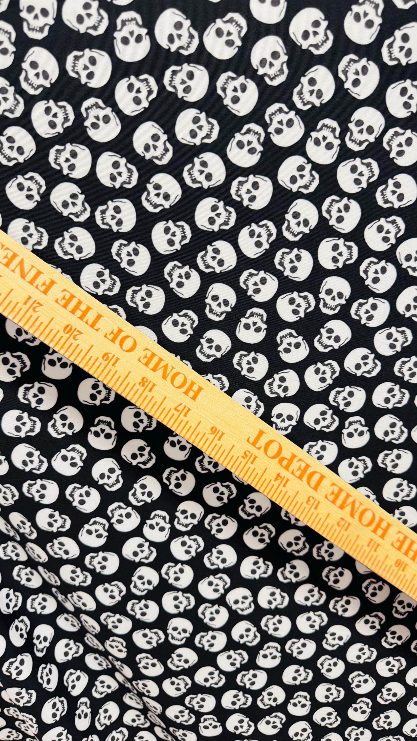 Skull Halloween design Black/White print on nylon spandex 4way stretch 58/60" sold by the yd. Ships worldwide from Los Angeles California USA. High quality fabrics by AlexLAFabrics