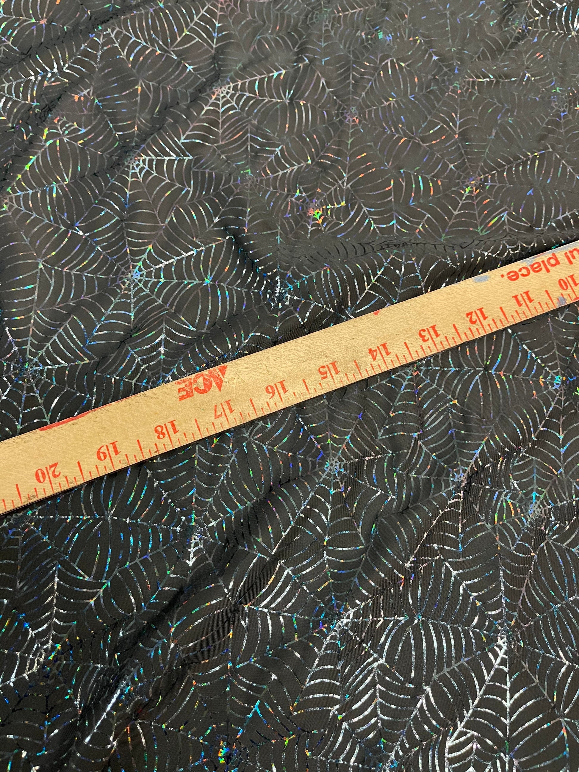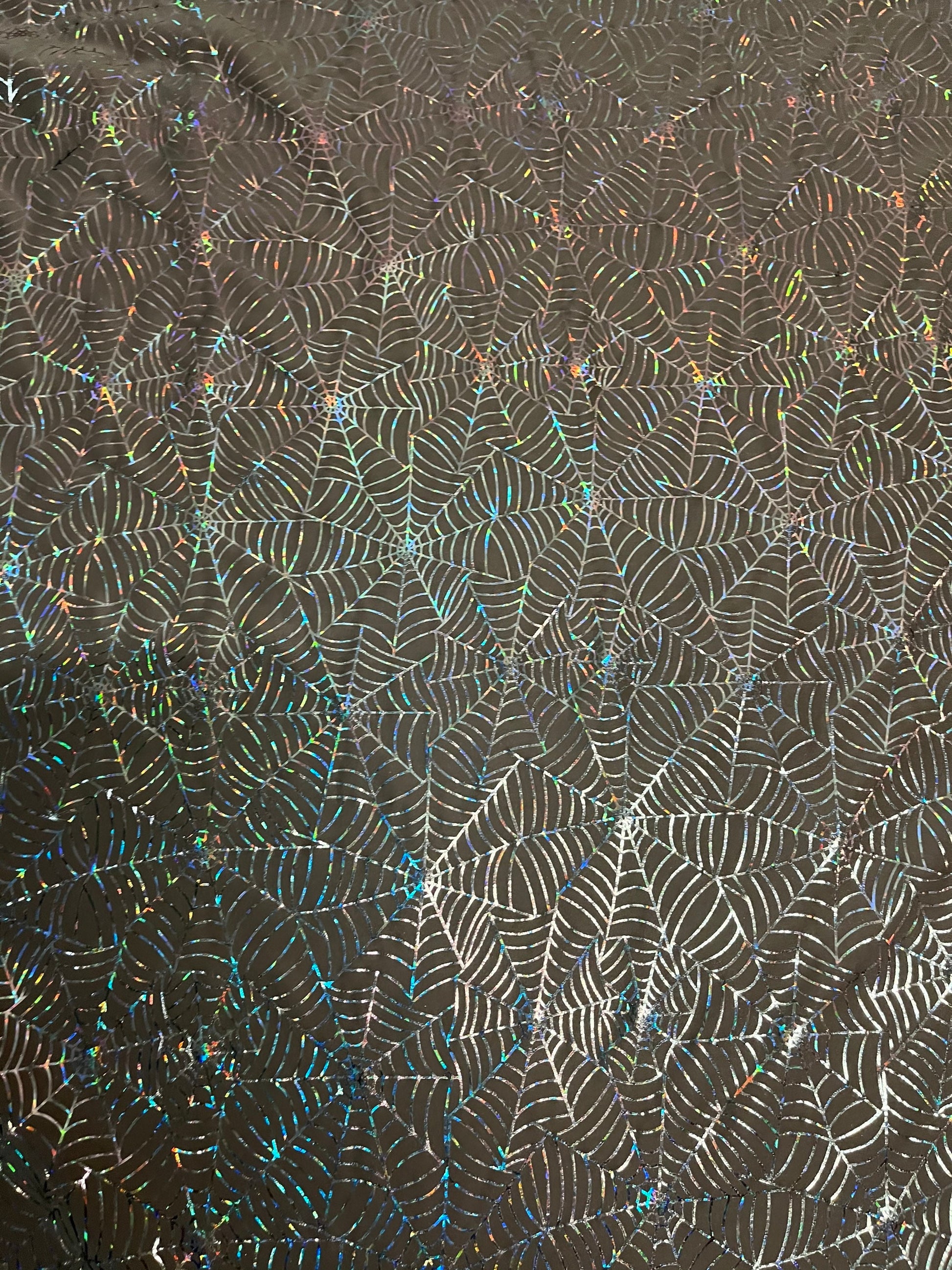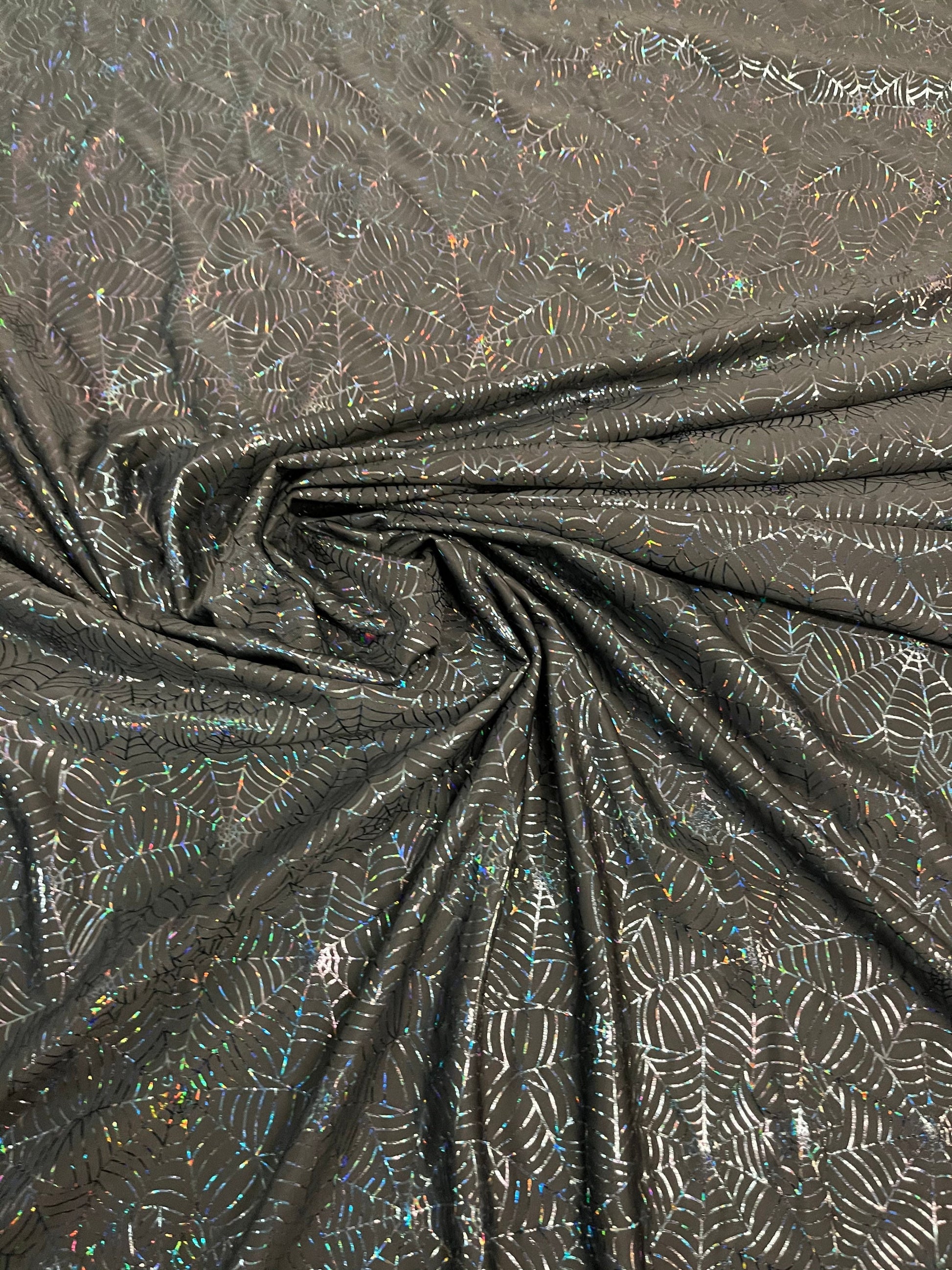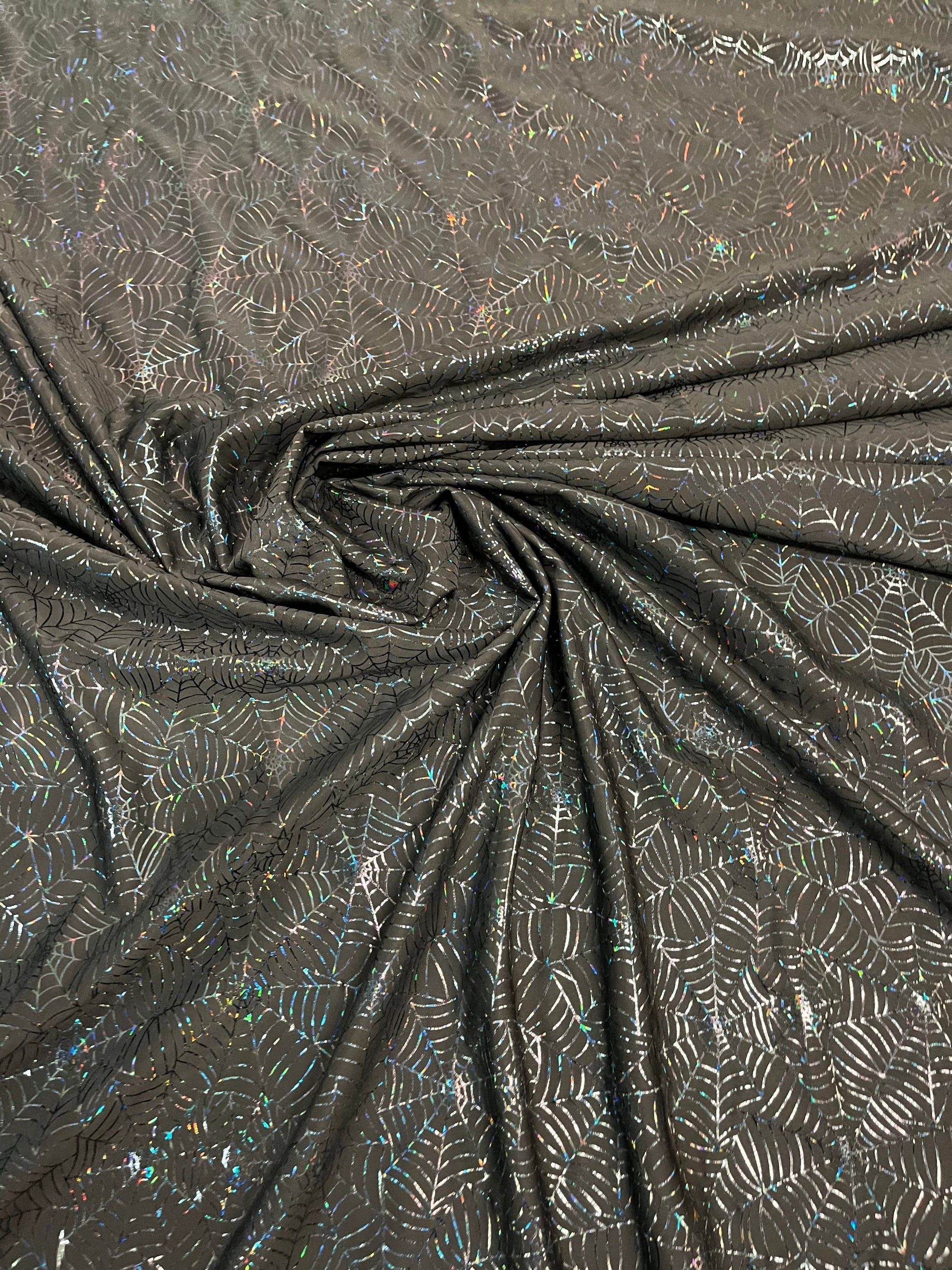 Spiderweb design black/black hologram nylon spandex 4-way stretch 58/60” Sold by the YD. Ships Worldwide from Los Angeles California USA.