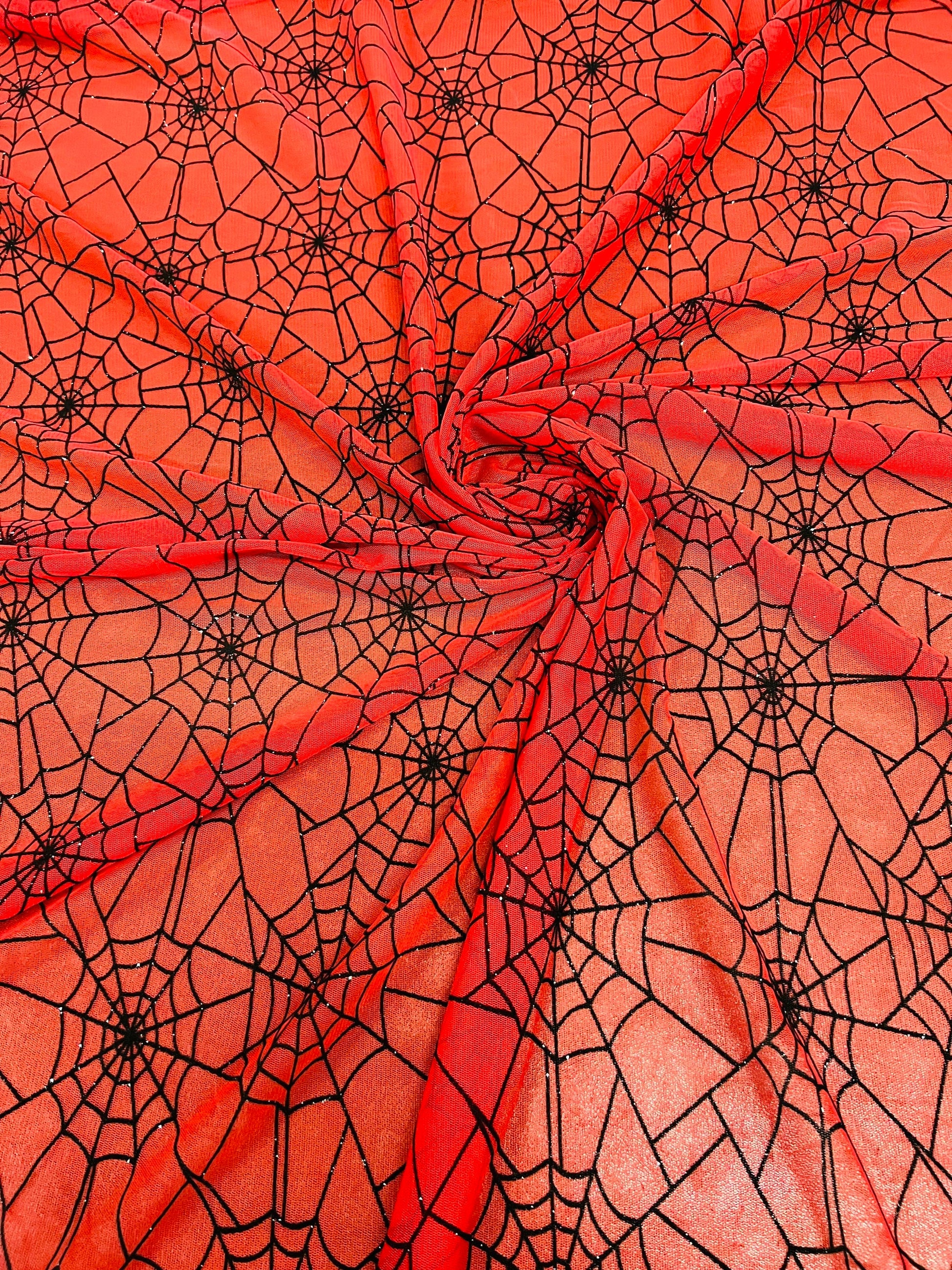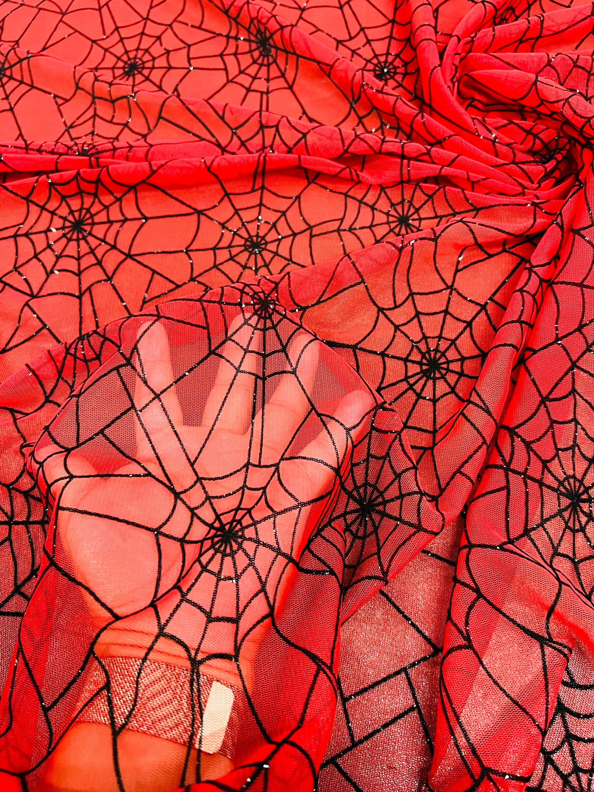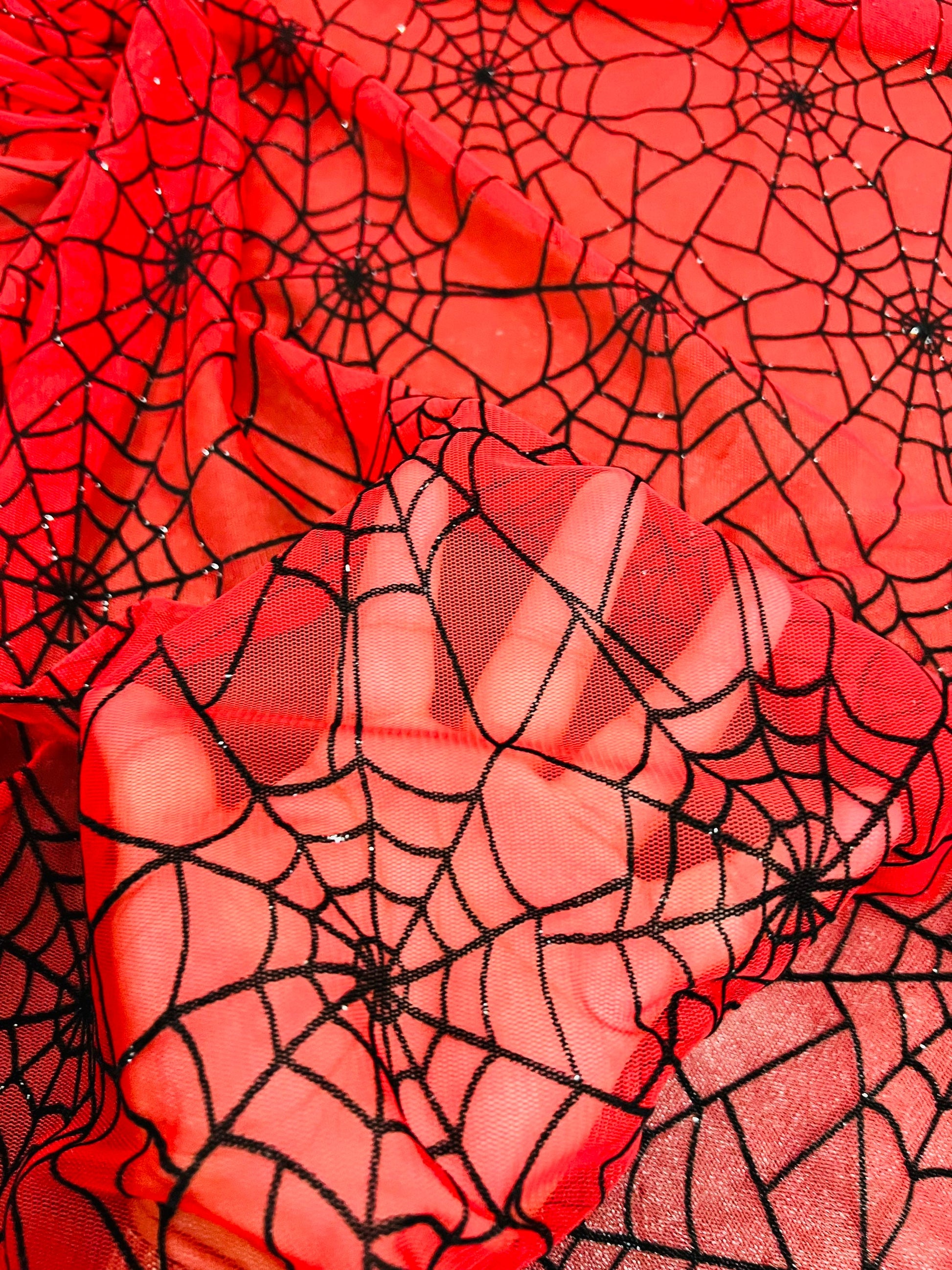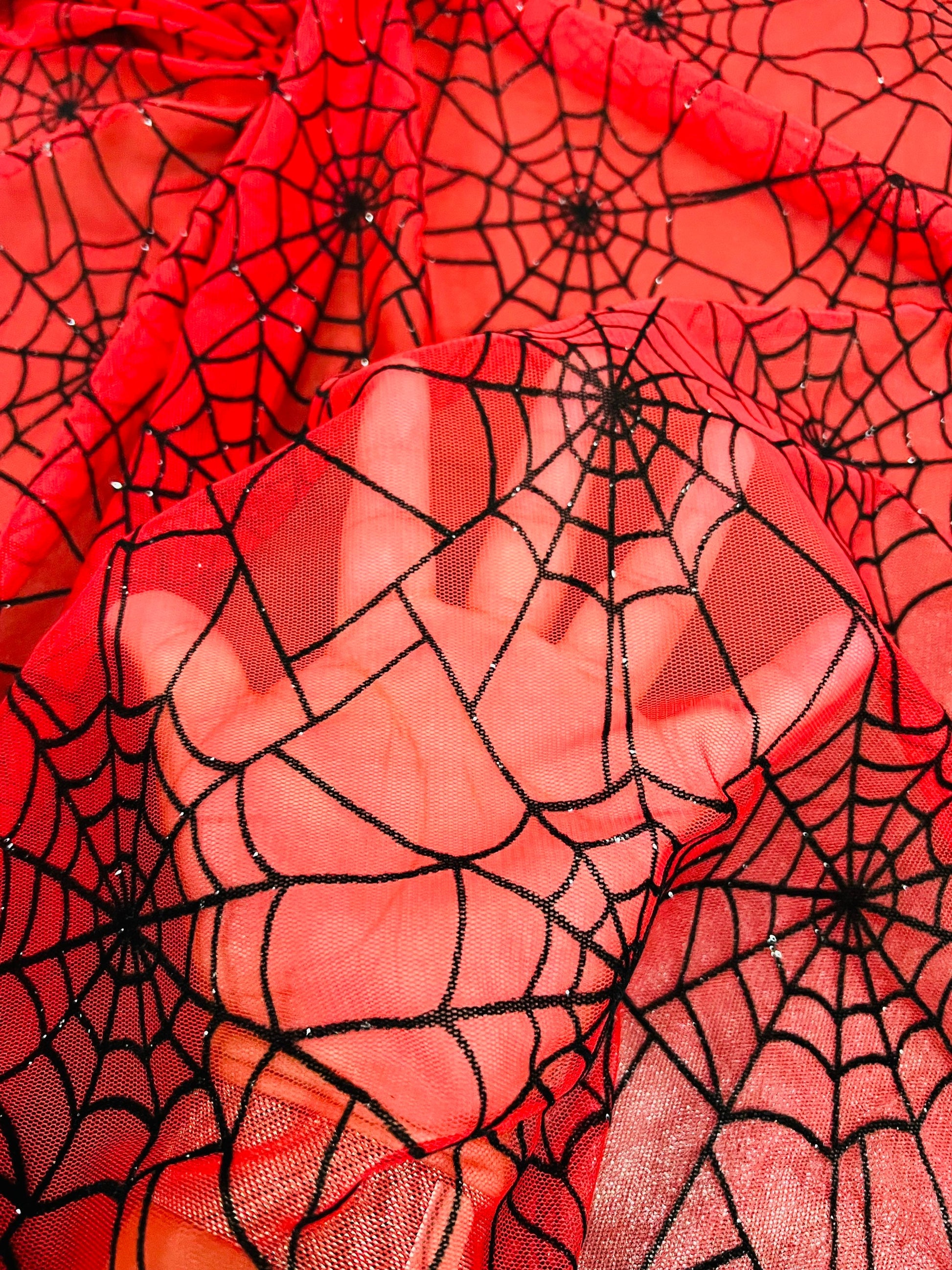 Spiderweb design red/black flocking stretch mesh 2-way stretch 58/60” Sold by the YD. Ships Worldwide from Los Ángeles California USA