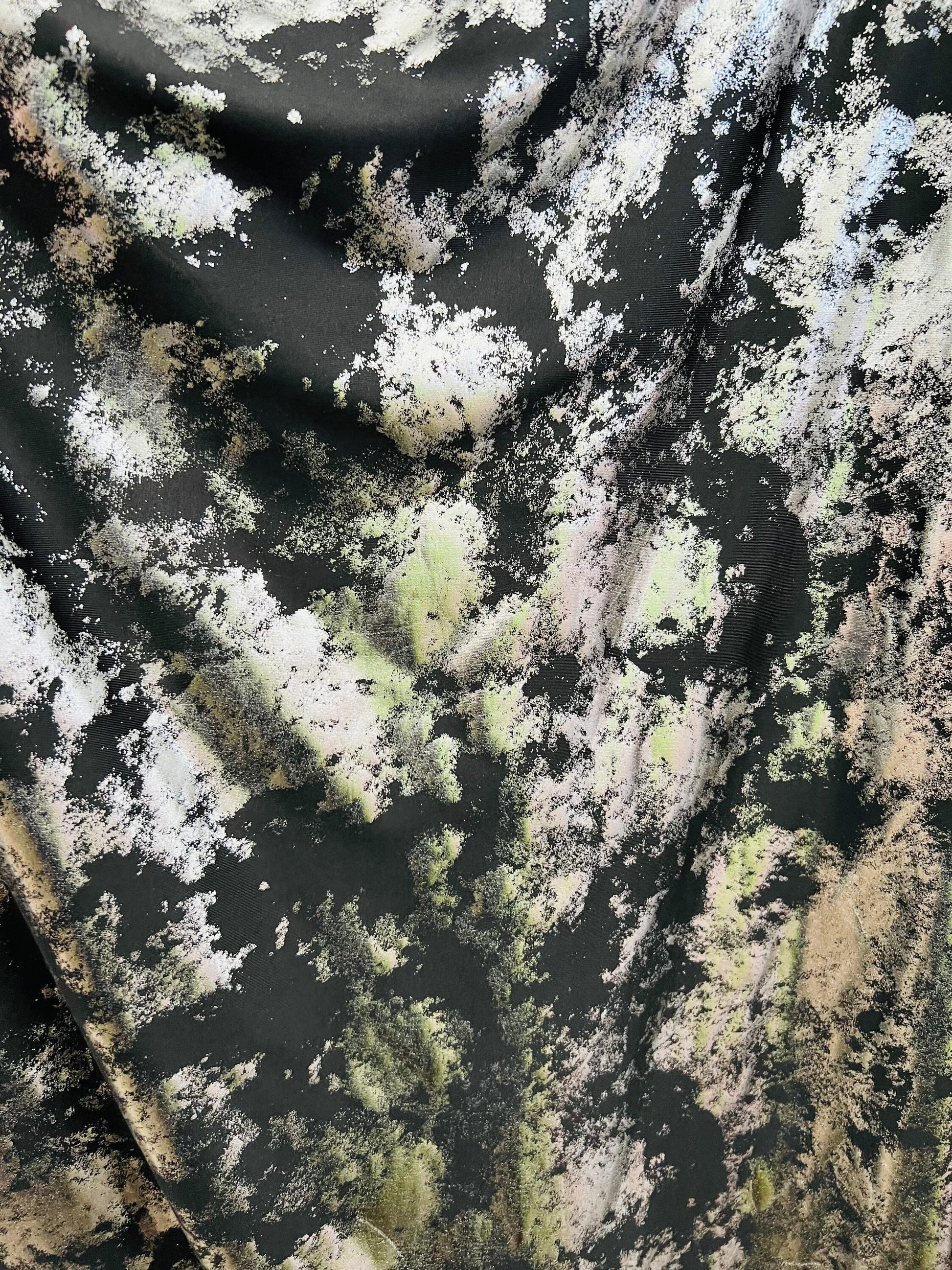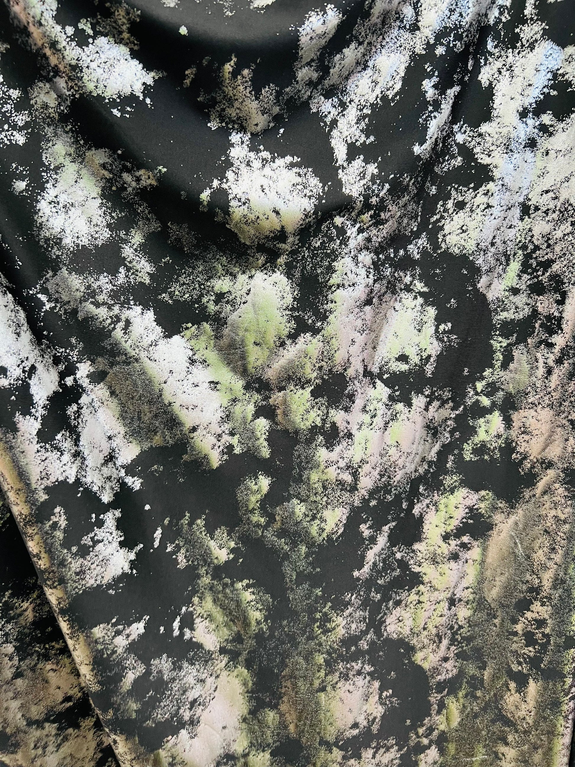 Splatter design metallic poly spandex black/silver 2-way stretch 58/60” Ships Worldwide from Los Angeles California USA.