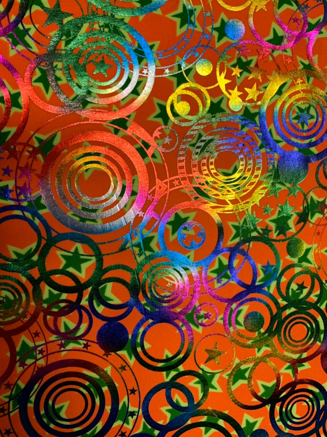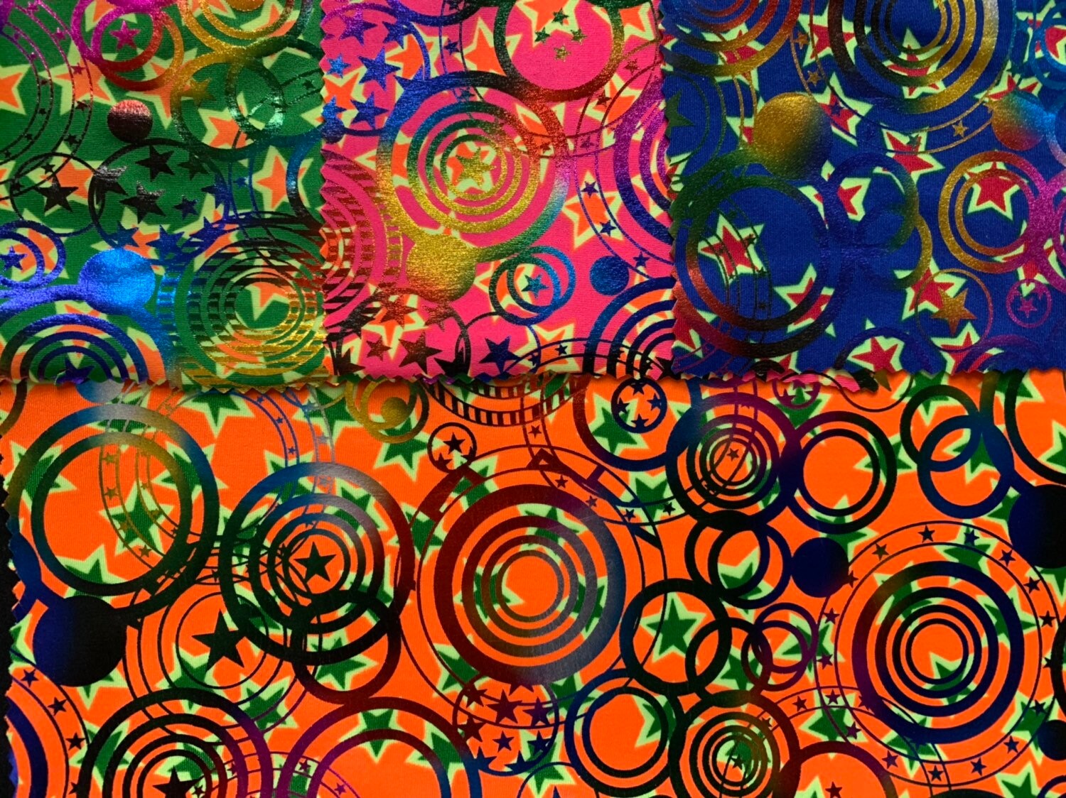 Stars and circles hologram design metallic nylon spandex 4way 58/60" Sold nubthe YD. Ships worldwide from Los Angeles California USA.