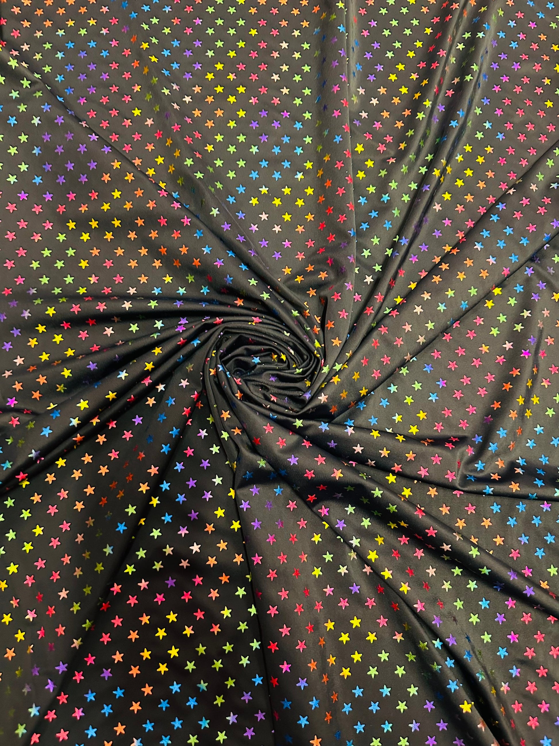 Stars multicolor design black/rainbow print on best quality of nylon spandex 4-way stretch 58/60” Sold by the YD. Ships worldwide from Los Angeles California USA