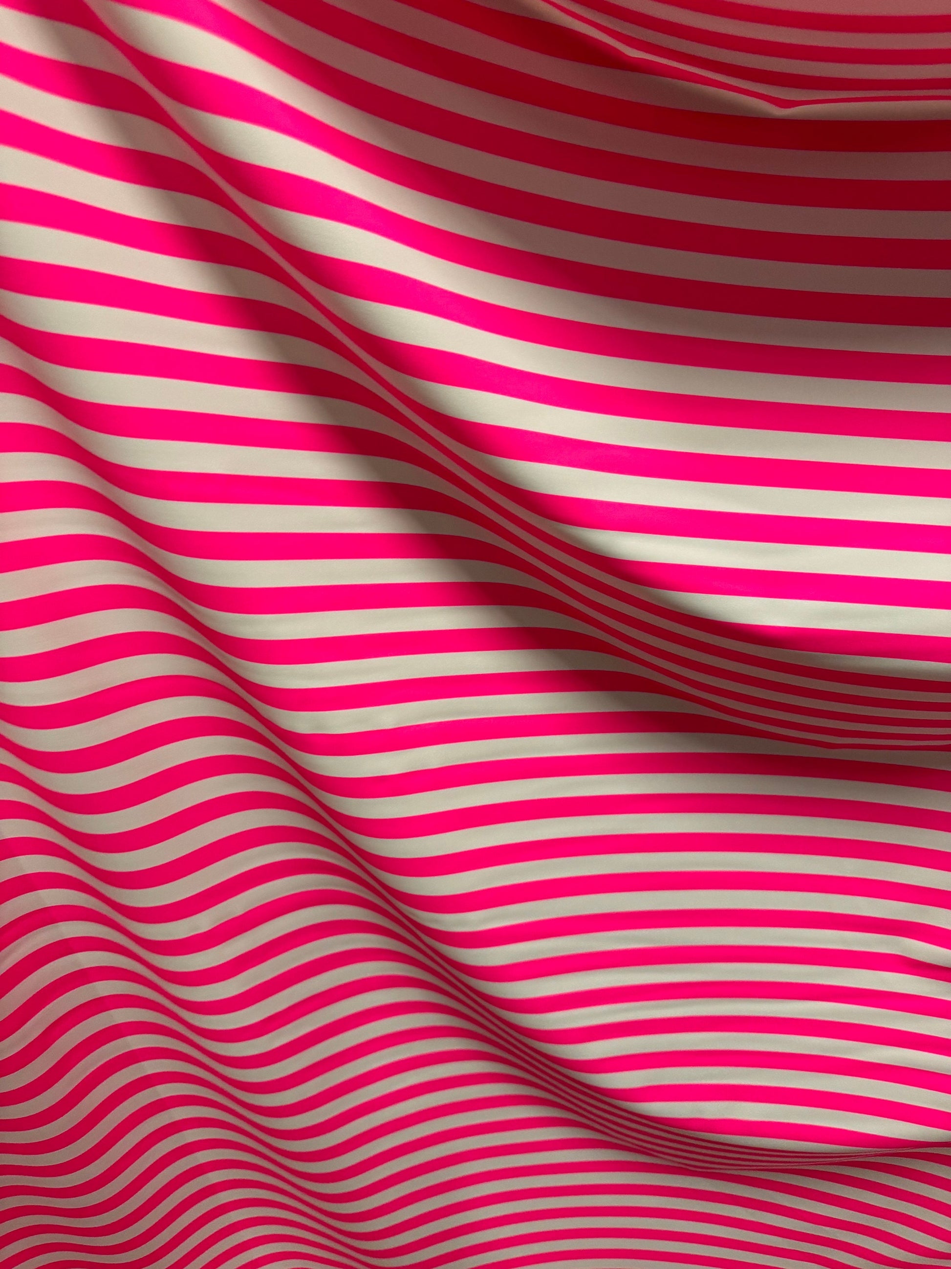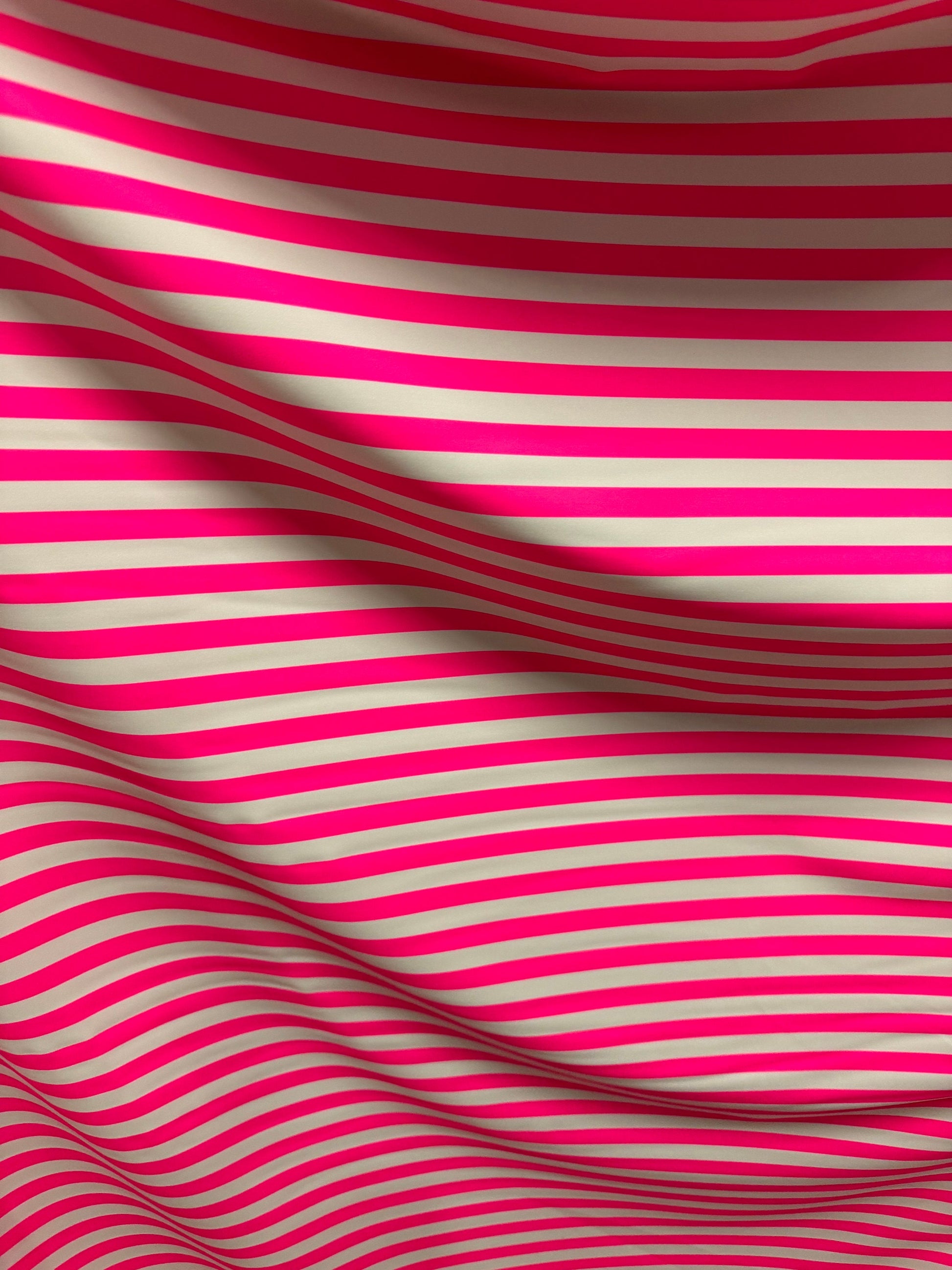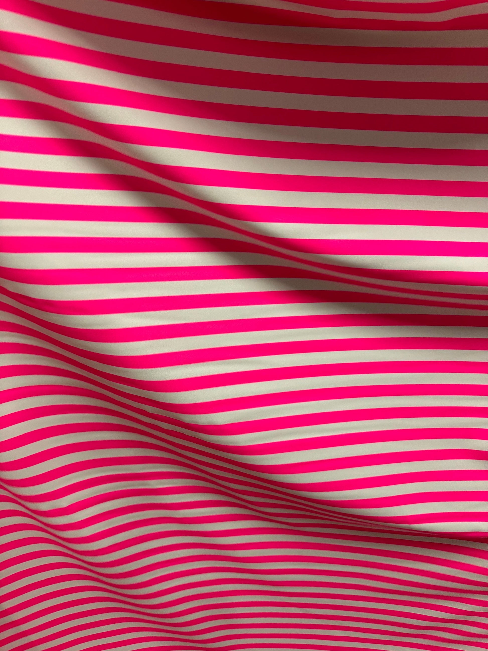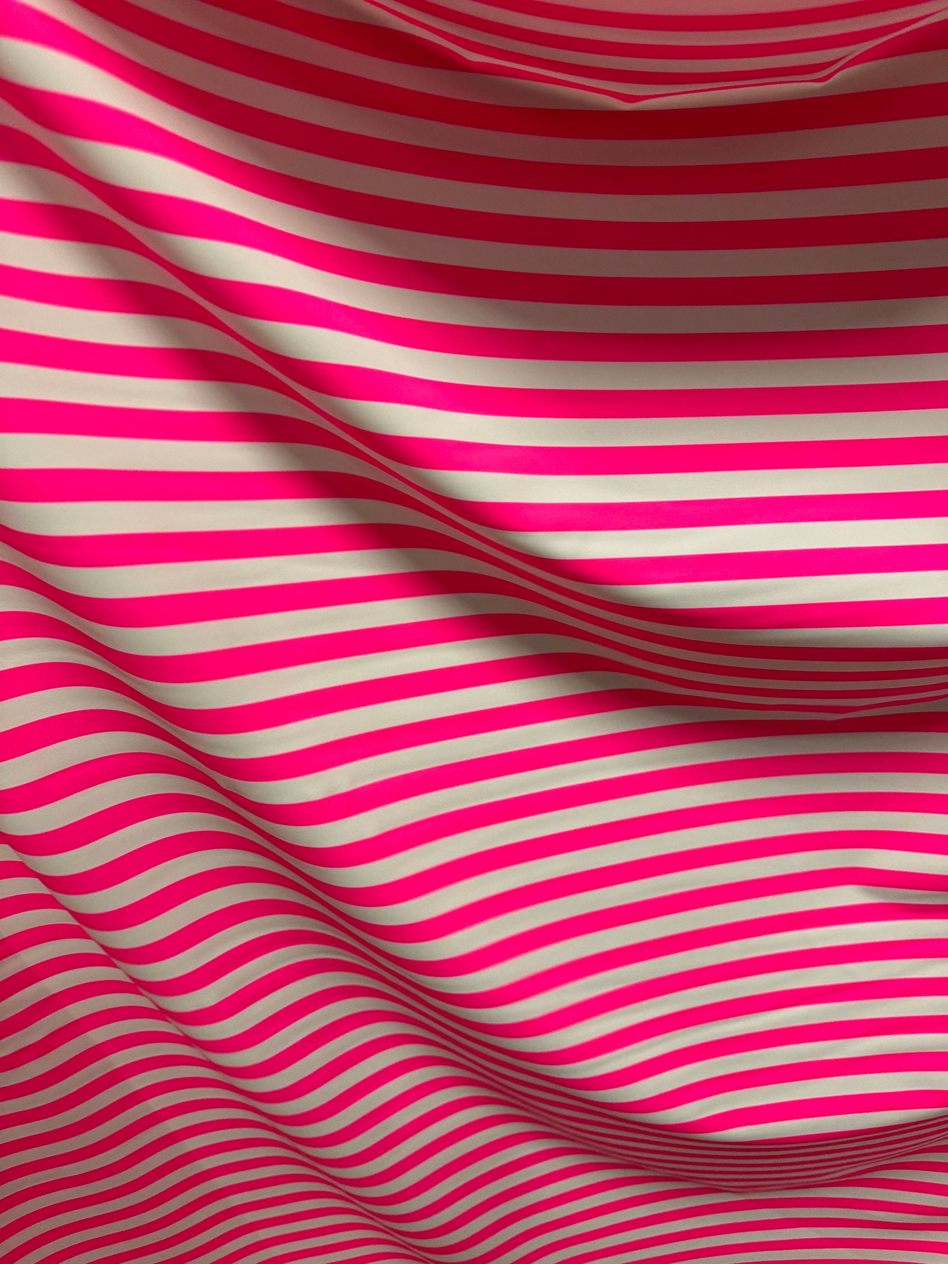 Stripe design 1/2” size neon pink/white print on best quality of nylon spandex 4-way stretch 58/60” Sold by the YD. Ships worldwide from Los Angeles California USA.