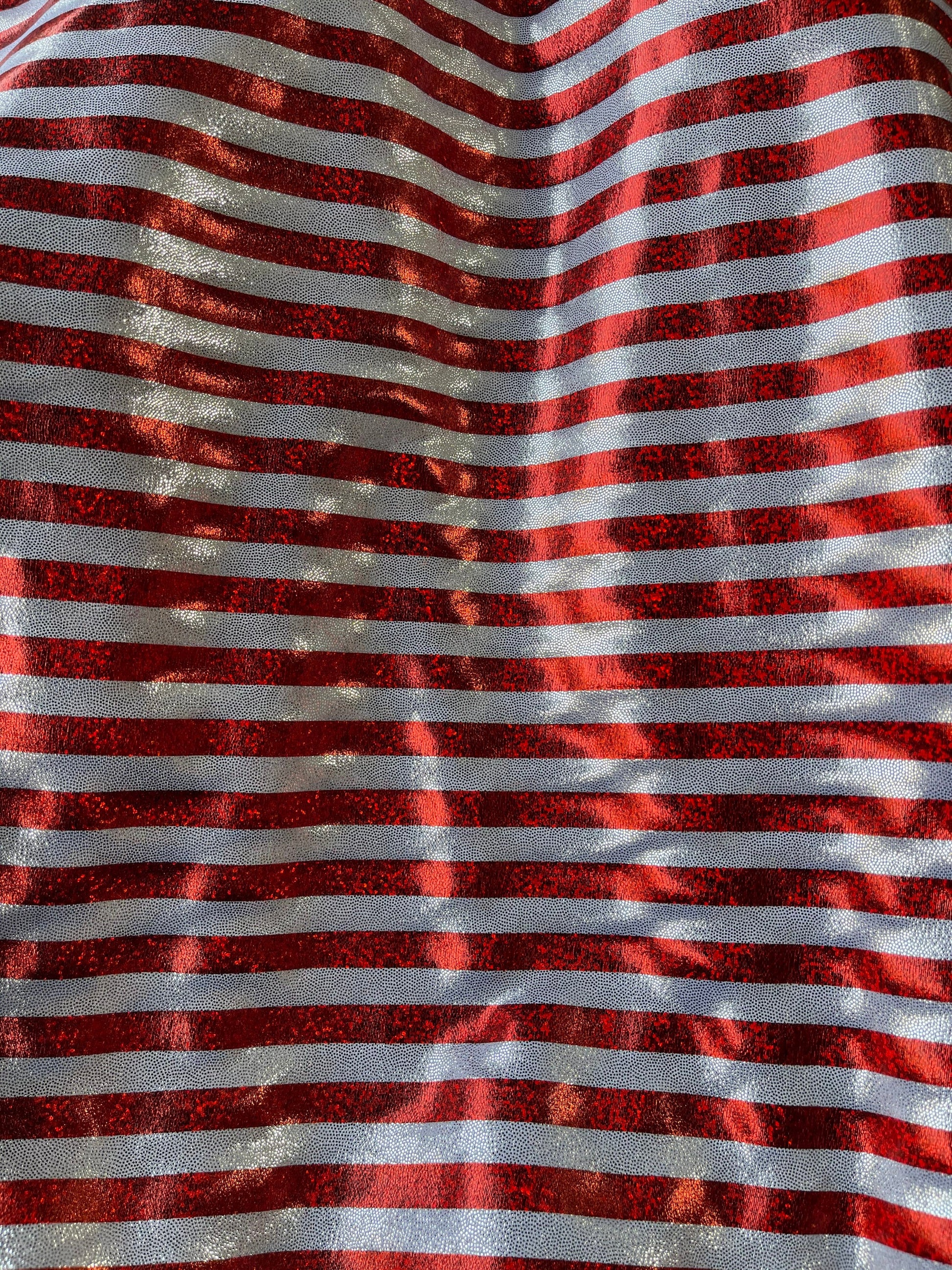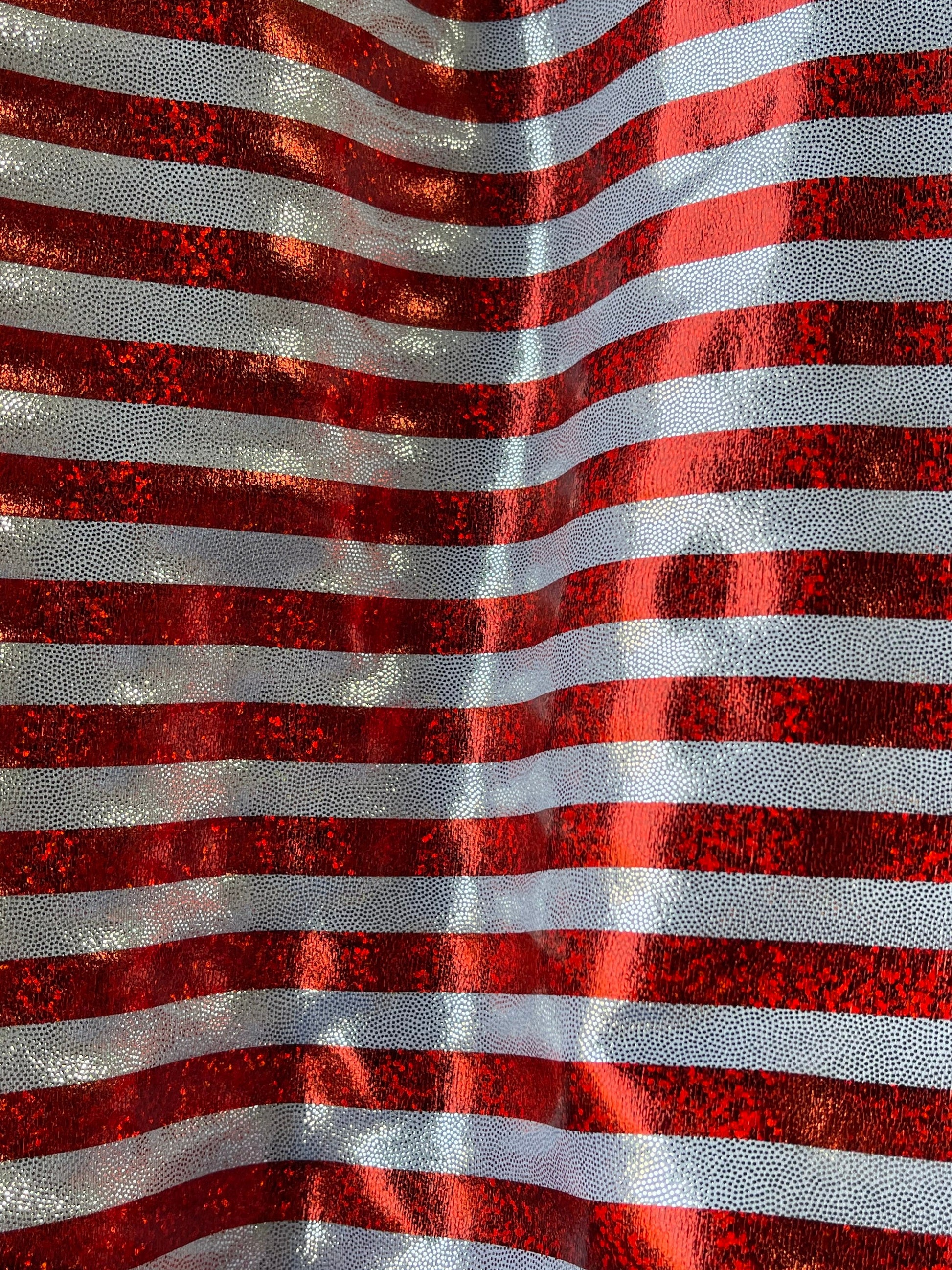 Stripes design Freedom American stripes metallic nylon spandex with foggy foil 4-way stretch 58/60” Sold by the YD. Ships Worldwide