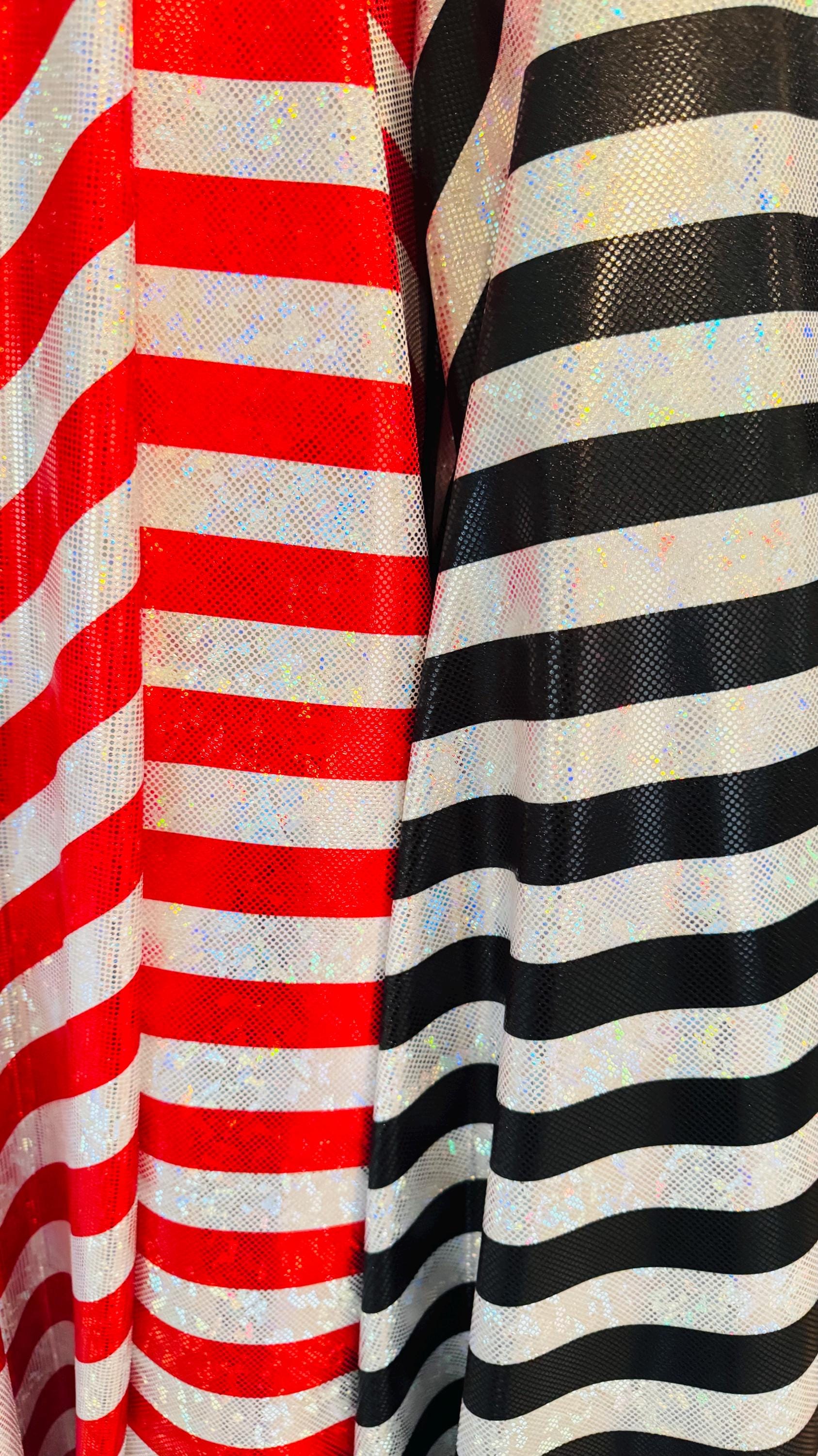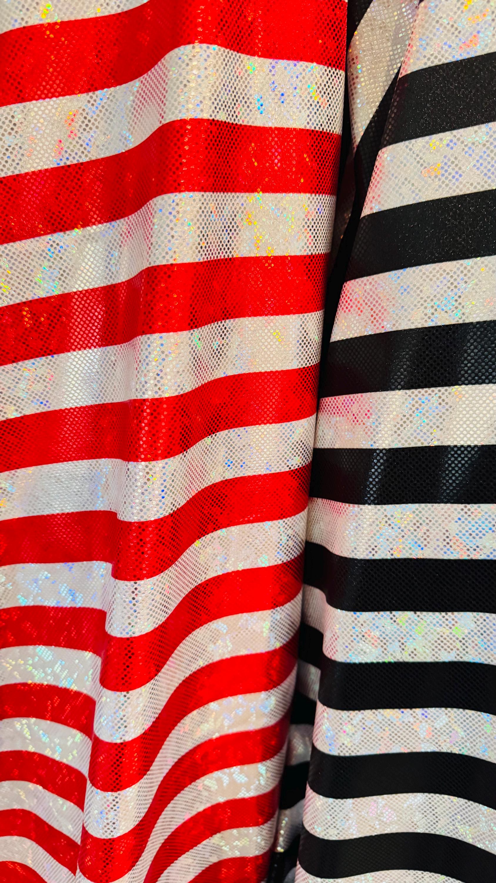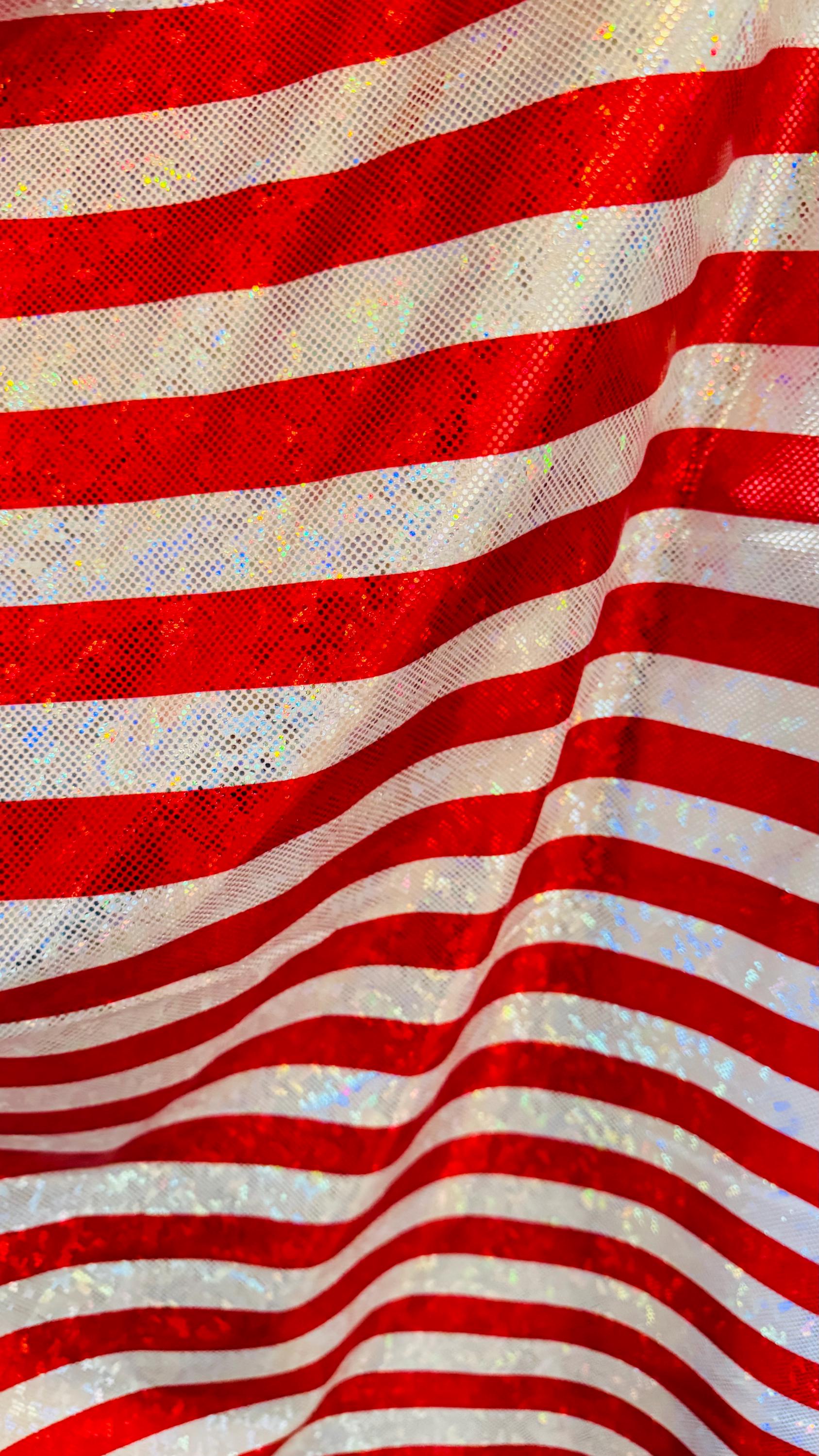 Stripes Freedom design 1” Stripe size on metallic Shattered Glass hologram nylon spandex 4-way stretch 58/60” Sold by the YD. Ships worldwide from Los Angeles California USA. High quality fabrics by AlexLAFabrics