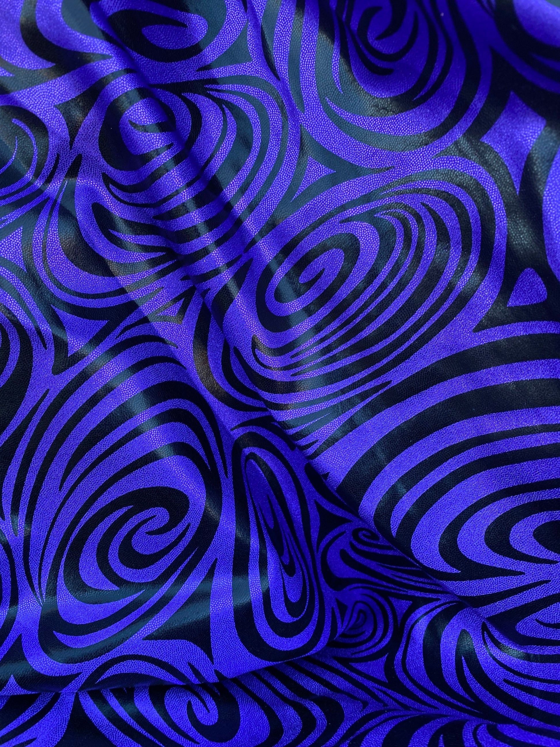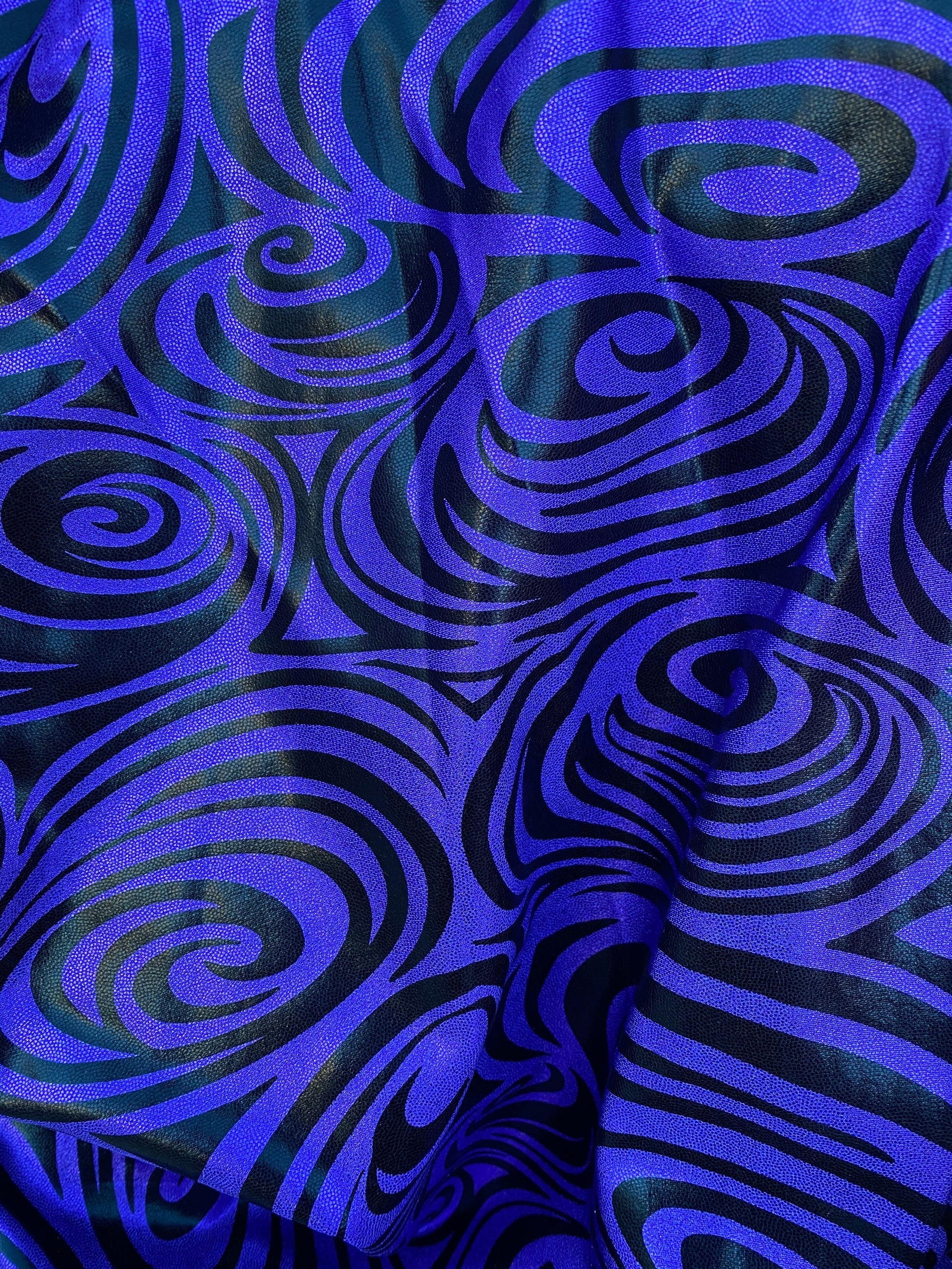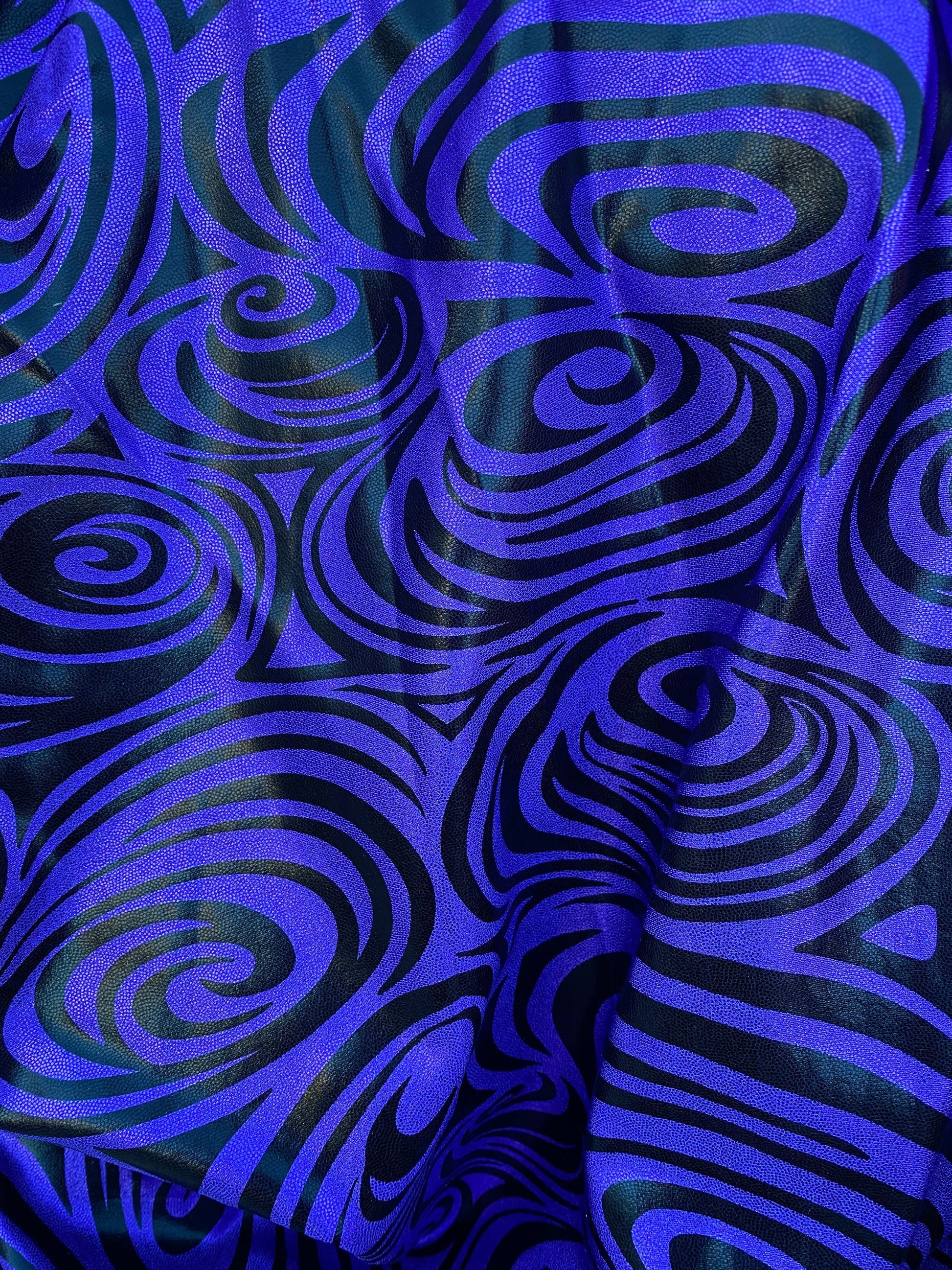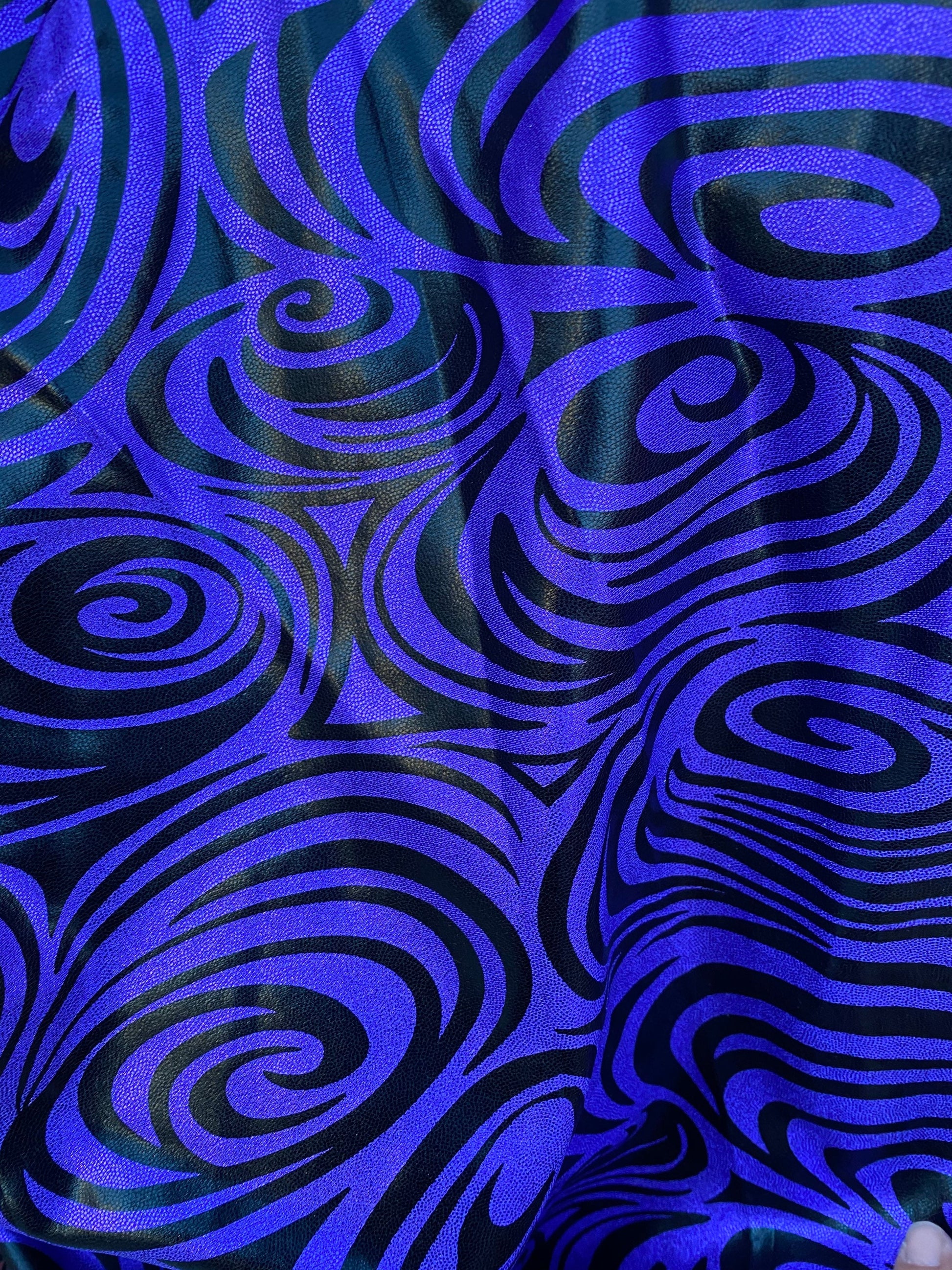 Swirl design print on purple foggy foil metallic nylon spandex 4-way stretch 58/60” Sold by the YD. Ships Worldwide from L.A.