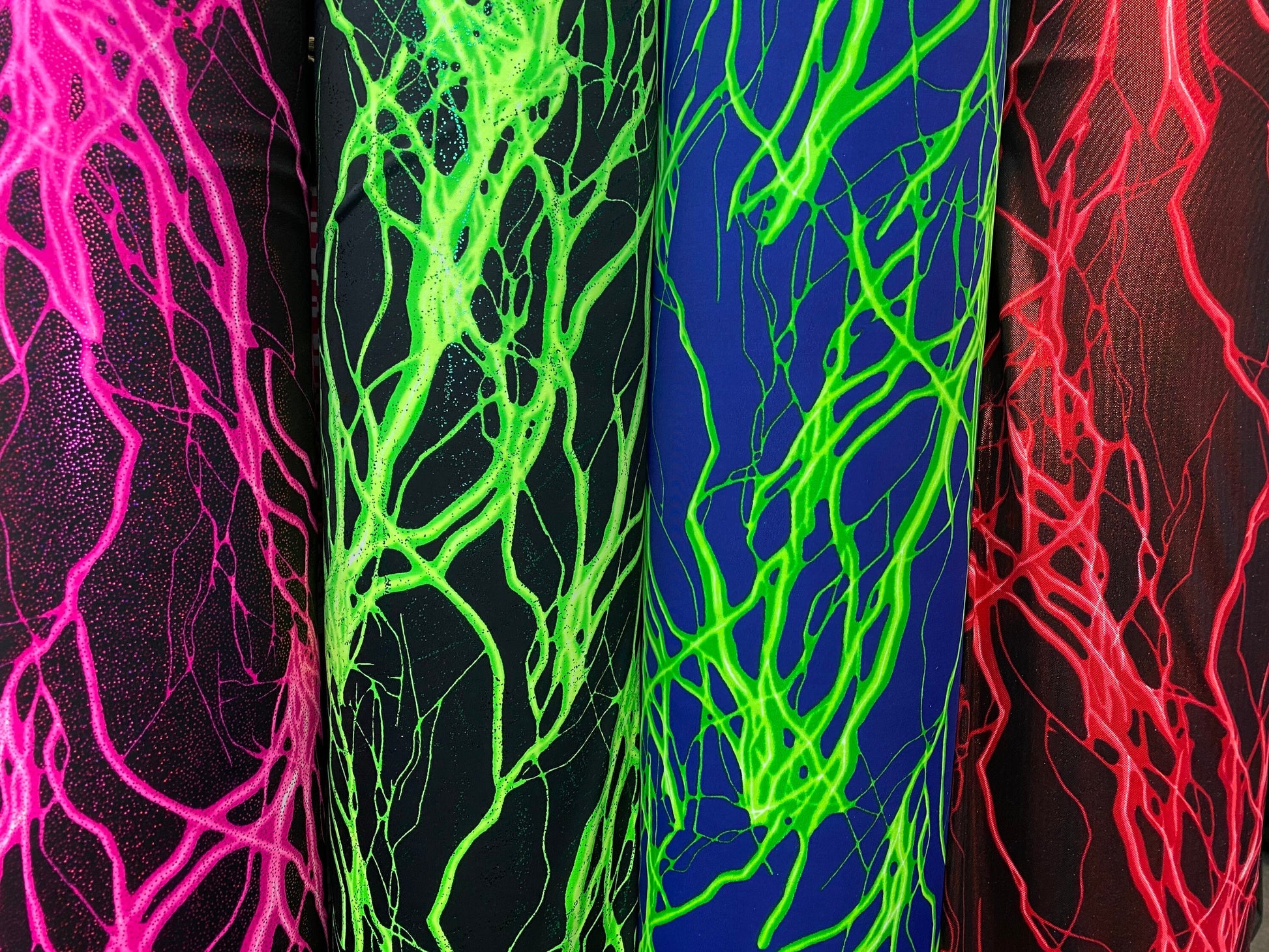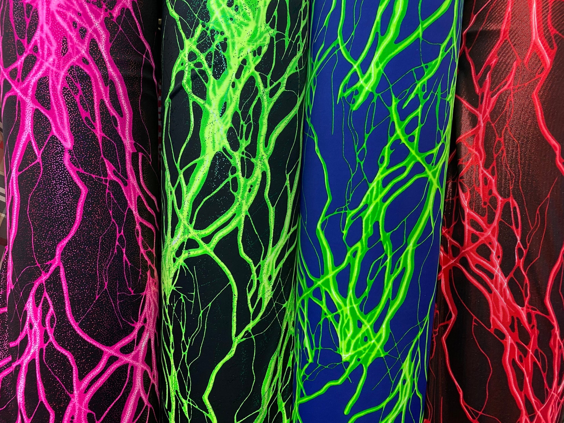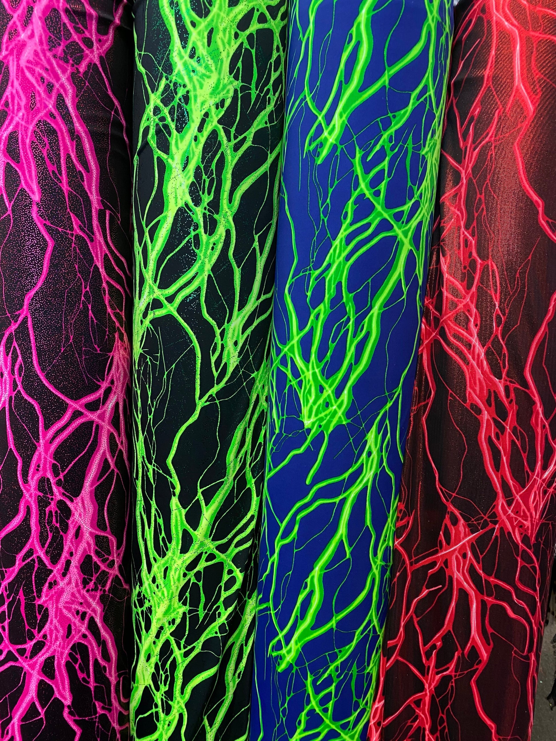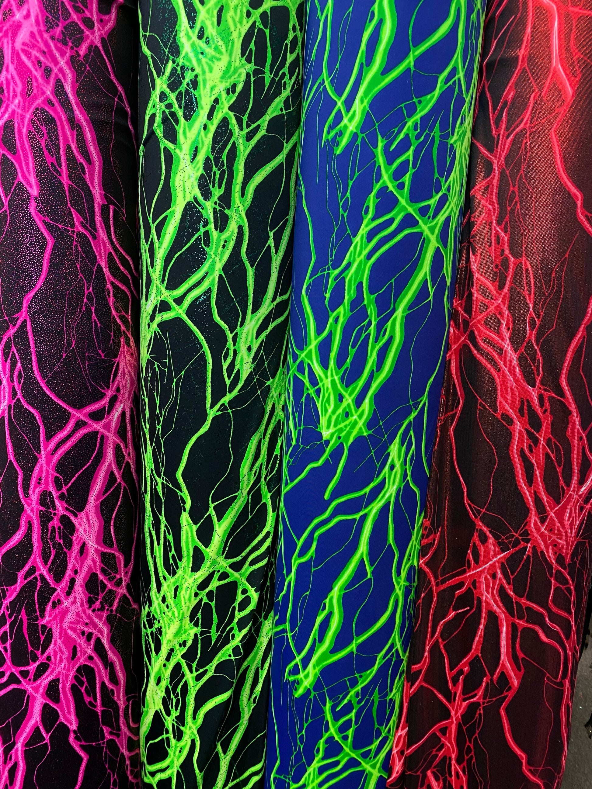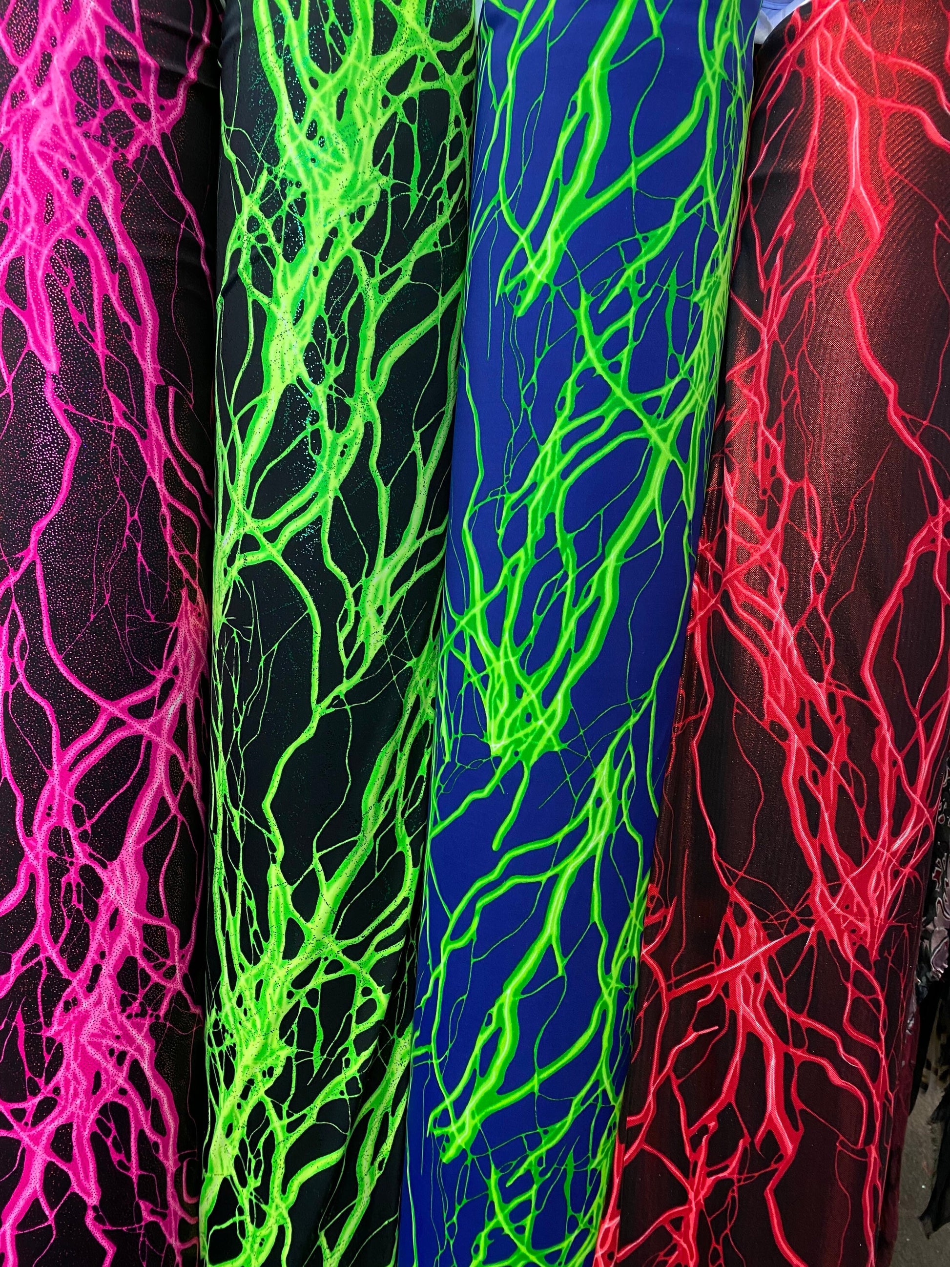 Thunder design print on great quality of nylon spandex with foil 4-way spandex 4-way stretch 58/60” Sold by the YD. Ships worldwide from Los Angeles California USA.