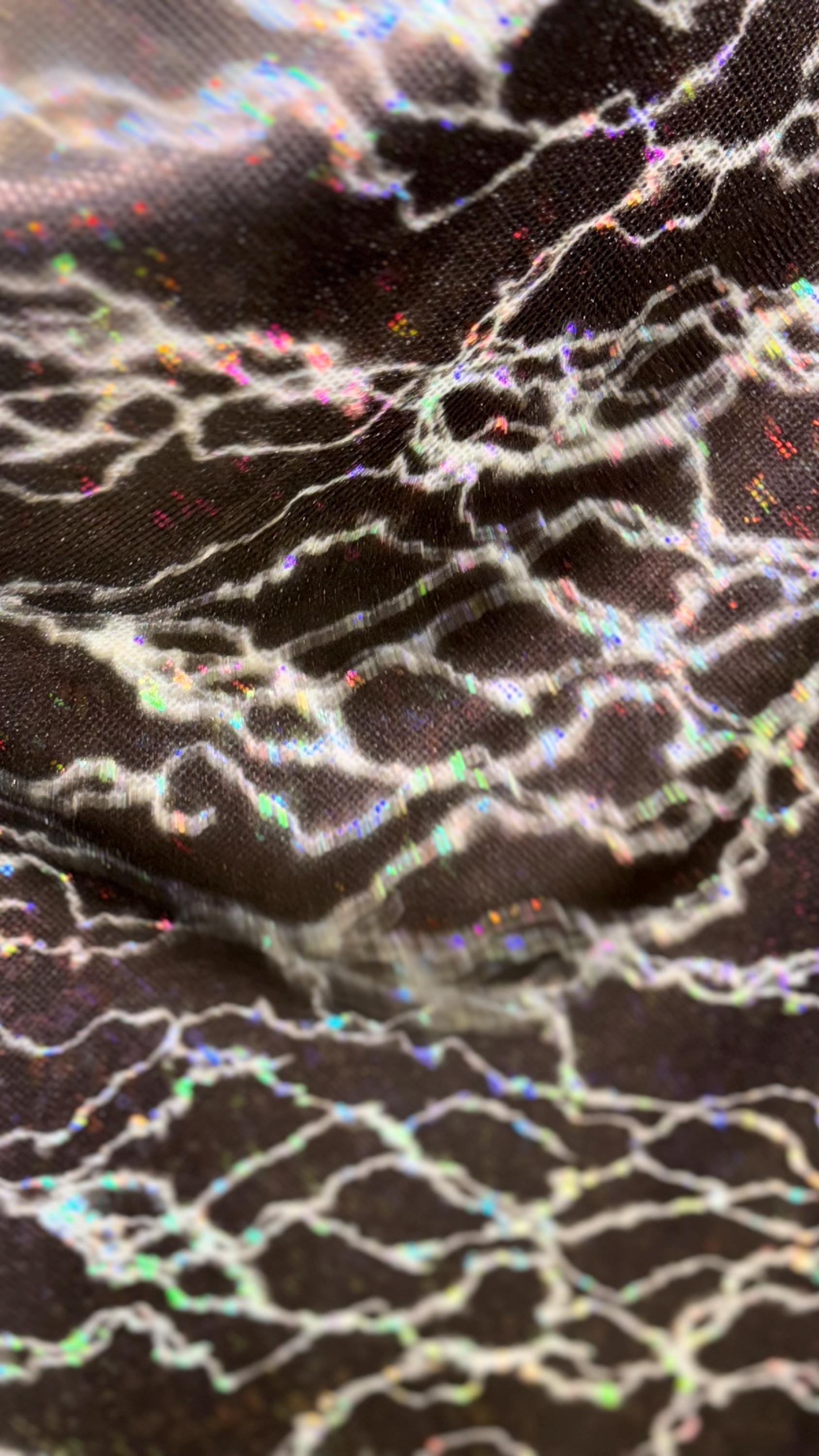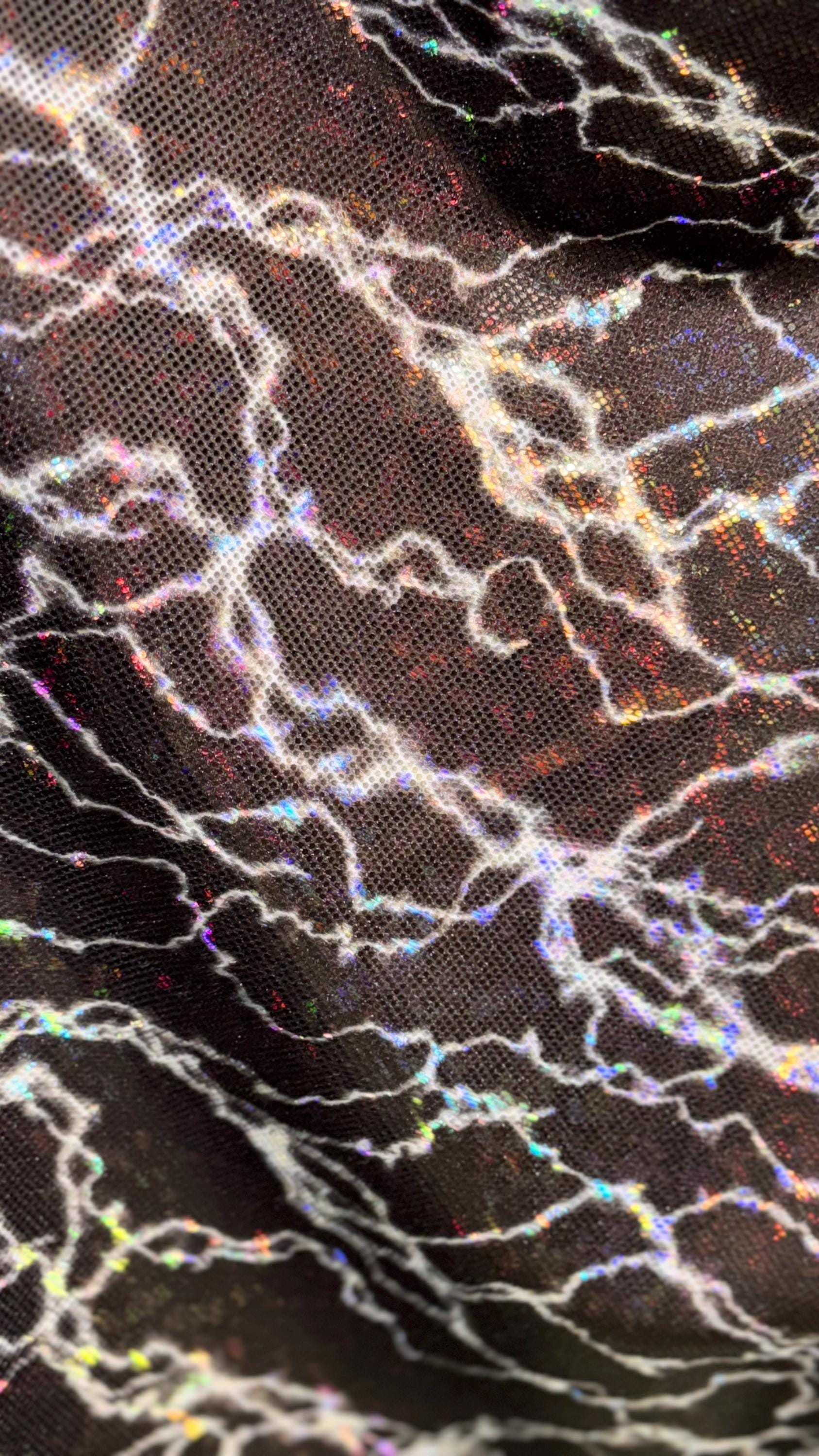 Thunderbolt design on shattered glass metallic hologram nylon spandex 4way Stretch 58/60" Sold by the YD. Ships worldwide from Los Angeles California USA. High quality fabrics by AlexLAFabrics