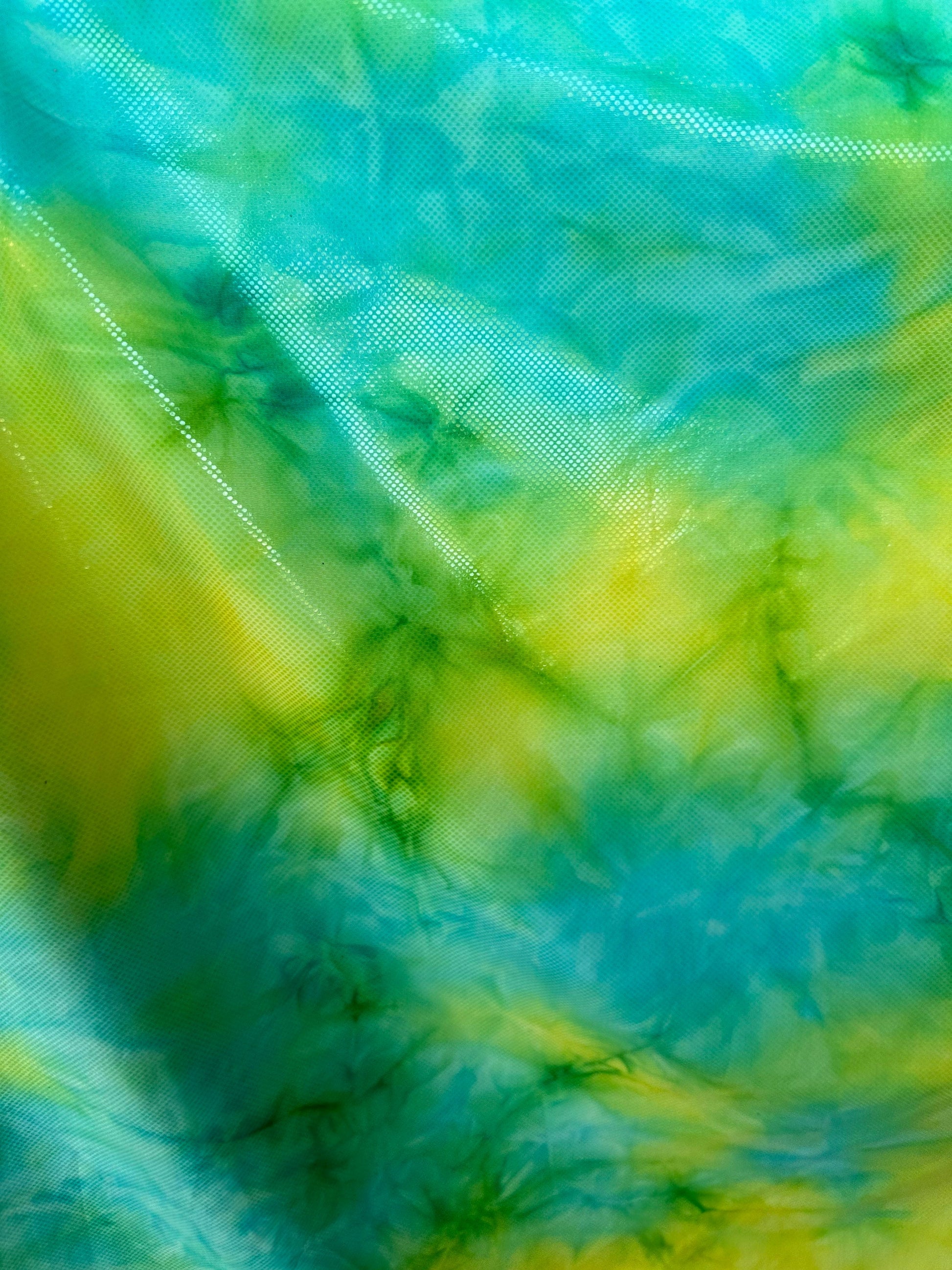 Tie dye design aqua/yellow/green metallic nylon spandex 4-way stretch 58/60” Sold by the YD. Ships worldwide from Los Angeles California USA