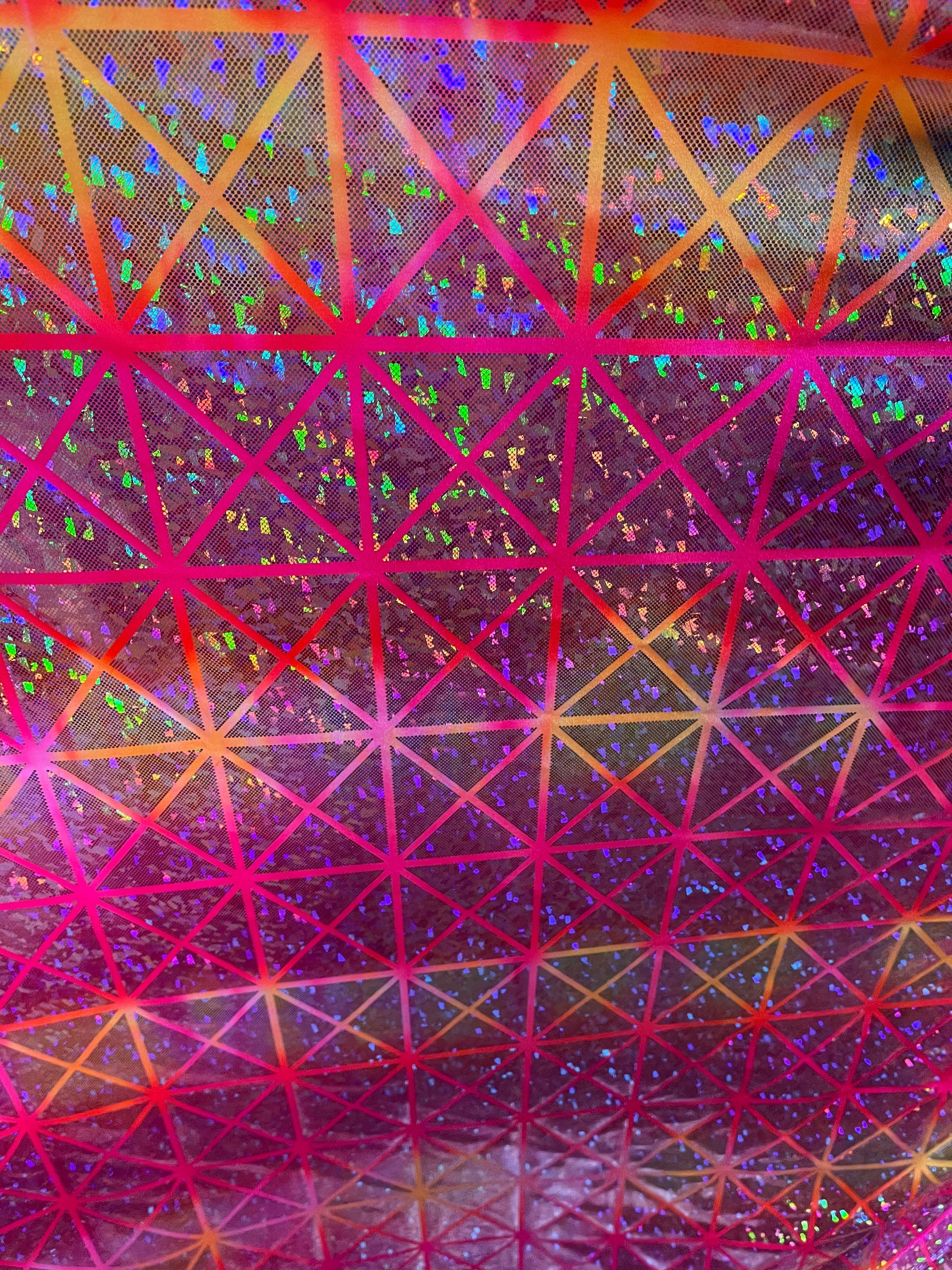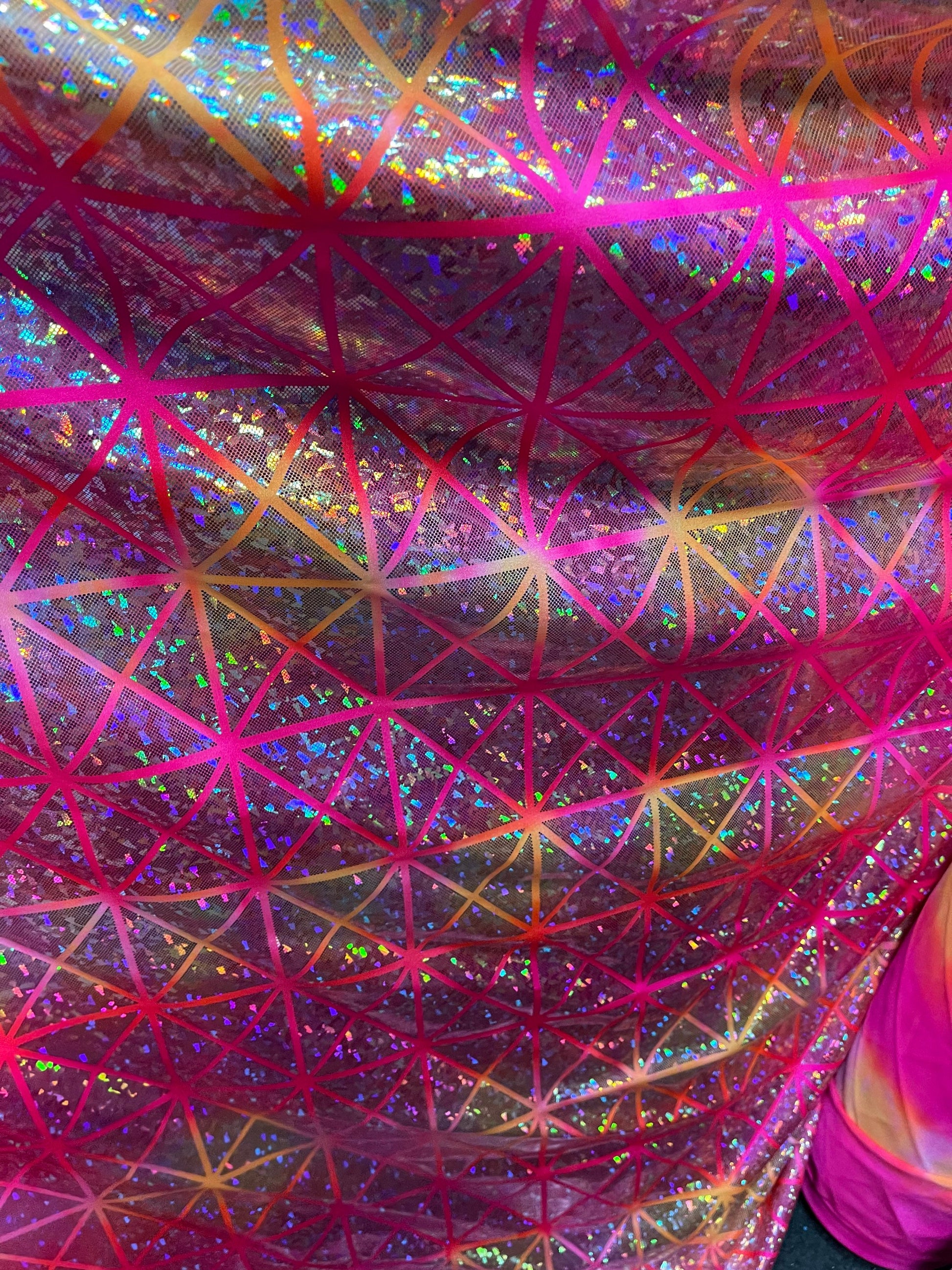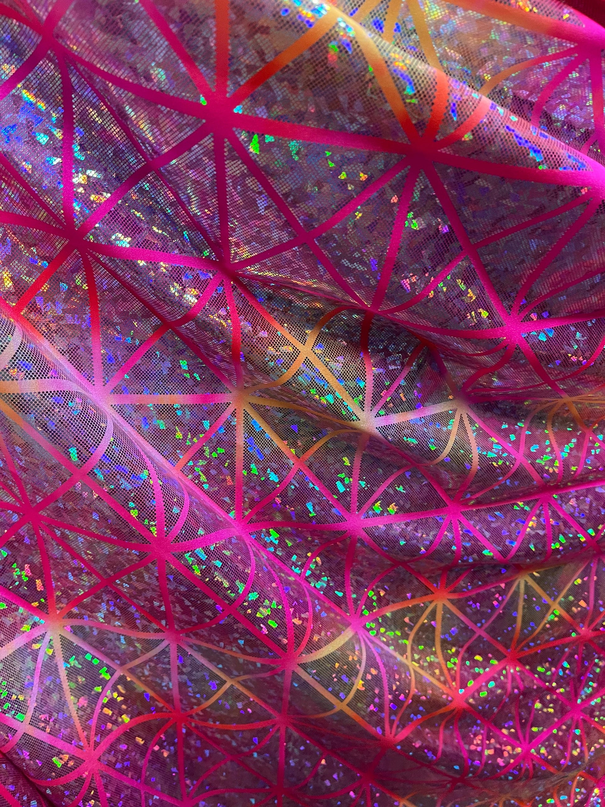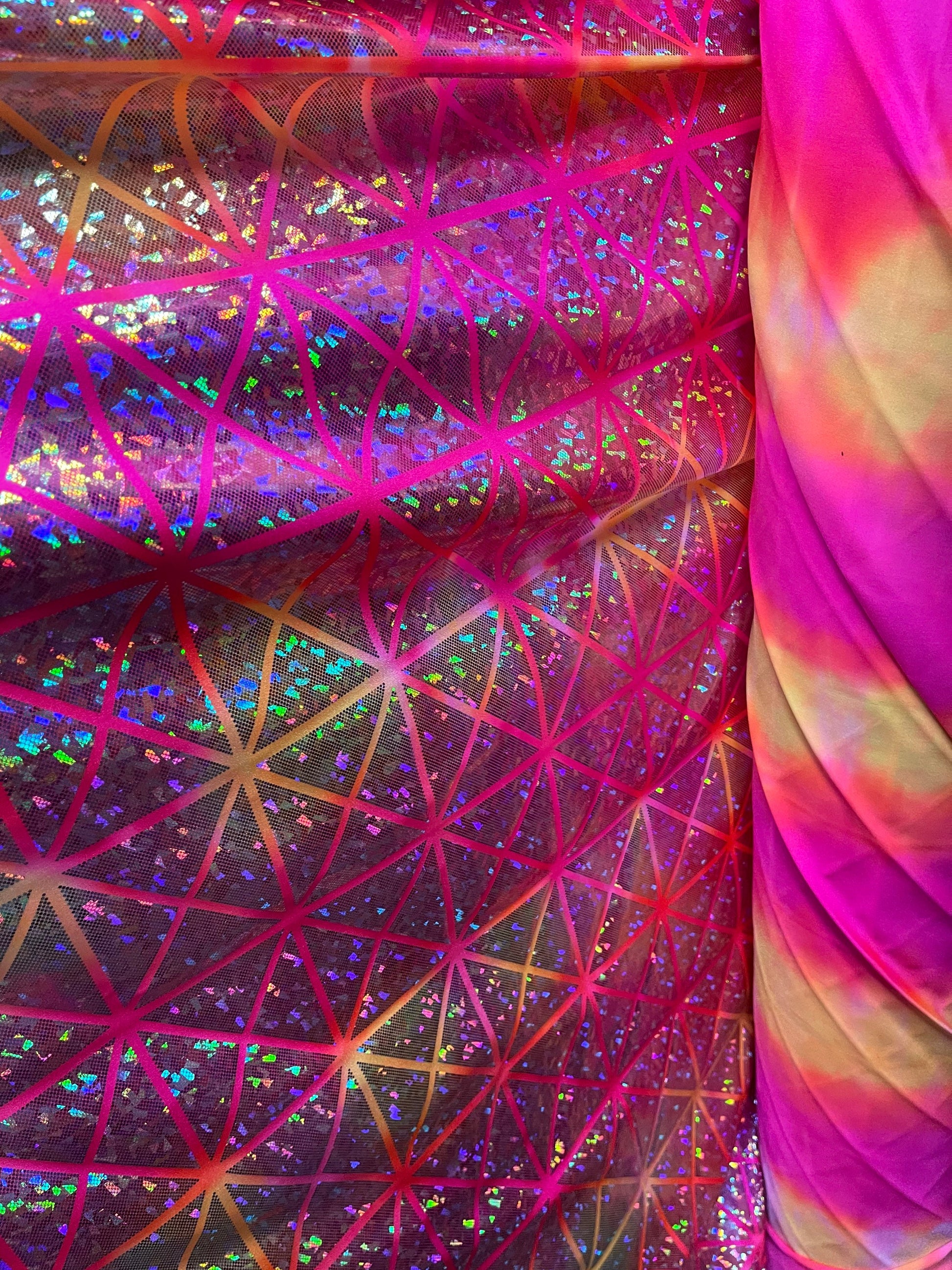 Triangle design hologram metallic nylon spandex pink/orange 4-way stretch 58/60” Sold by the YD. Ships Worldwide from Los Angeles California USA.