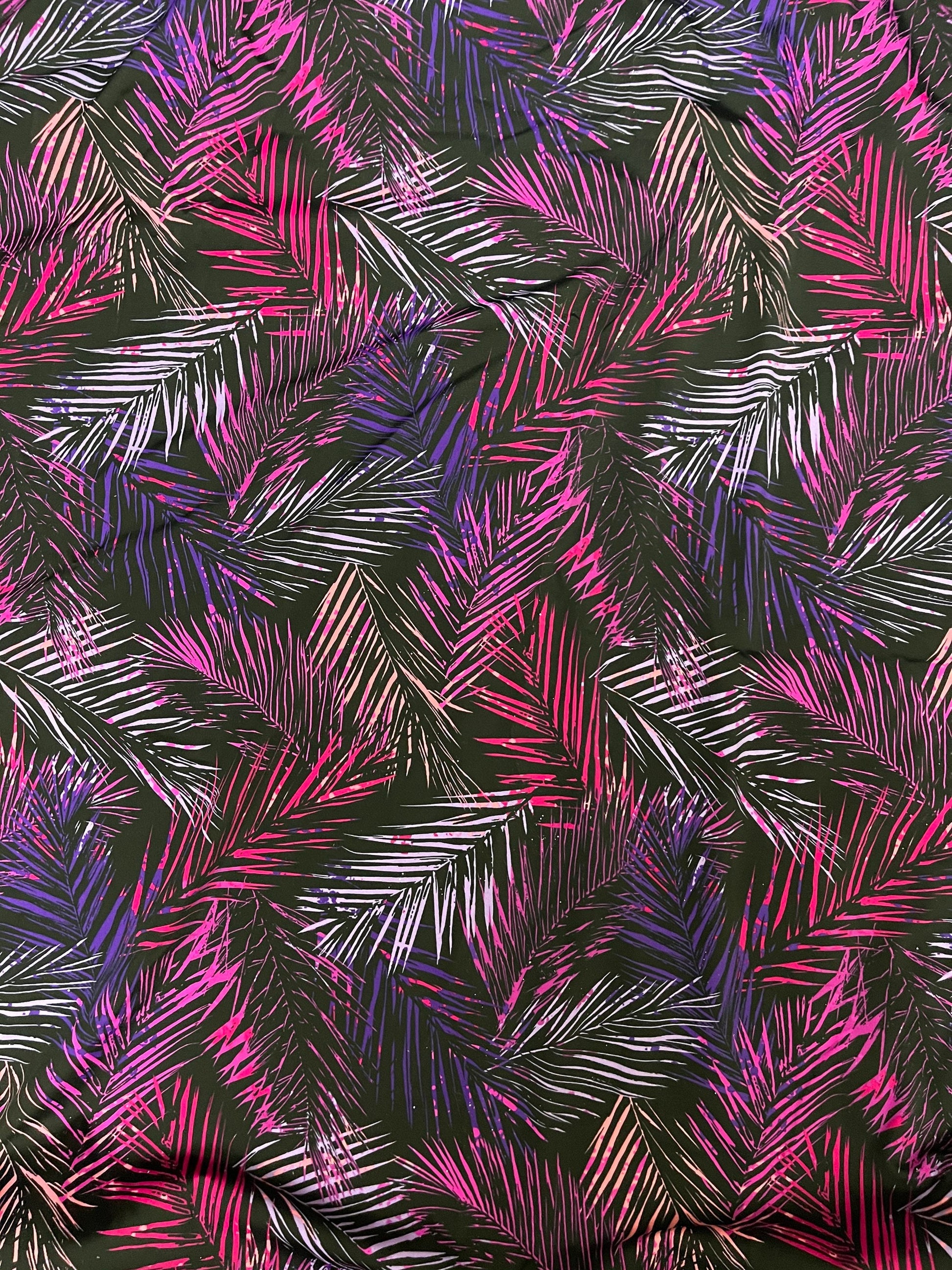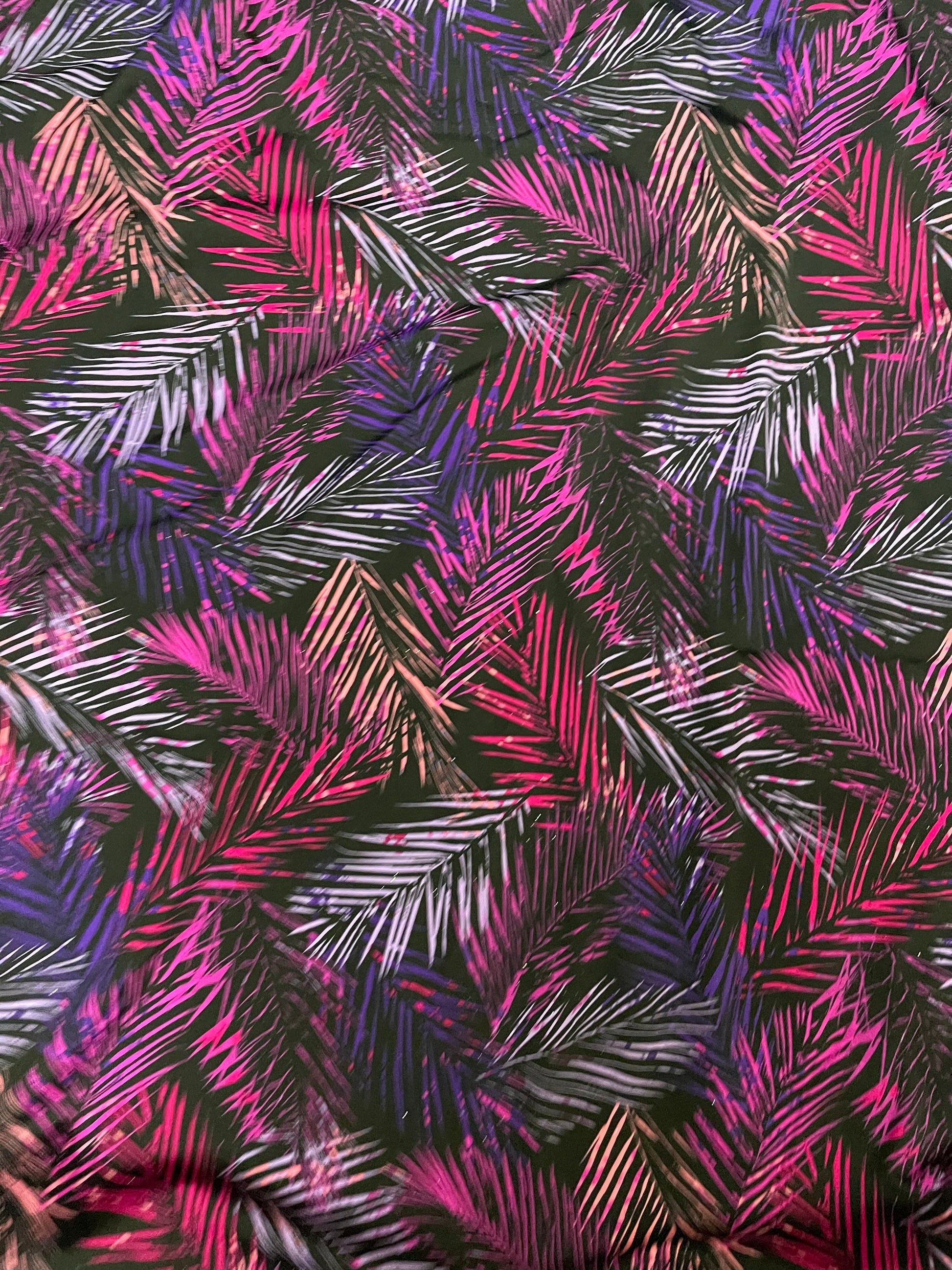 Tropical leaves design Black/Multicolor print on nylon spandex 4-way stretch 58/60” Sold by the YD. Ships Worldwide from Los Angeles California USA.