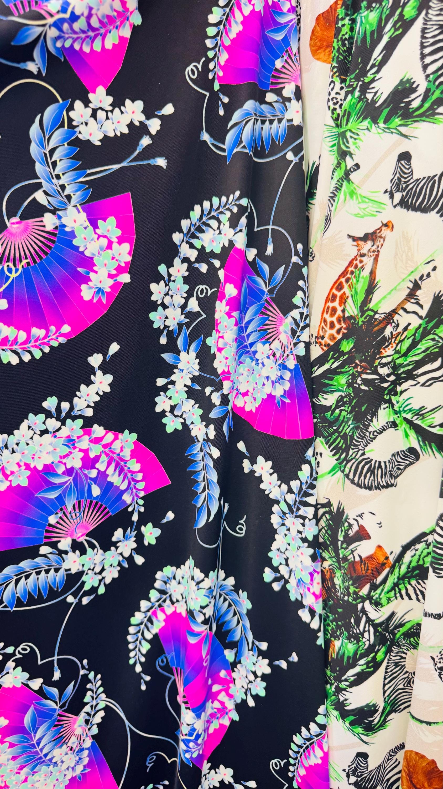 Various designs multicolor print on great quality of nylon spandex 4way stretch 58/60" Sold by the yd. Ships worldwide from Los Angeles California USA. High quality fabrics by AlexLAFabrics