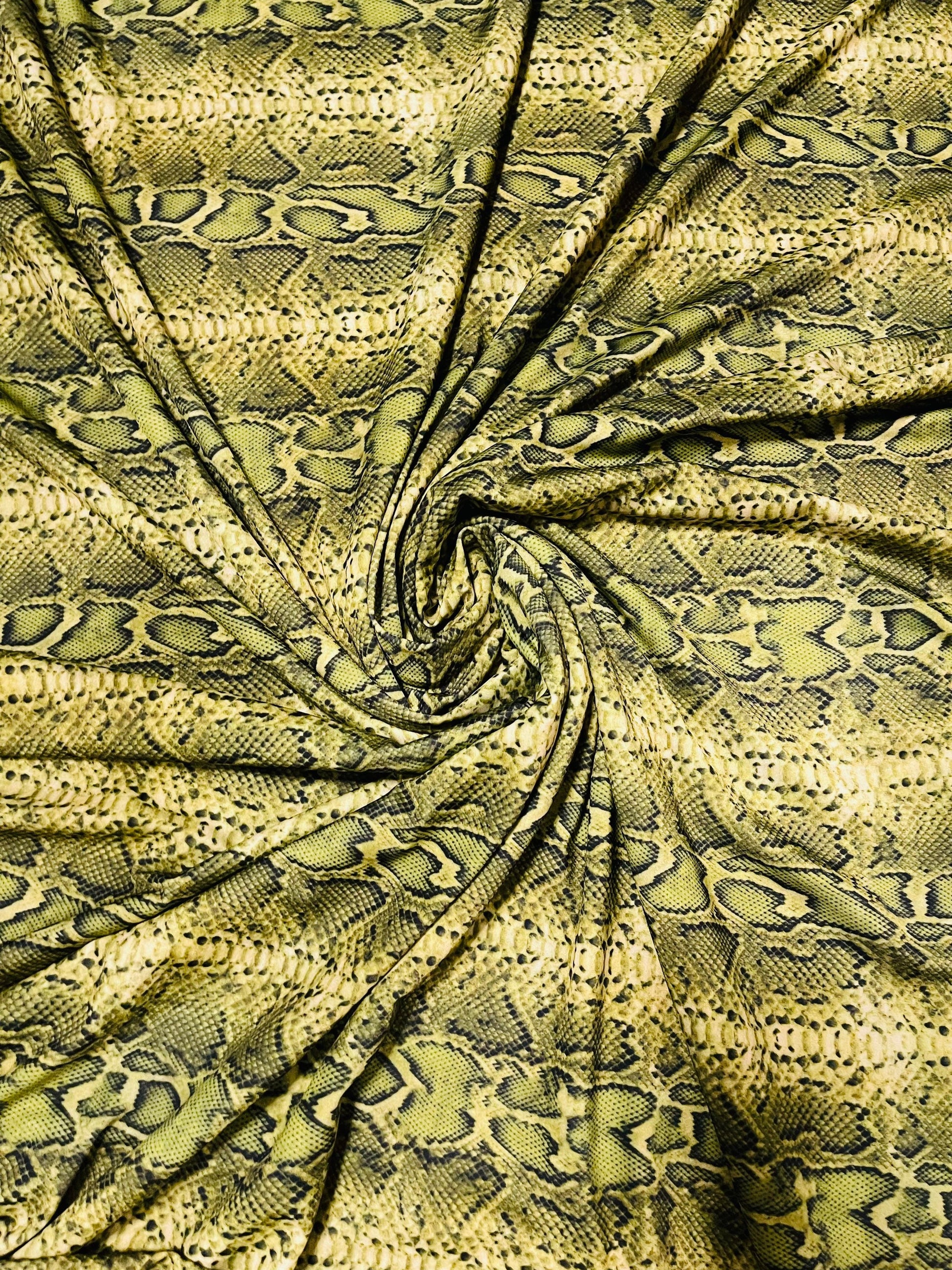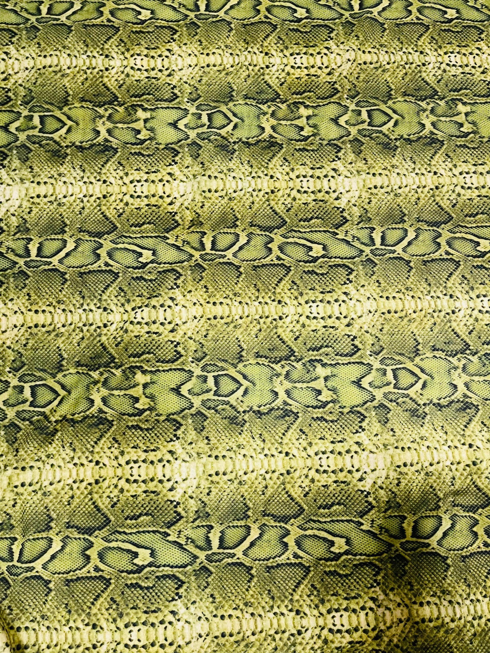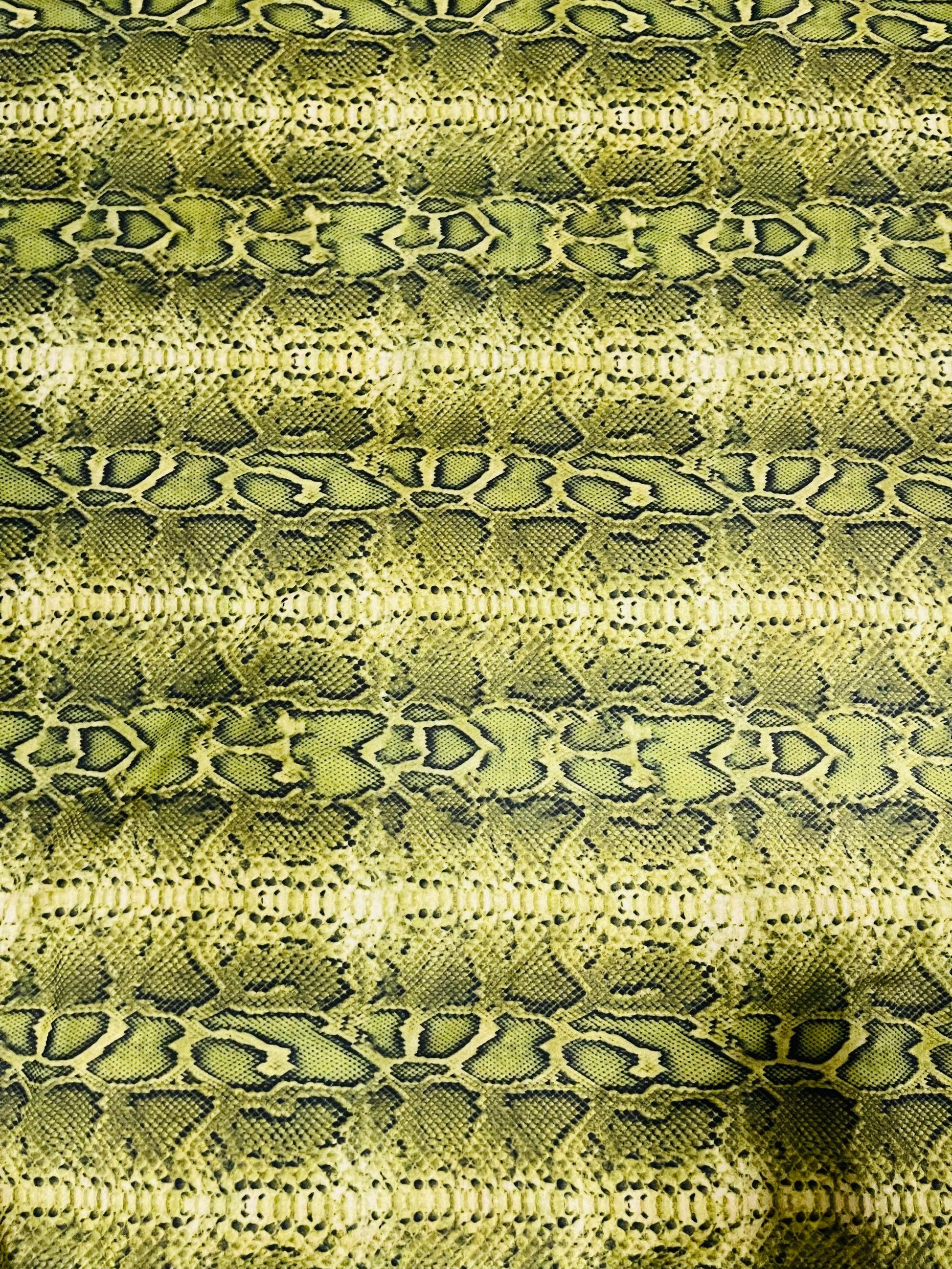 Viper green snake design print on great quality of nylon spandex 4-way stretch 58/60” Sold by the YD. Ships Worldwide from Los Angeles California USA.