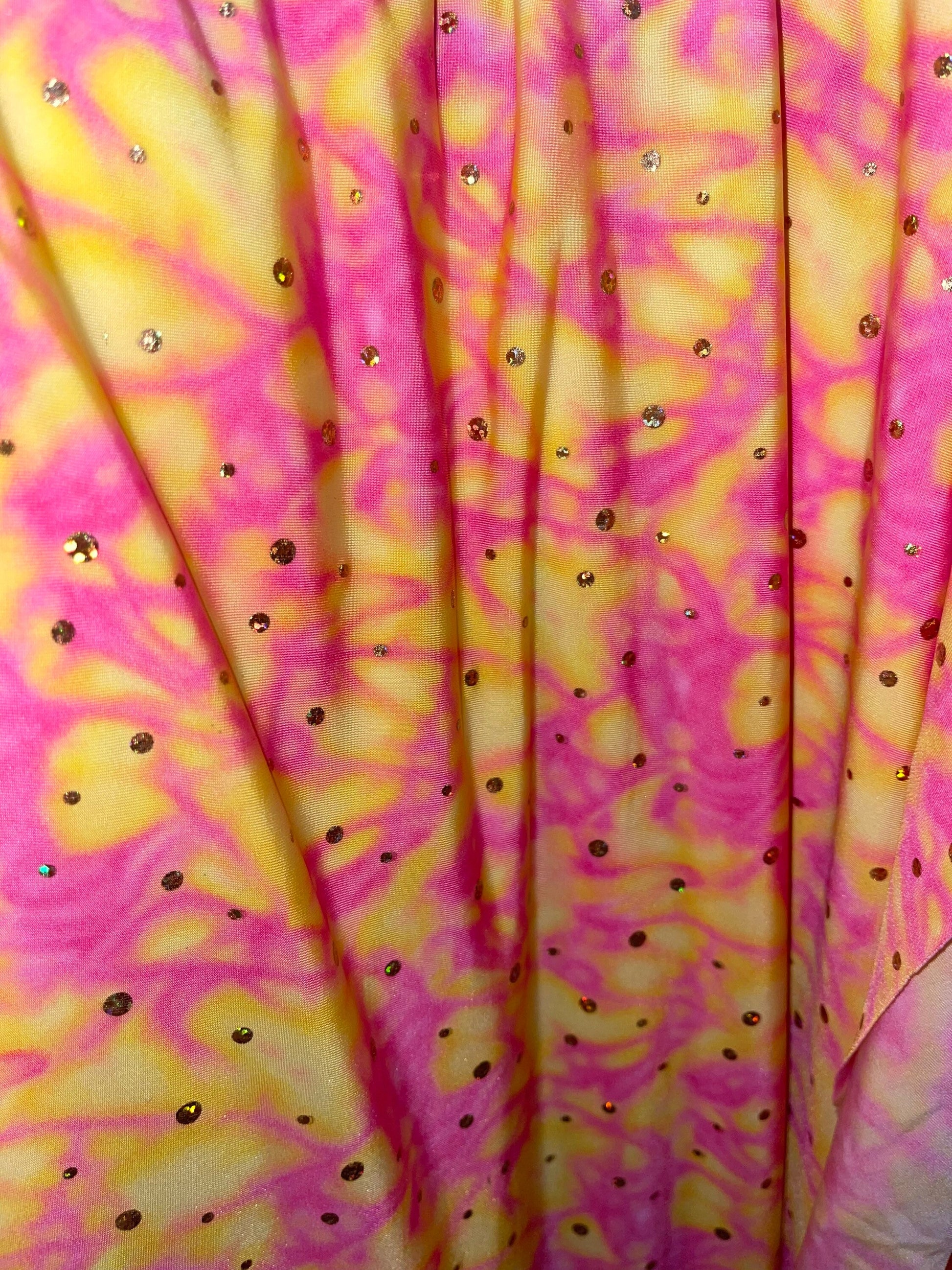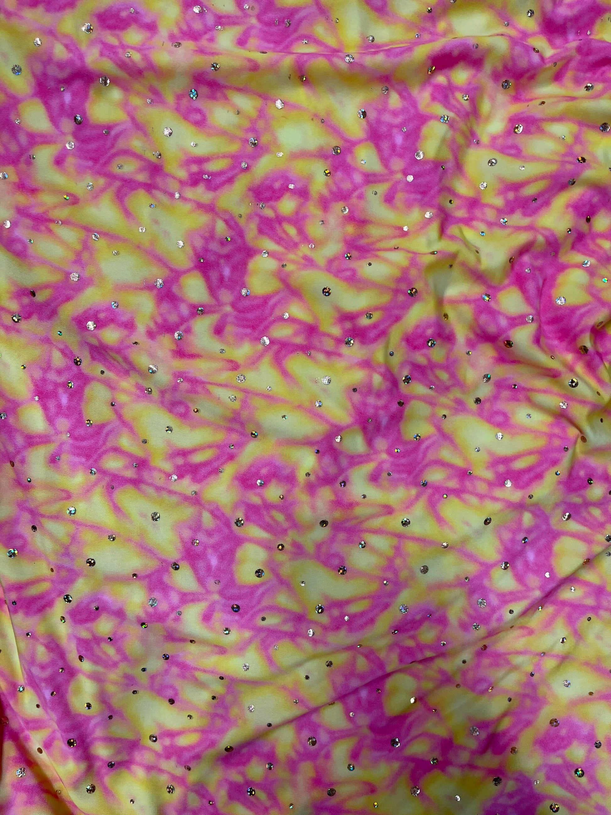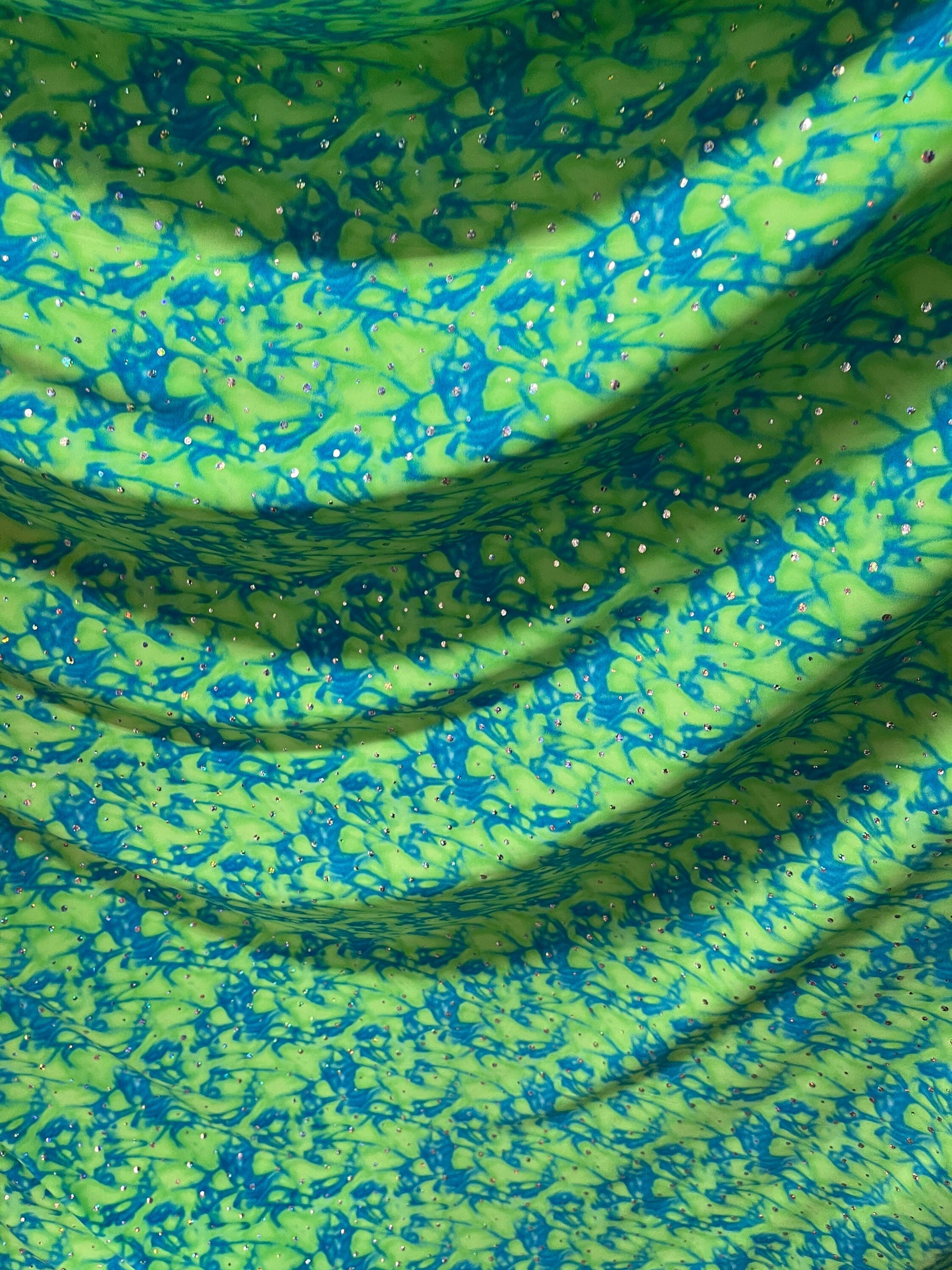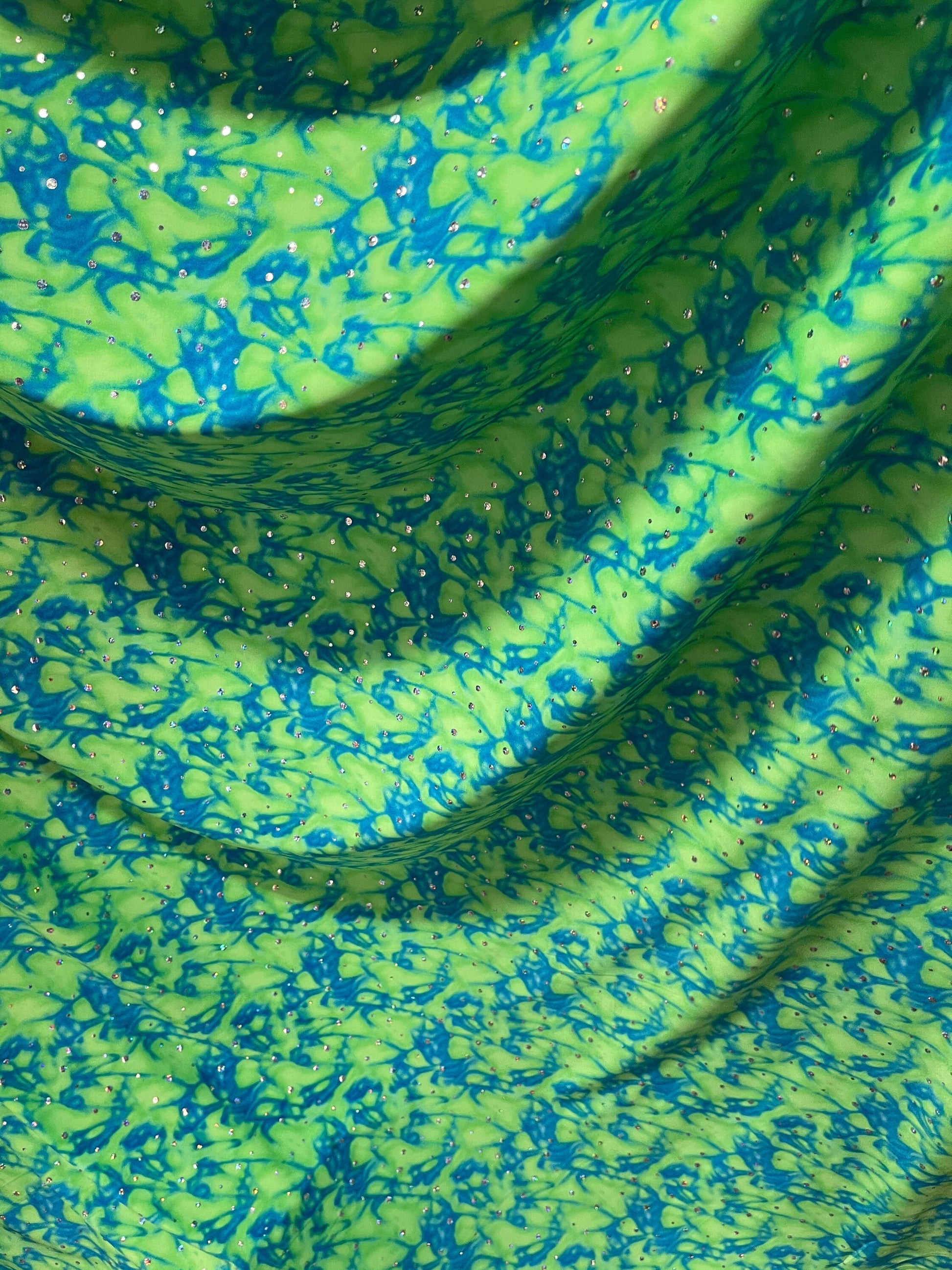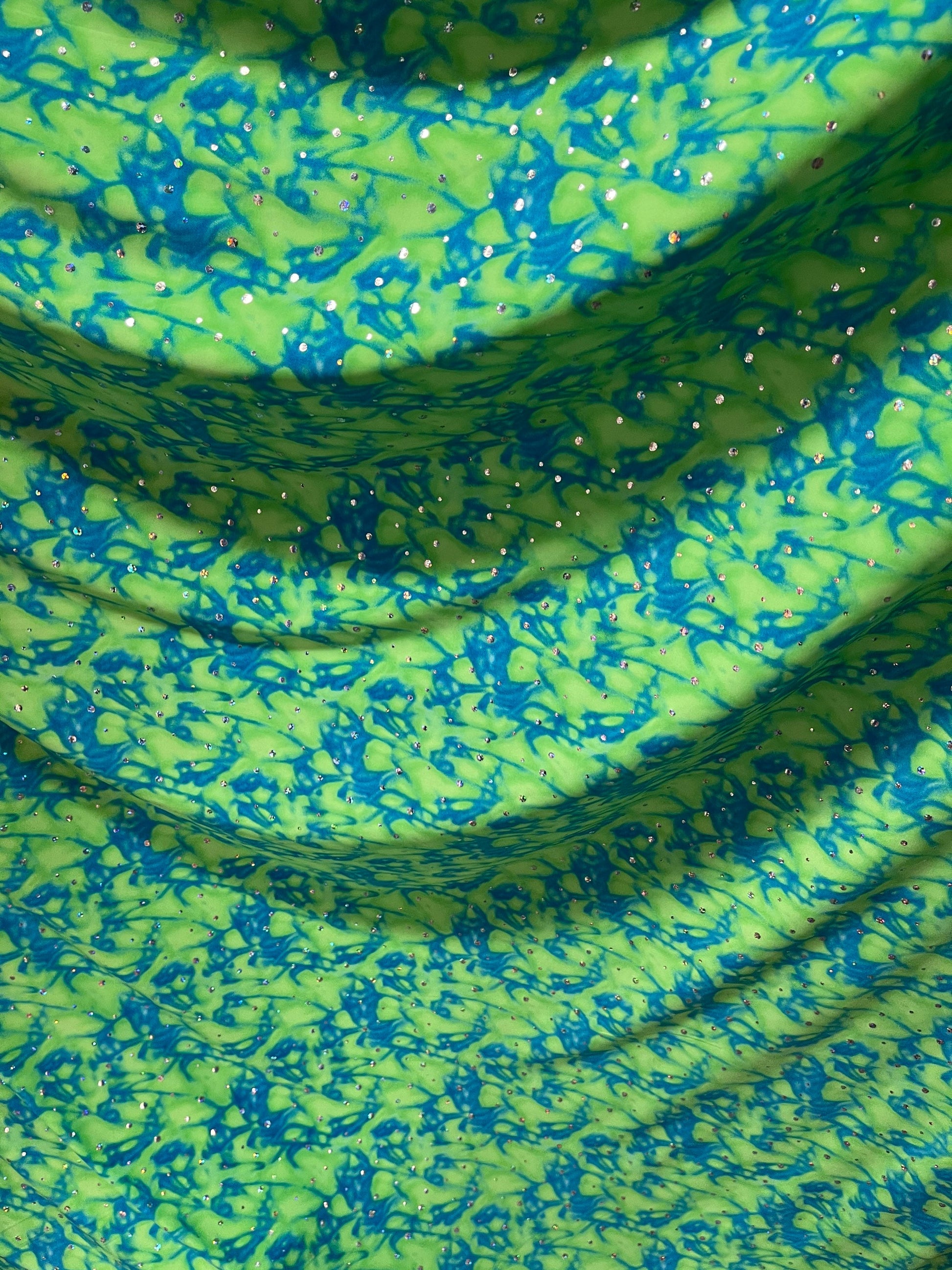 Water design Blue/green & Pink/yellow color print nylon spandex with hologram sequins 4-way stretch 58/60” Sold by the YD. Ships Worldwide From Los Angeles California USA.