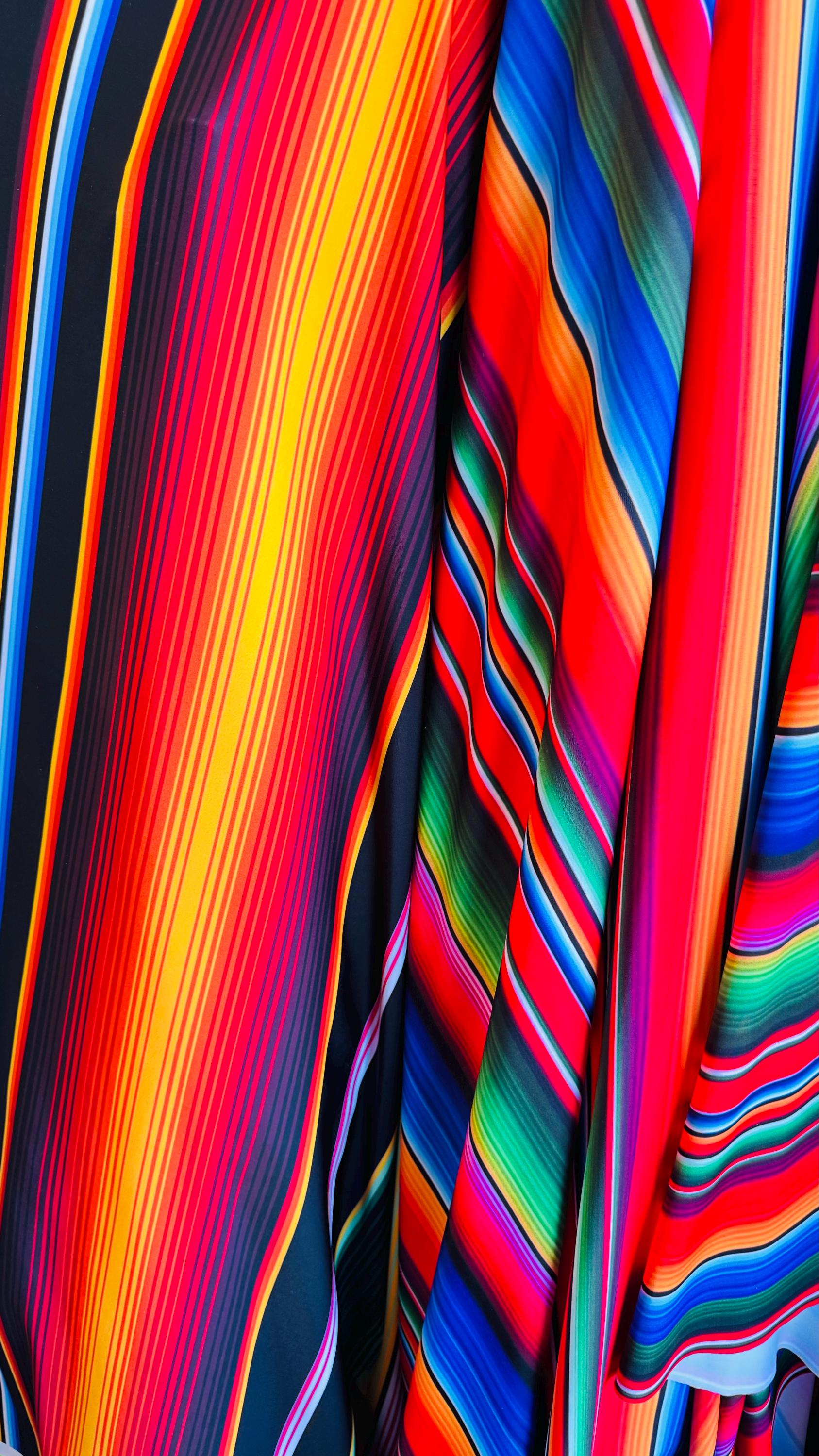 Zarape design colorful striped multicolor print on great quality of nylon spandex 4-way stretch 58/60” Sold by the YD. Ships worldwide from Los Angeles California USA. High quality fabrics by AlexLAFabrics