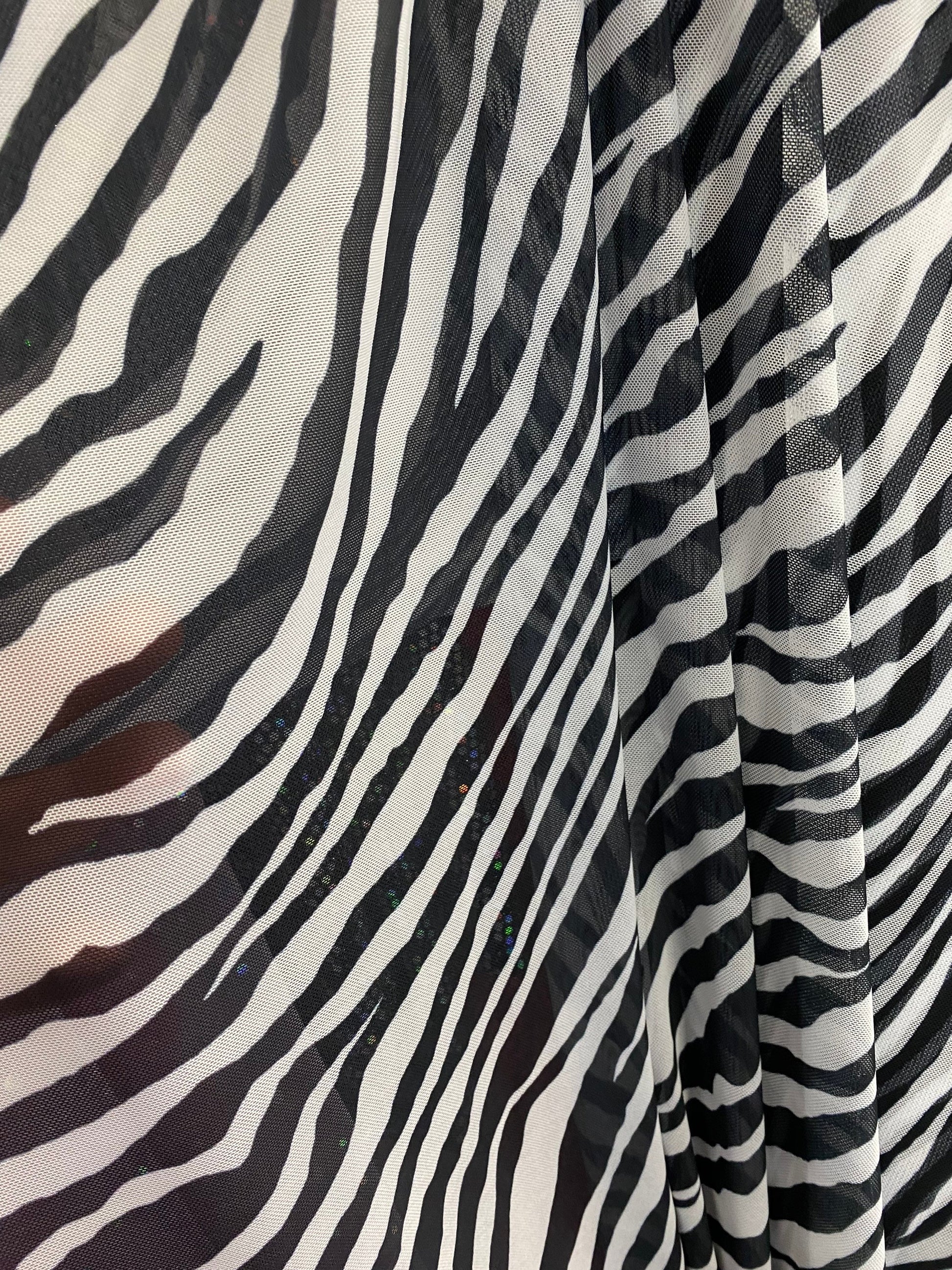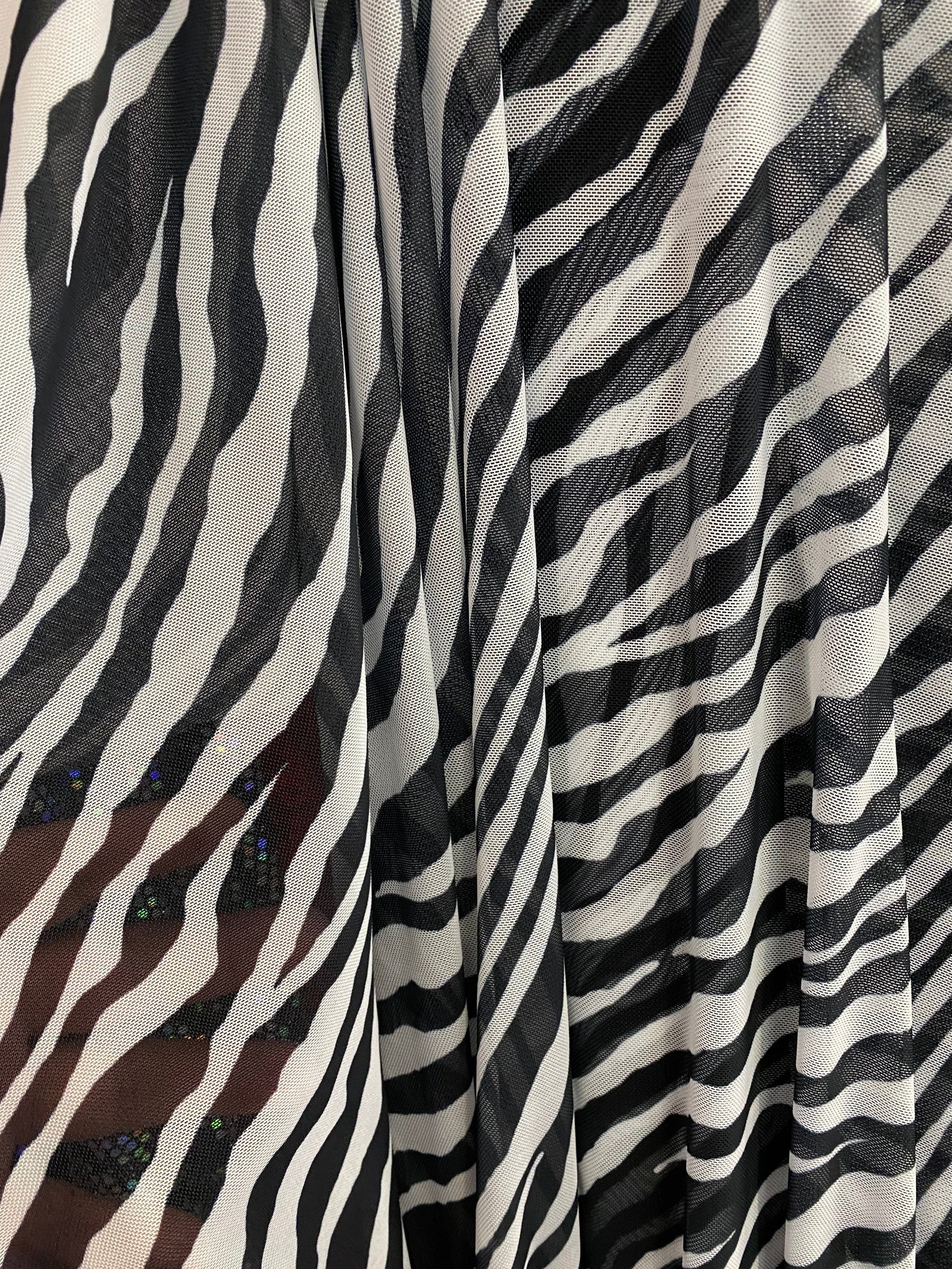 Zebra design exotic print on good quality of power mesh 4-way stretch 58/60” Sold by the YD. Ships worldwide from Los Angeles California USA.