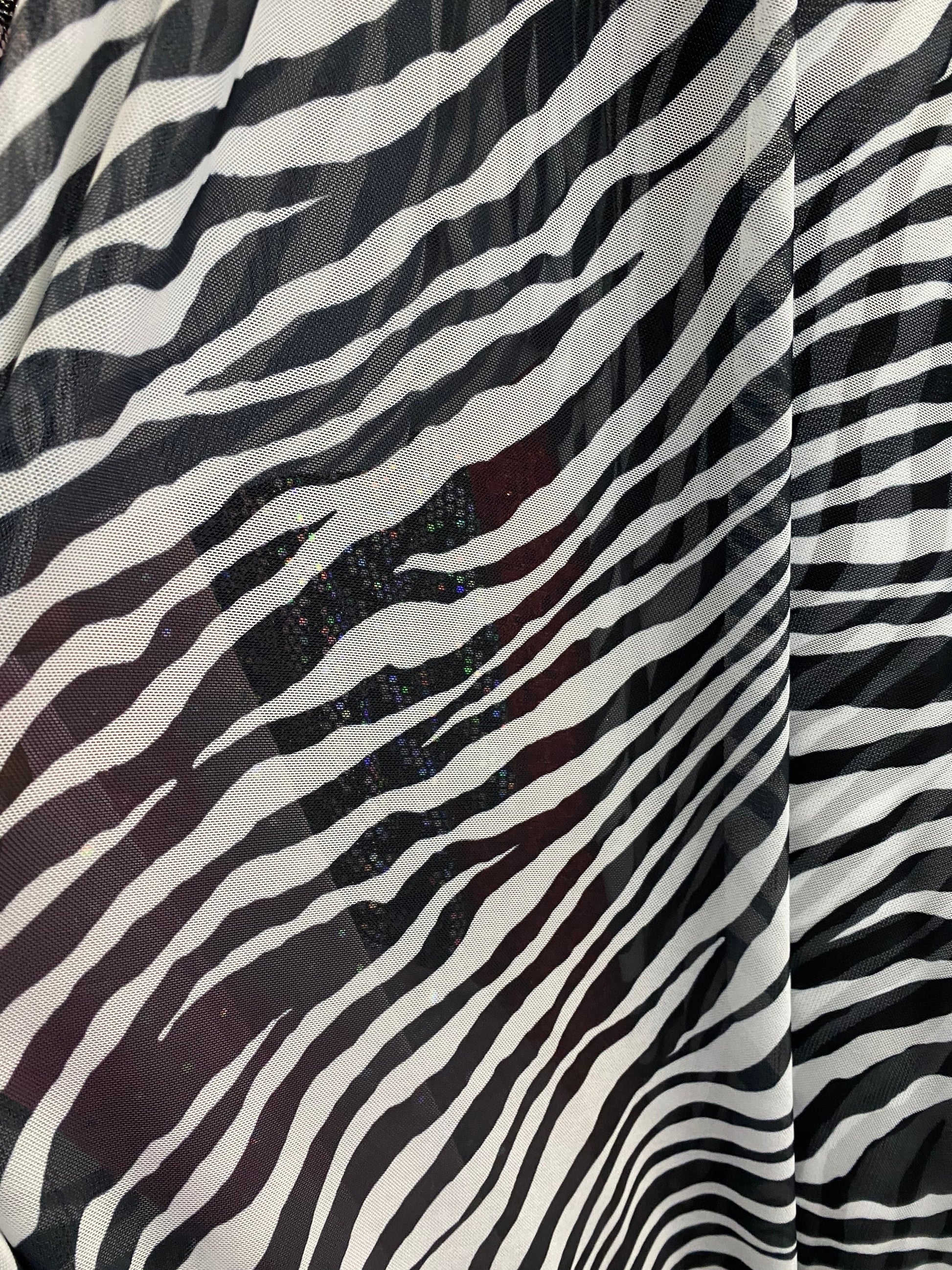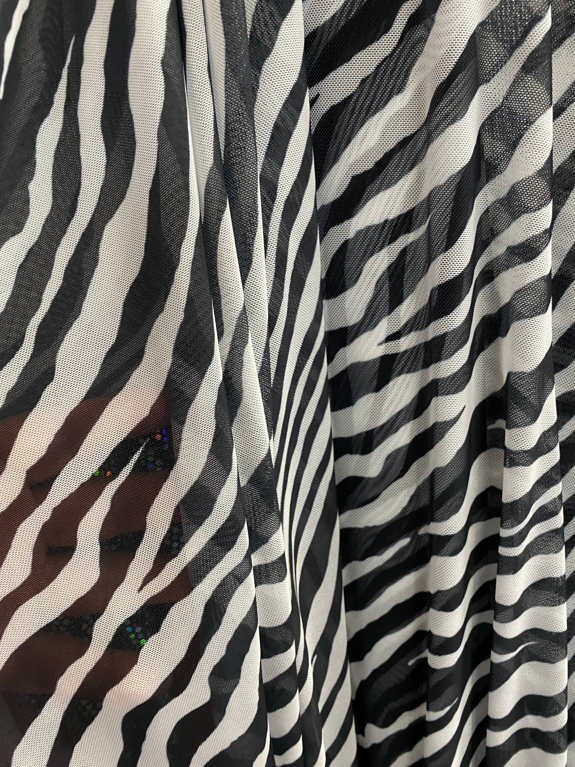 Zebra design exotic print on good quality of power mesh 4-way stretch 58/60” Sold by the YD. Ships worldwide from Los Angeles California USA